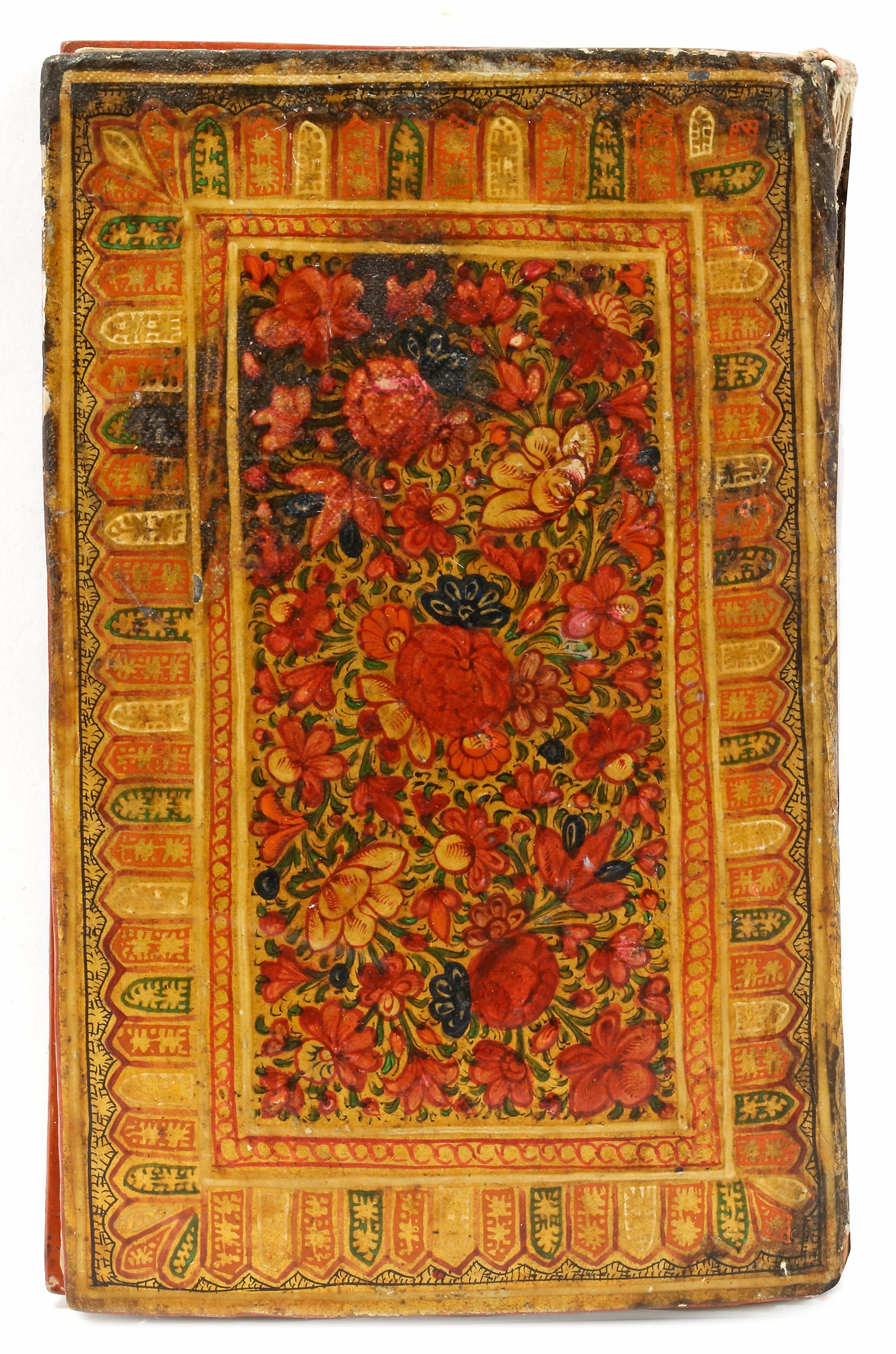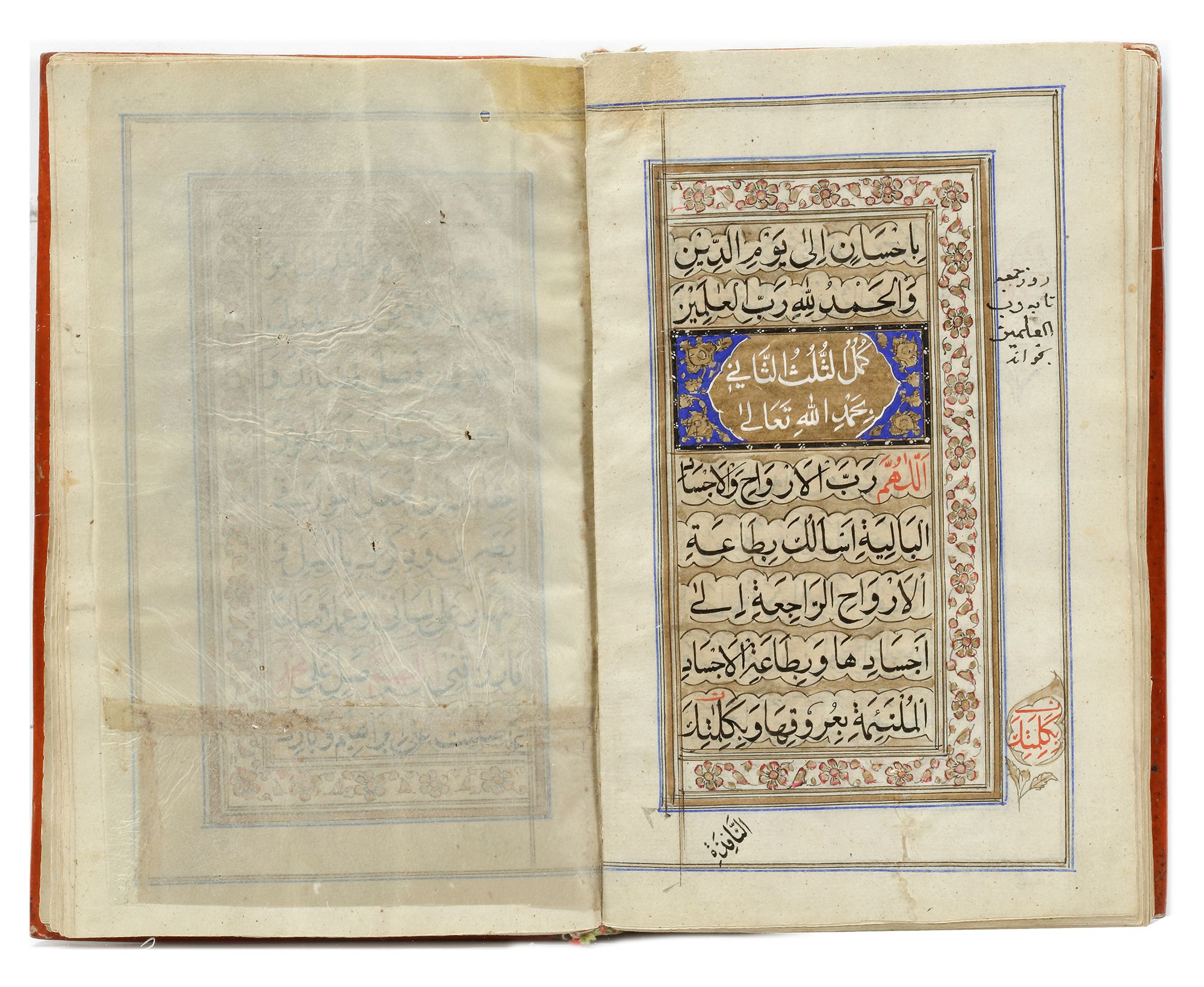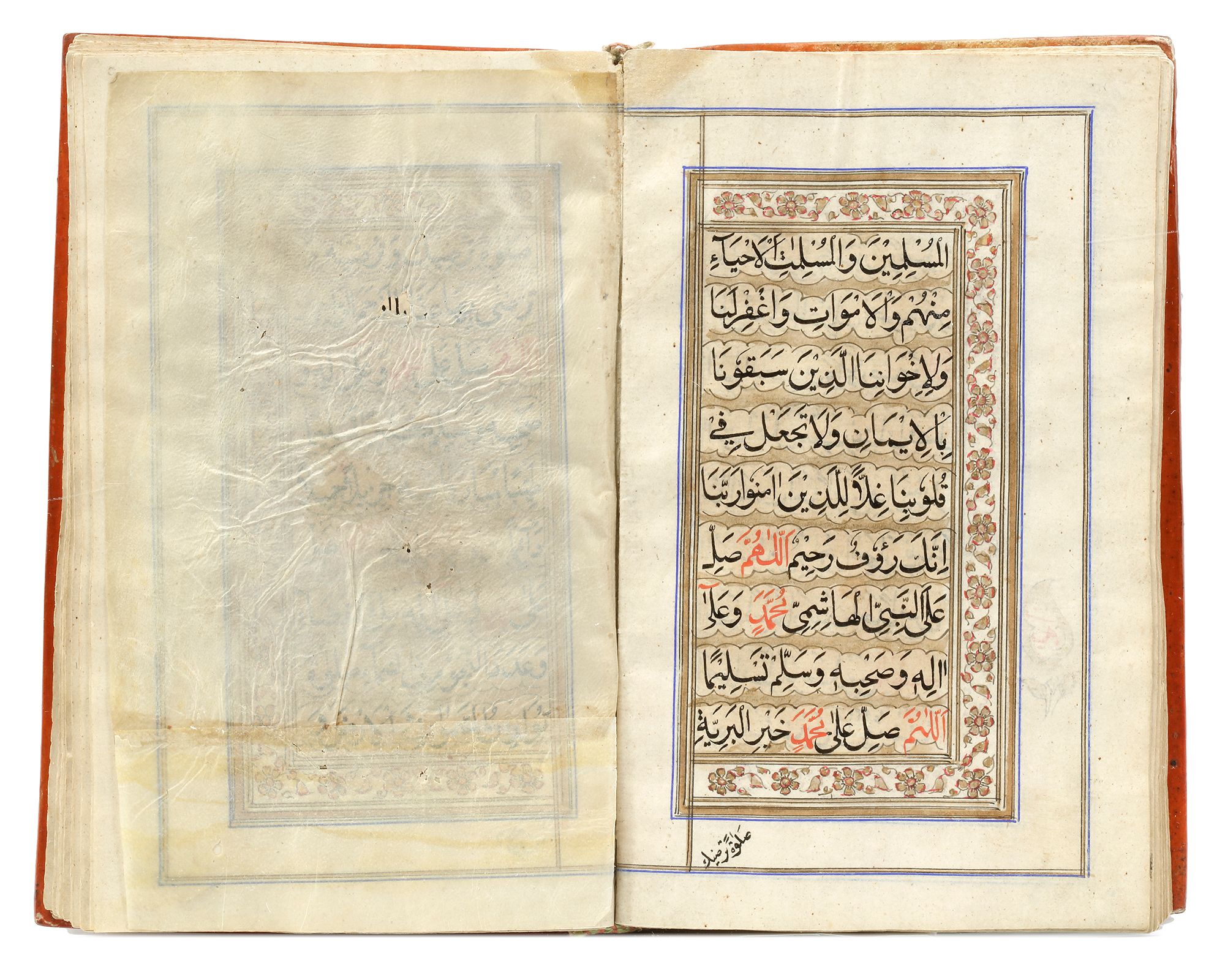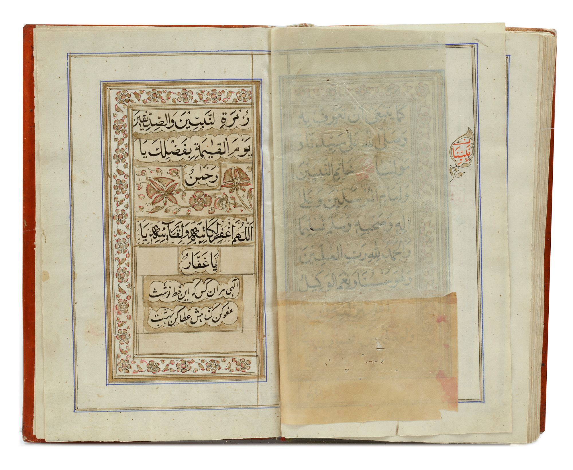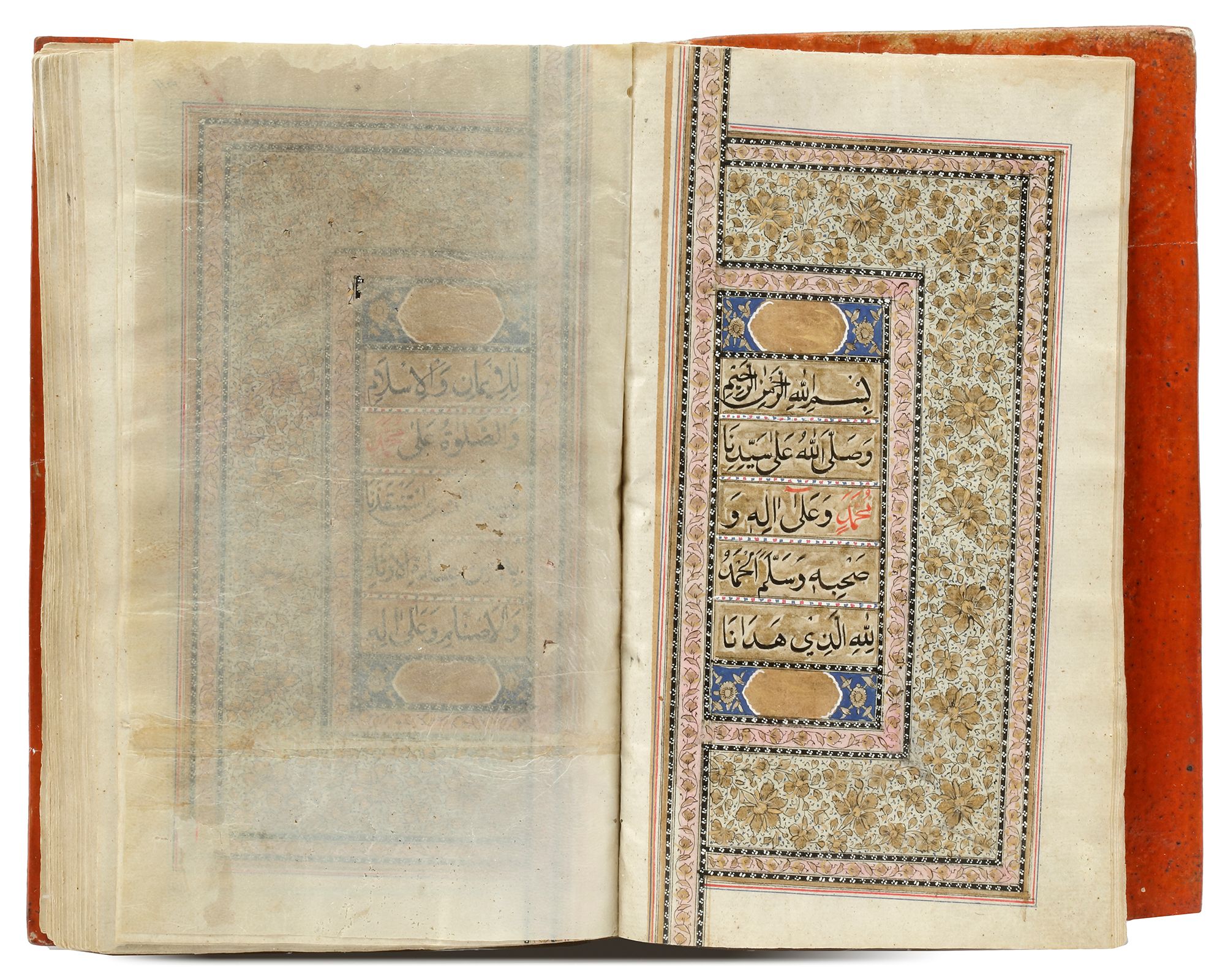 Arabic manuscript on paper, 149 leaves, 9 lines to the page written in naskhi script in black ink within stylized cloud bands on a gold ground, double inner margins ruled in blue and gold sandwiching floral motifs in gold, significant words picked out in red with further marginal commentaries in red within cloud bands, one double-page frontispiece (marking the opening of prayers preceding main text) in characteristic Kashmiri illumination in blue, gold and pink, with text on gold ground and margins filled with floral motifs in gold. A further headpiece in a similar style, several further illuminated headings throughout the text, two diagrams in colors and gold of the holy sanctuaries at Mecca and Medina, Kashmiri painted papier-mache binding in polychrome, doublures painted red, spine rebacked. 18.2 cm by 15 cm.