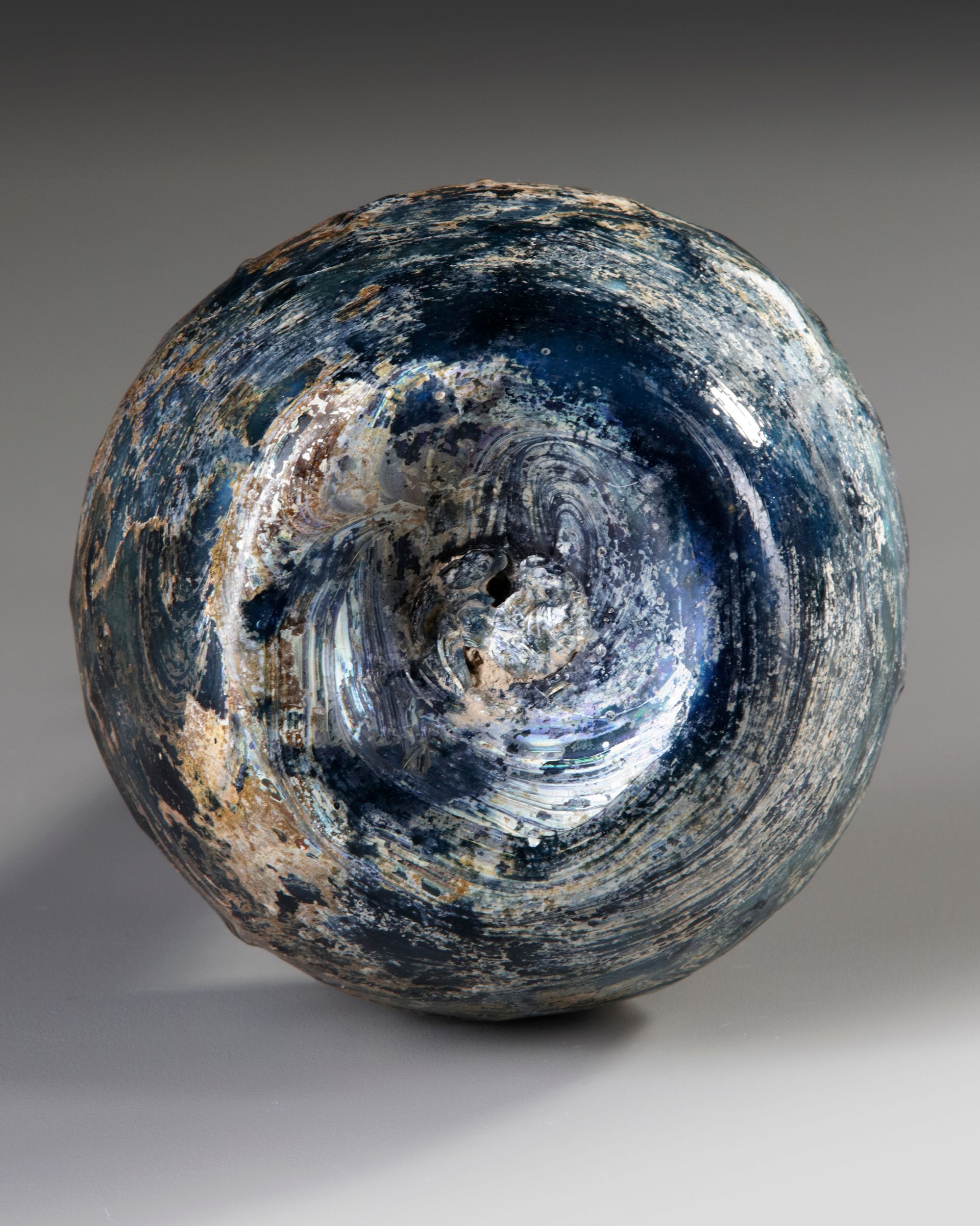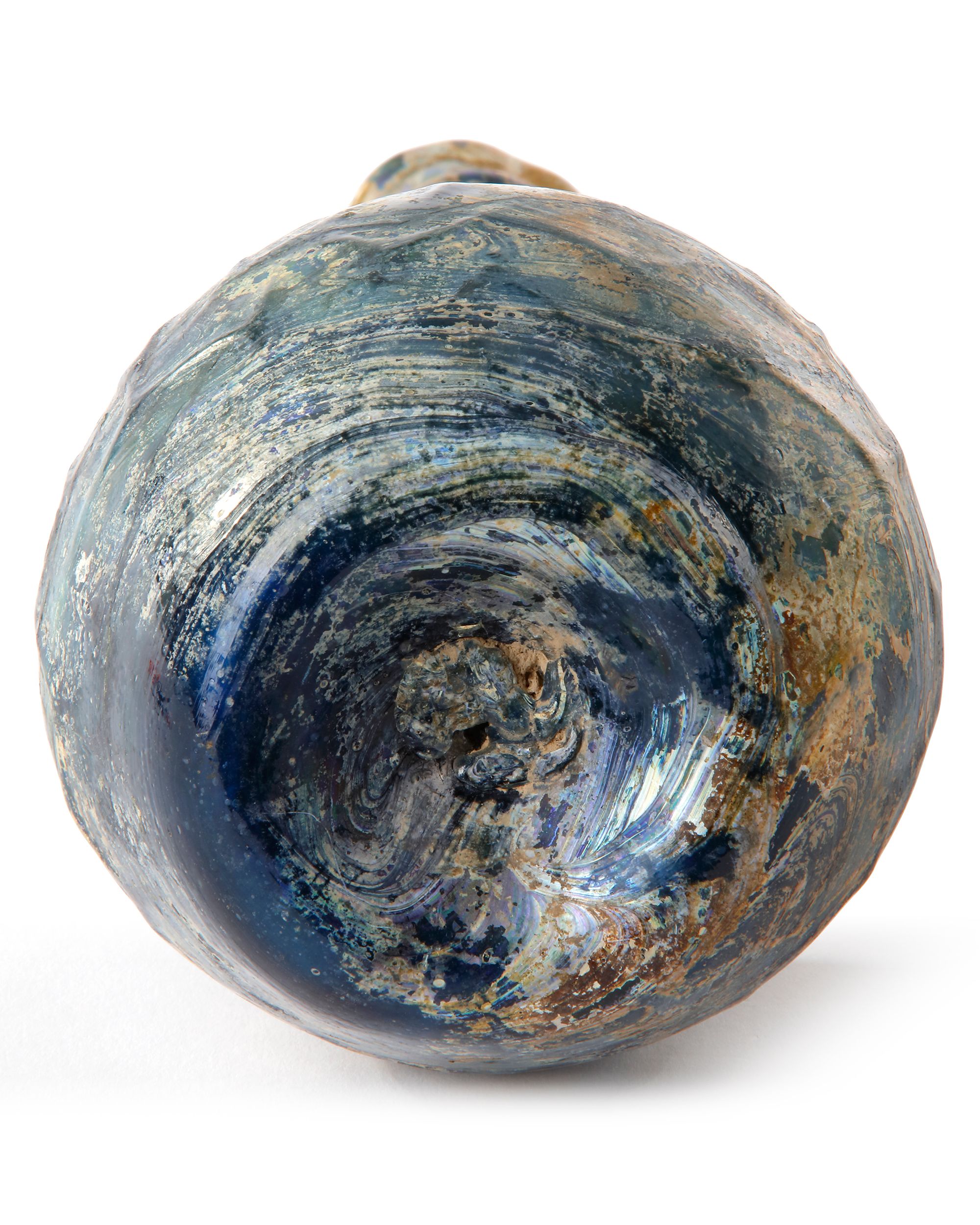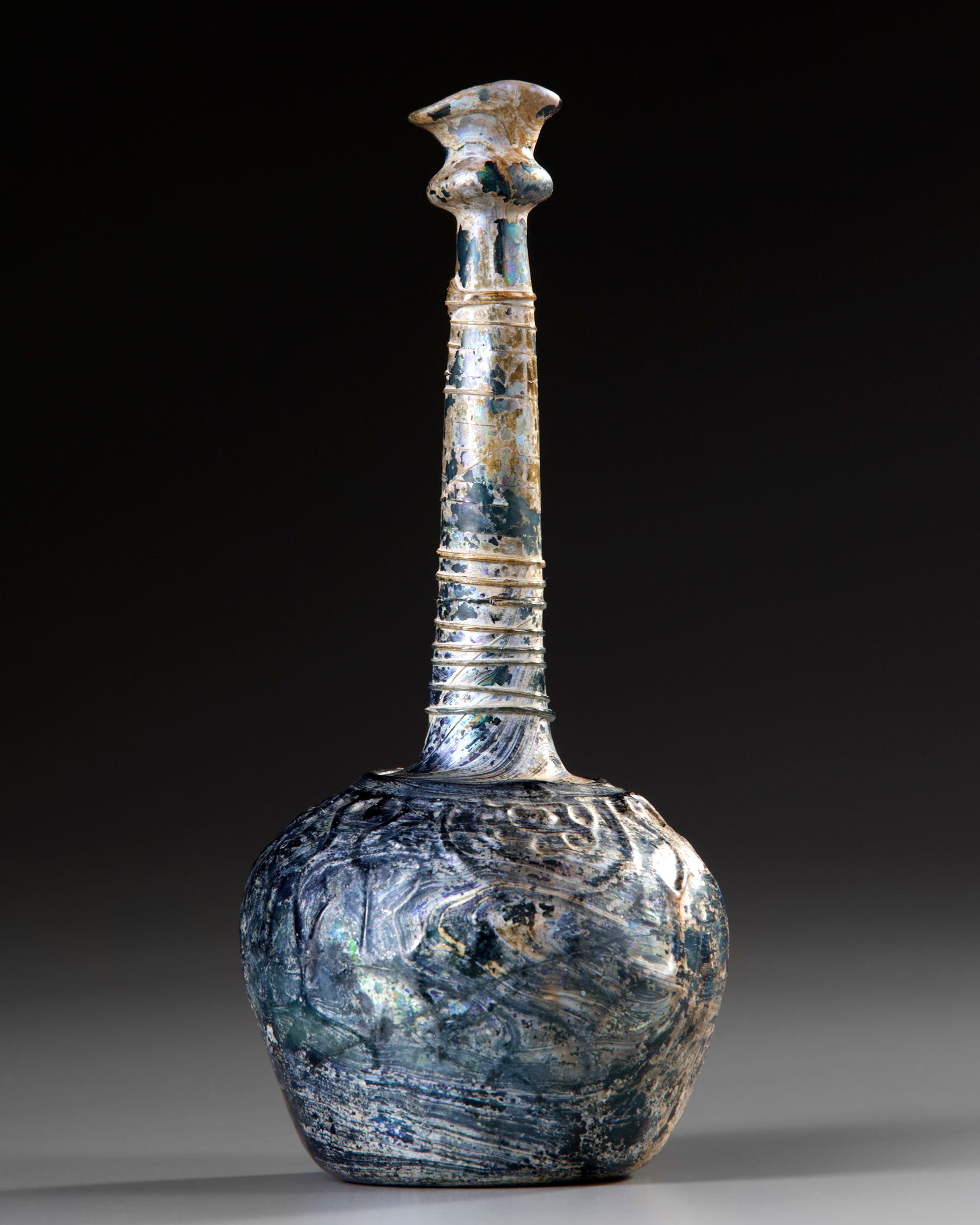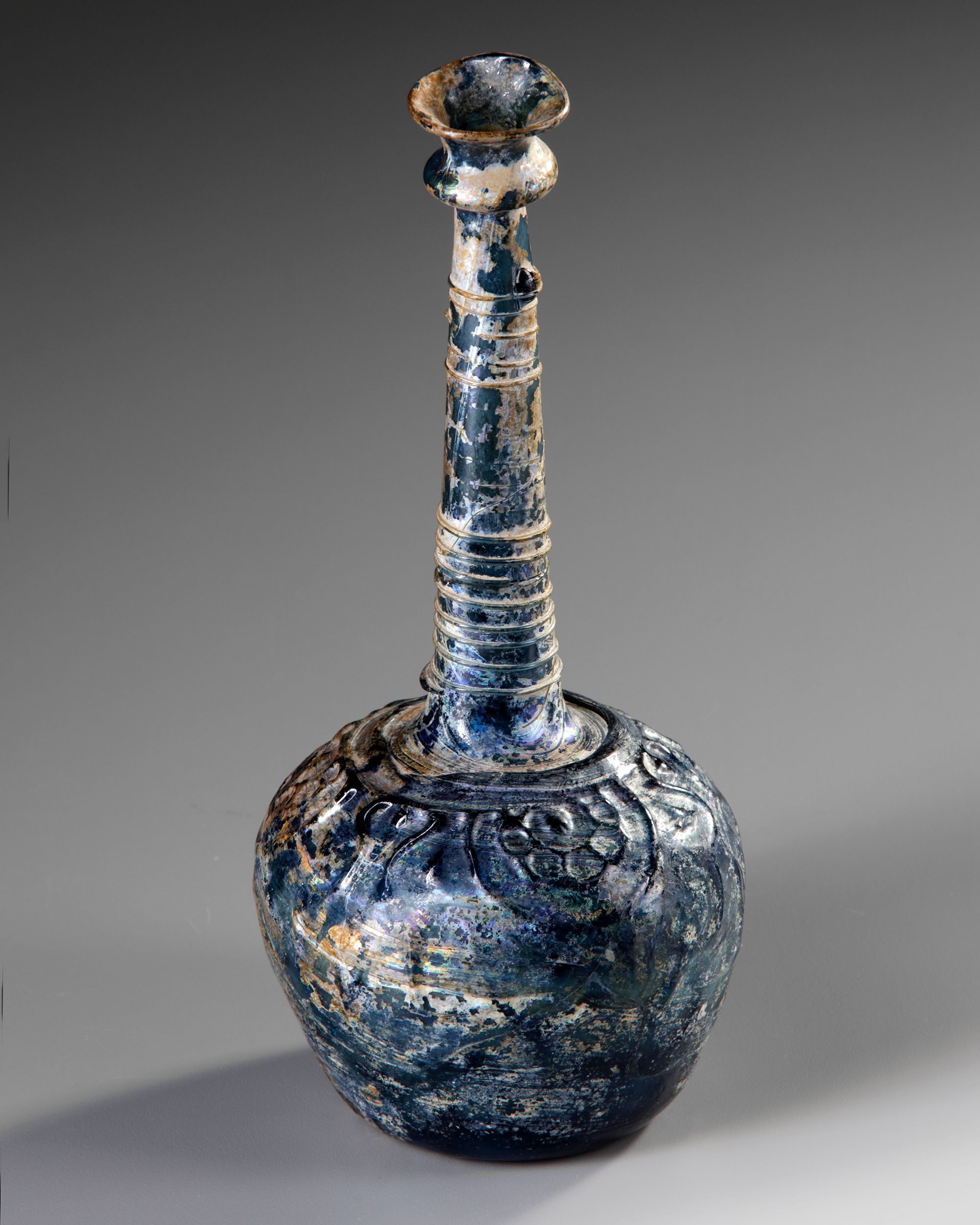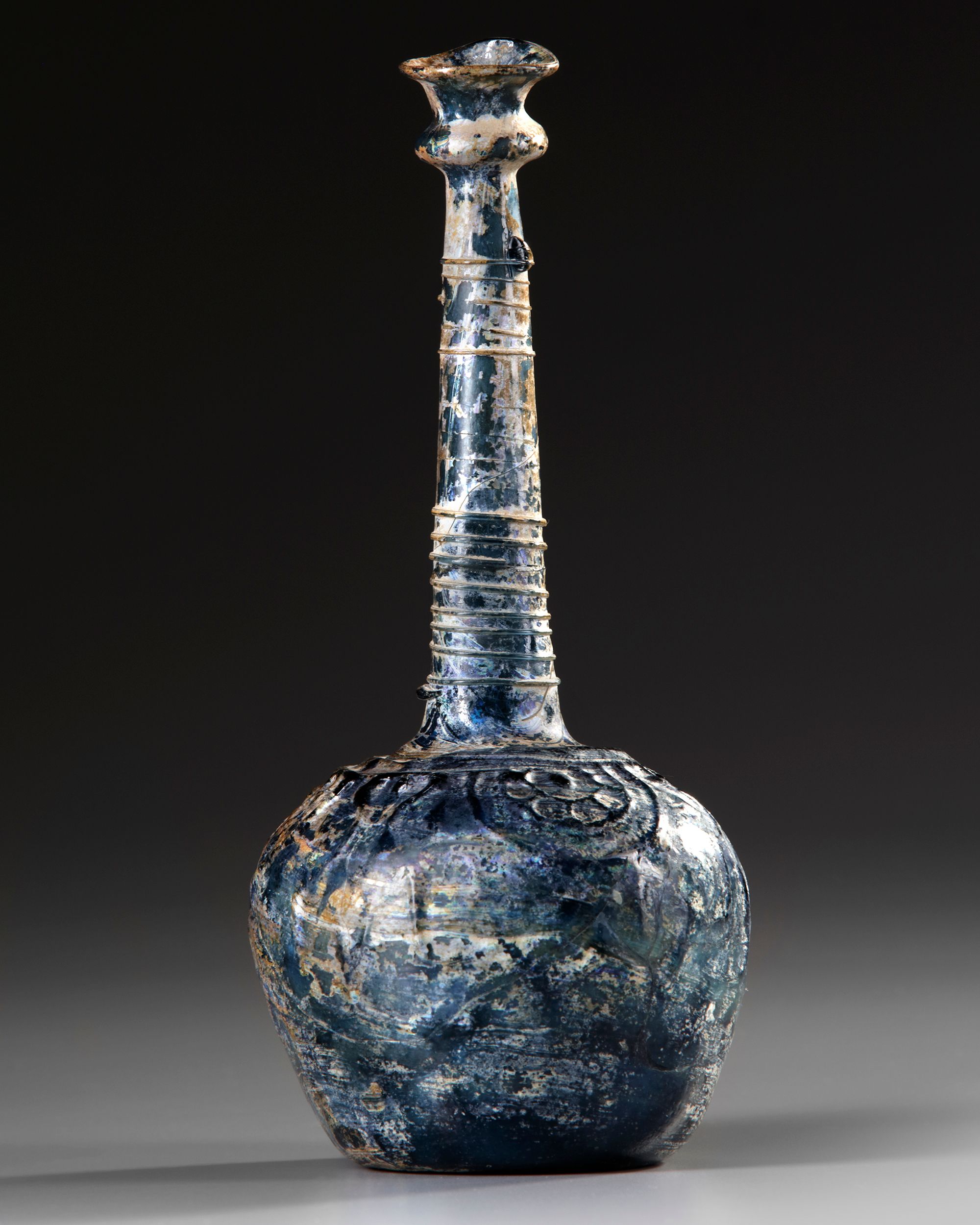 A TALL-NECKED BLUE GLASS BOTTLE, PERSIA OR SYRIA, 11TH-12TH CENTURY