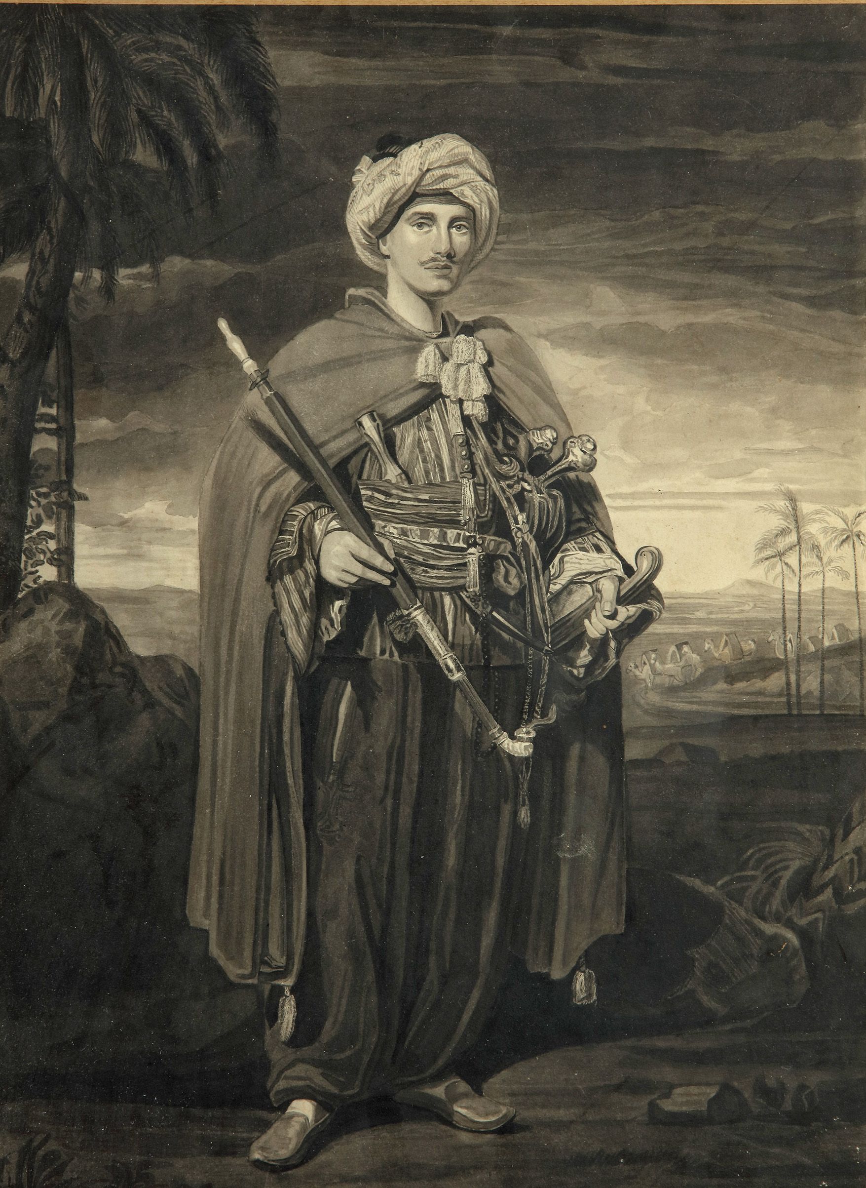 Portrait, full standing of an ottoman Turk or a western in ottoman clothes, fully armed, holding a pipe.
