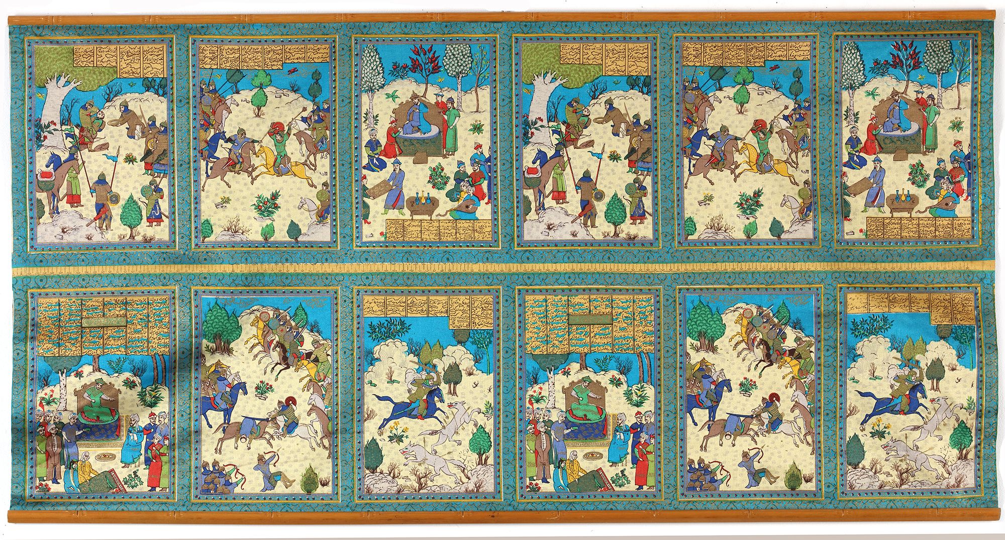 A Persian silk embroidery with various miniatures depicting various figures, mounted between two rods.