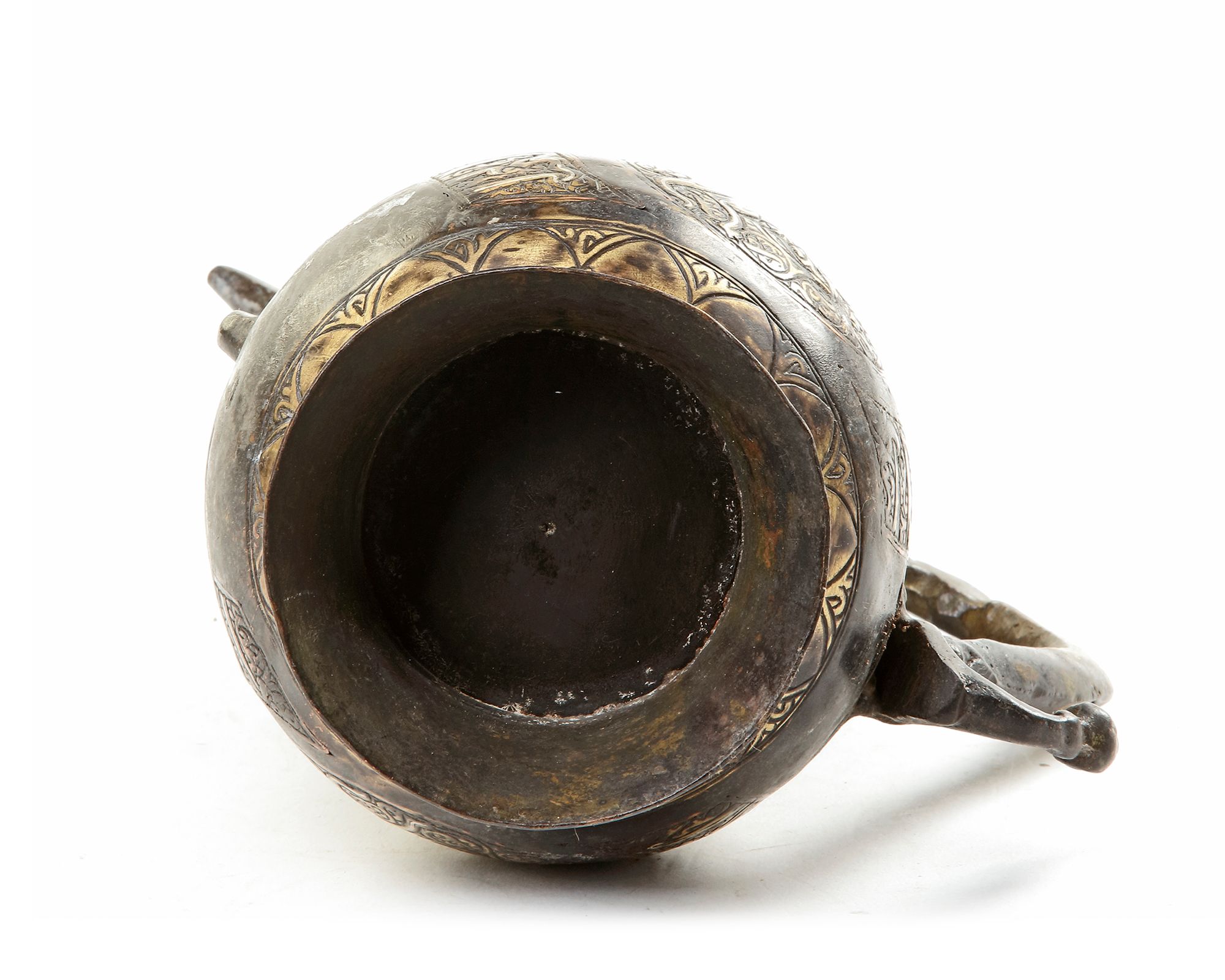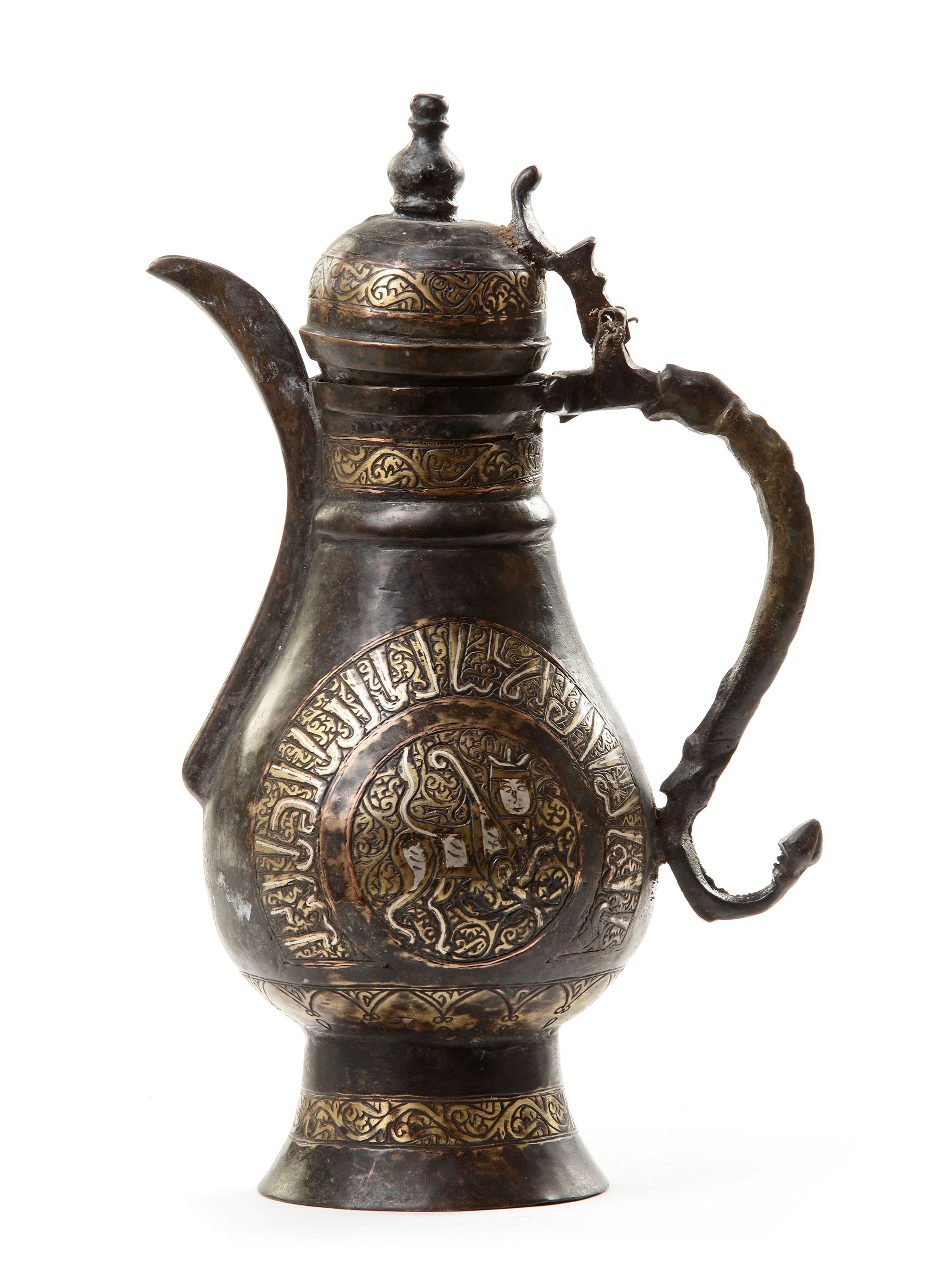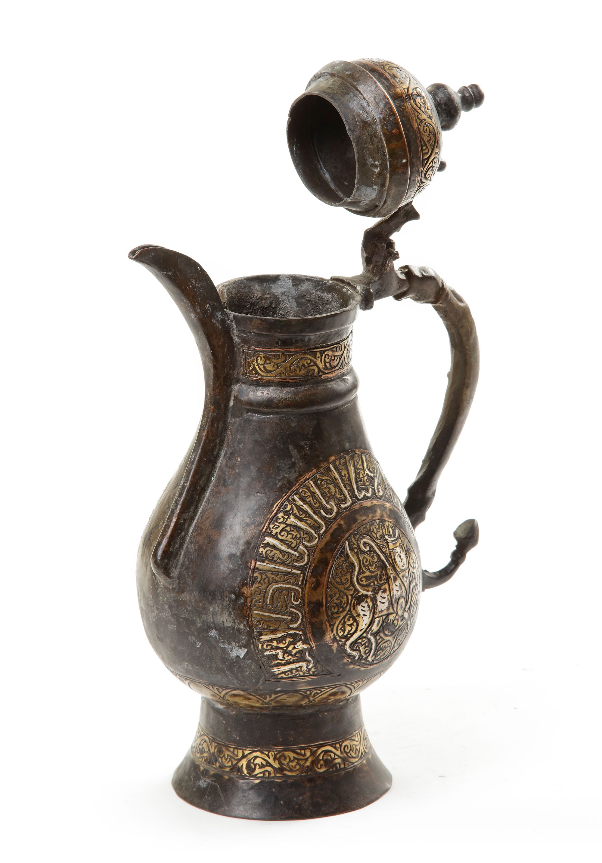 An Islamic copper ewer with a small spout, s-shaped handle and a domed cover, inlaid with silver and decorated with a mythical beast surrounded by ab and of calligraphy.
