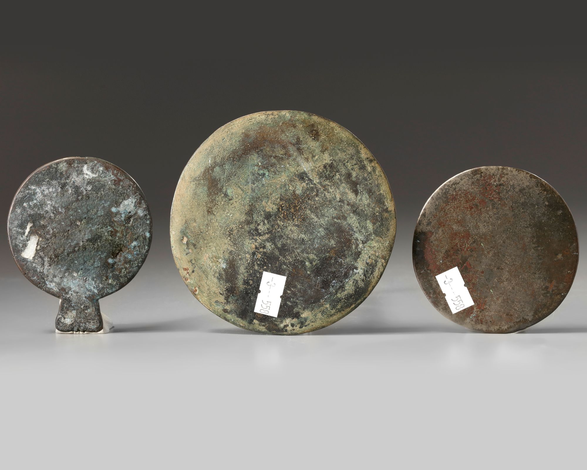 The first cast with two addorsed sphynxes among sprays of foliage within a benedictory inscription band in kufic script reading,البقاء والبهاء والرفاه والعلى والملك لصاحبه , Survival, splendor, well-being, supremacy and the kingdom for its owner; diameter 11.50 CM. The second cast with a mythical beast; diameter 7.20 CM., the third with fish around a small fluted loop; diameter 8.50 CM.