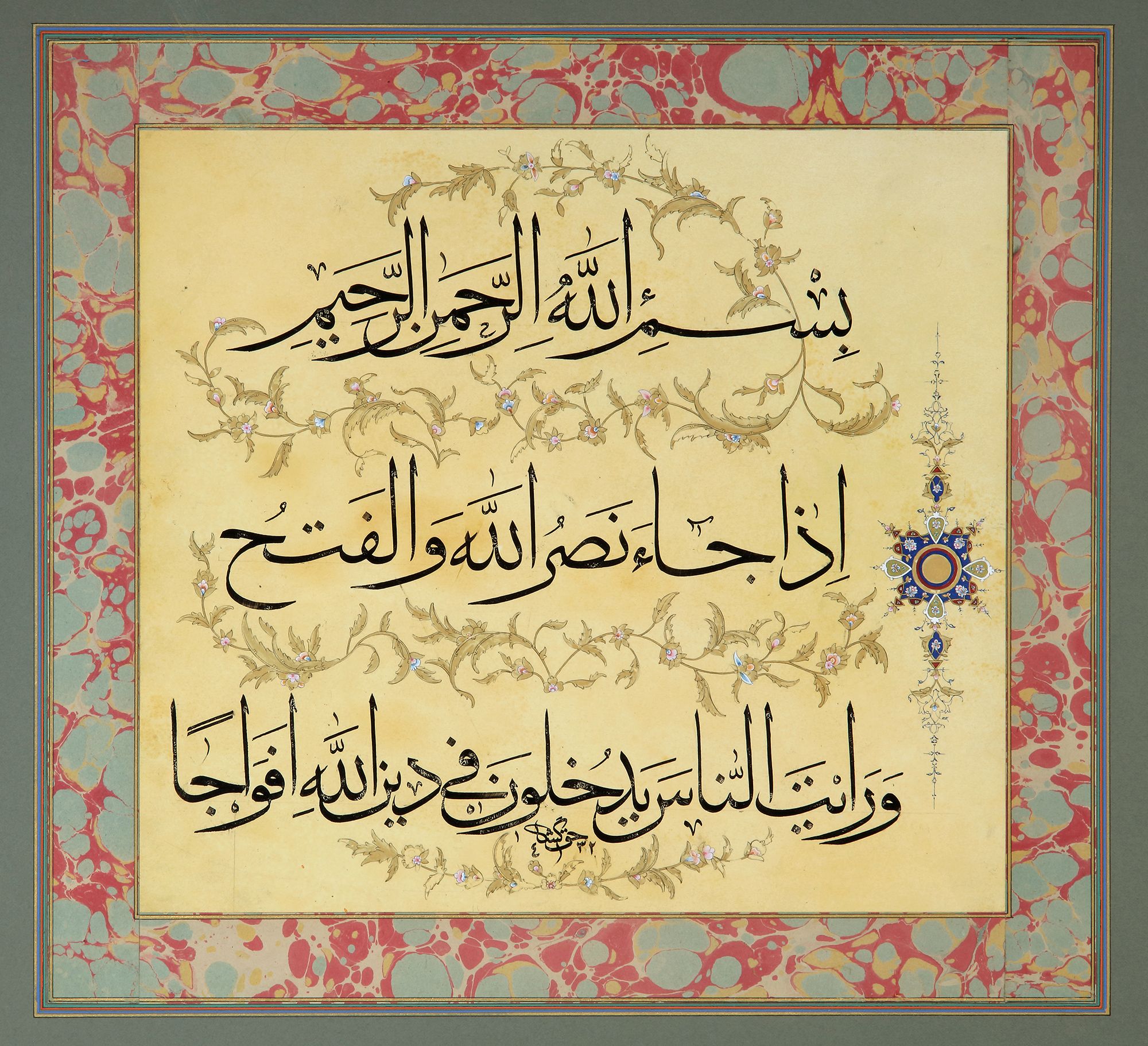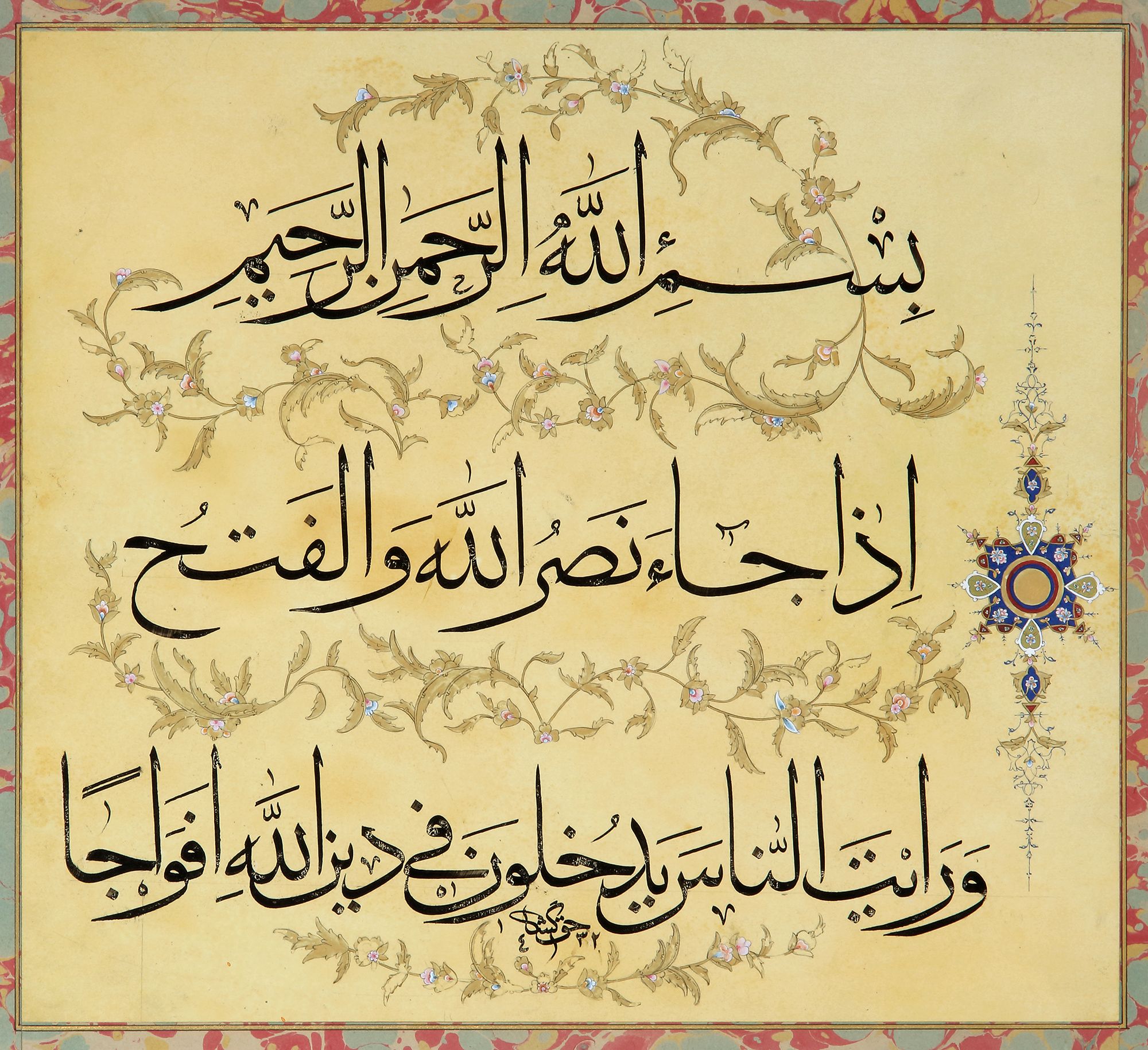 Arabic manuscript on paper, written in elegant large black naskh script of Quran 110 surah Al-Nasr or Assistance v.1 and v.2 on a yellow ground and stylised with gilt flowers and arabesque, with gilt and polychrome borders. 50 by 63 cm.