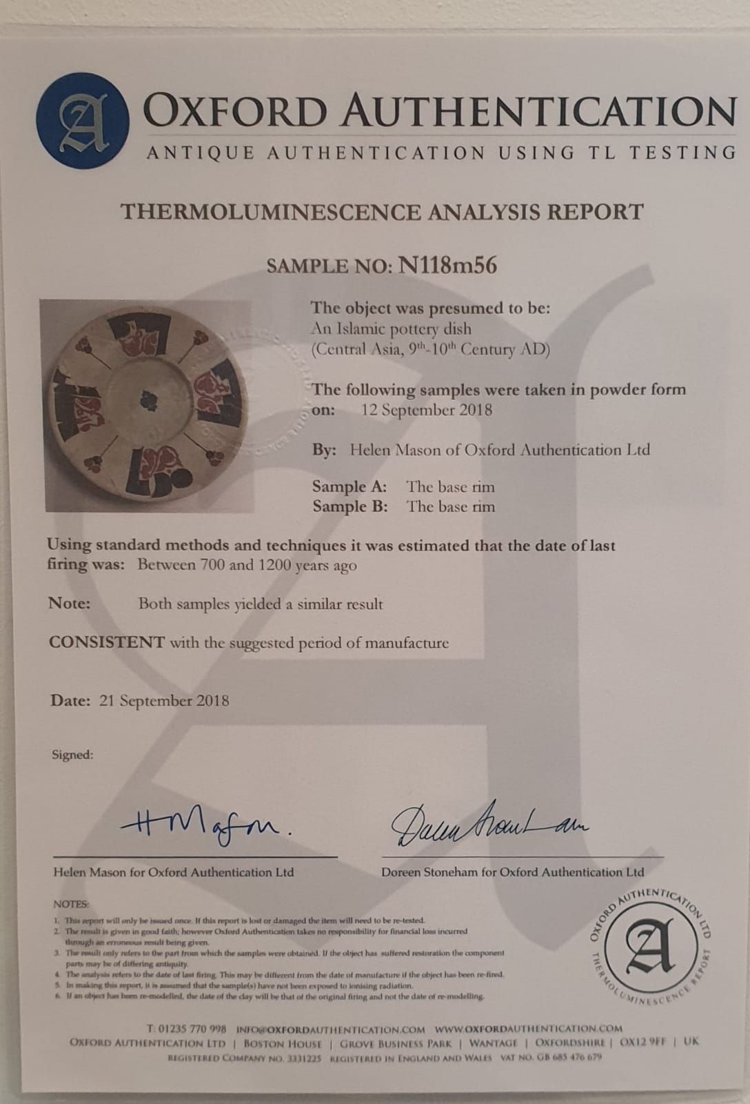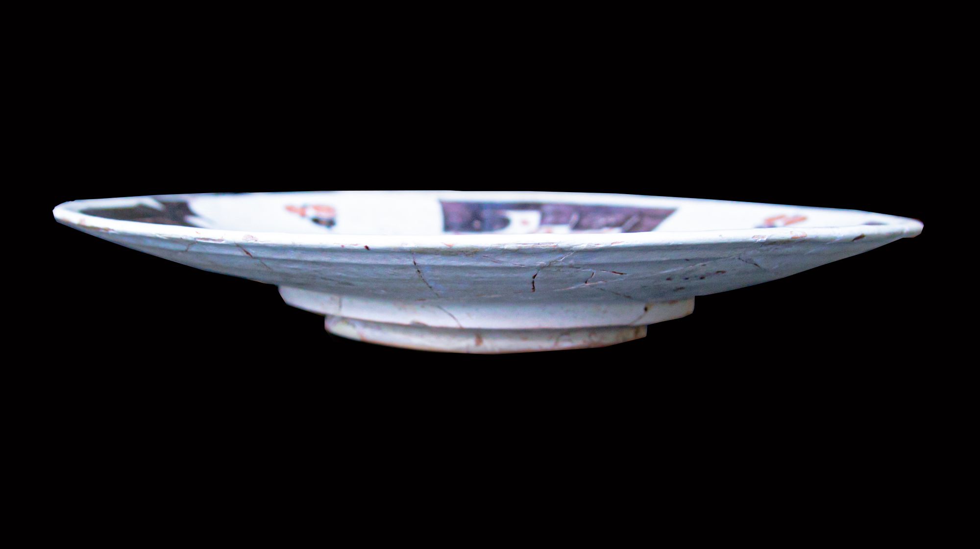 Shallow with wide rim on short foot, earthenware decorated in white slip with dark brown and red designs under a transparent glaze 34 cm. diam. Oxford Authentication Ltd. thermoluminescence test no. N118m56 is consistent with the dating of this lot.