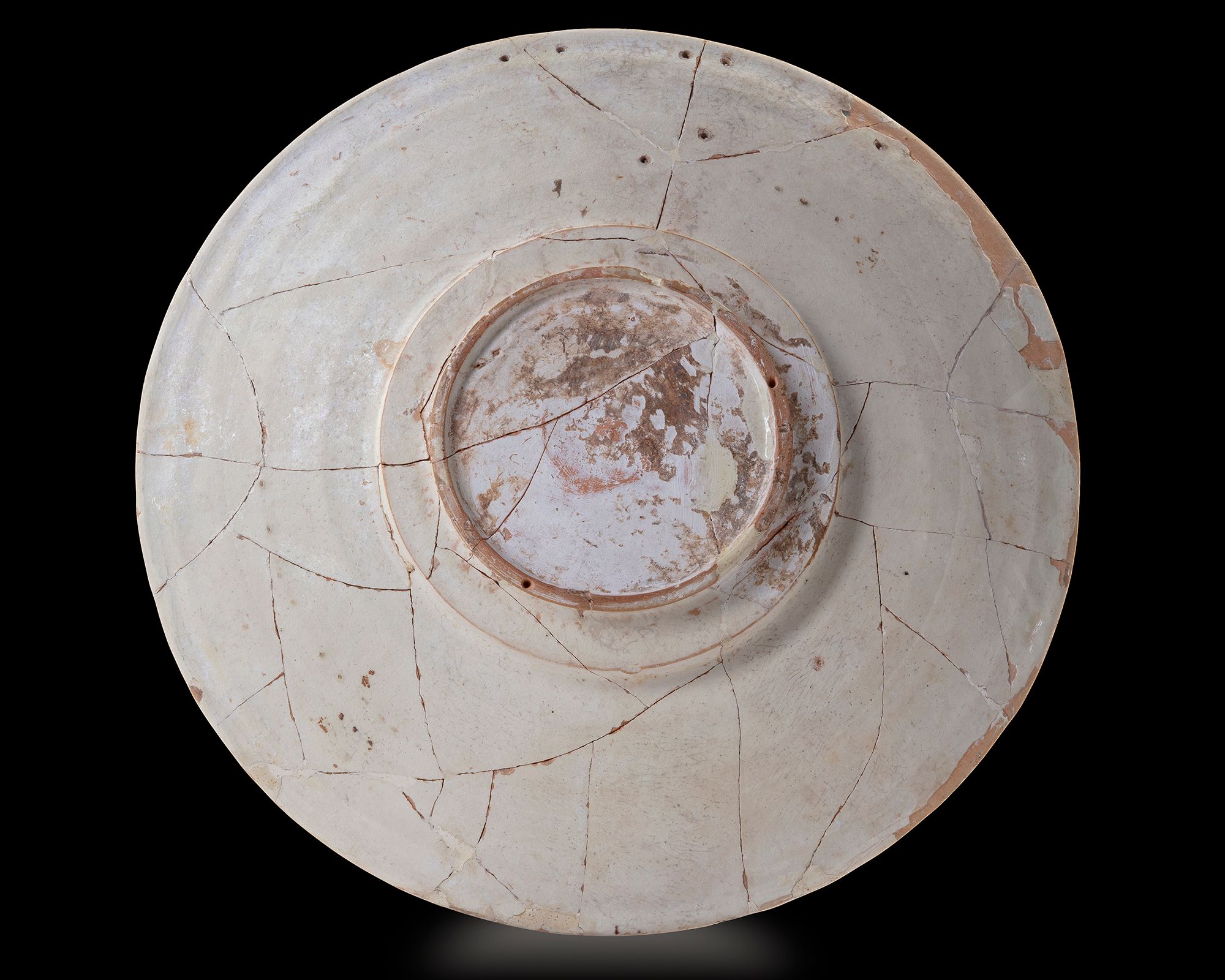 The inscriptions were always in Arabic though Persian was the lingua franca of both Nishapur and Samarqand. Simple, elegant radial designs punctuate the inscription. Unlike some slip-painted wares (like Cat. Ga.1 of the al-Sabah Collection) which have individual letters in red to create a visual rhythm to the inscription, this dish uses radial medallions in black and red to split the text into quadrants. ‘The black is used almost exclusively for the Kufic inscriptions’. The completeness of this dish is one aspect of its beauty. Most of excavations in the 1930s and 1940s that revealed these slip-painted wares found copious sherds or wasters.