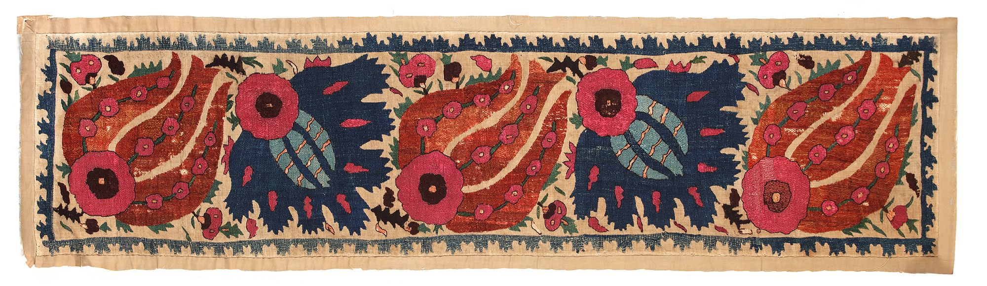 A bolster cover, probably part of a set of bed furnishings in the same pattern. A perfect example of the alternating pattern style, a long-petalled tulip and a fringed carnation are connected with a small leaf; both flowers are filled with a stylised circular filling flower at the base and with small flowers and stripes in the petals. The border is called the mountain border, deriving from a Chinese original. Floss silk couching on linen. The brocade 39.00 CM x 159.00 CM, which is stitched on a linen surface total measurements are 46.00 CM x 165.00 CM.