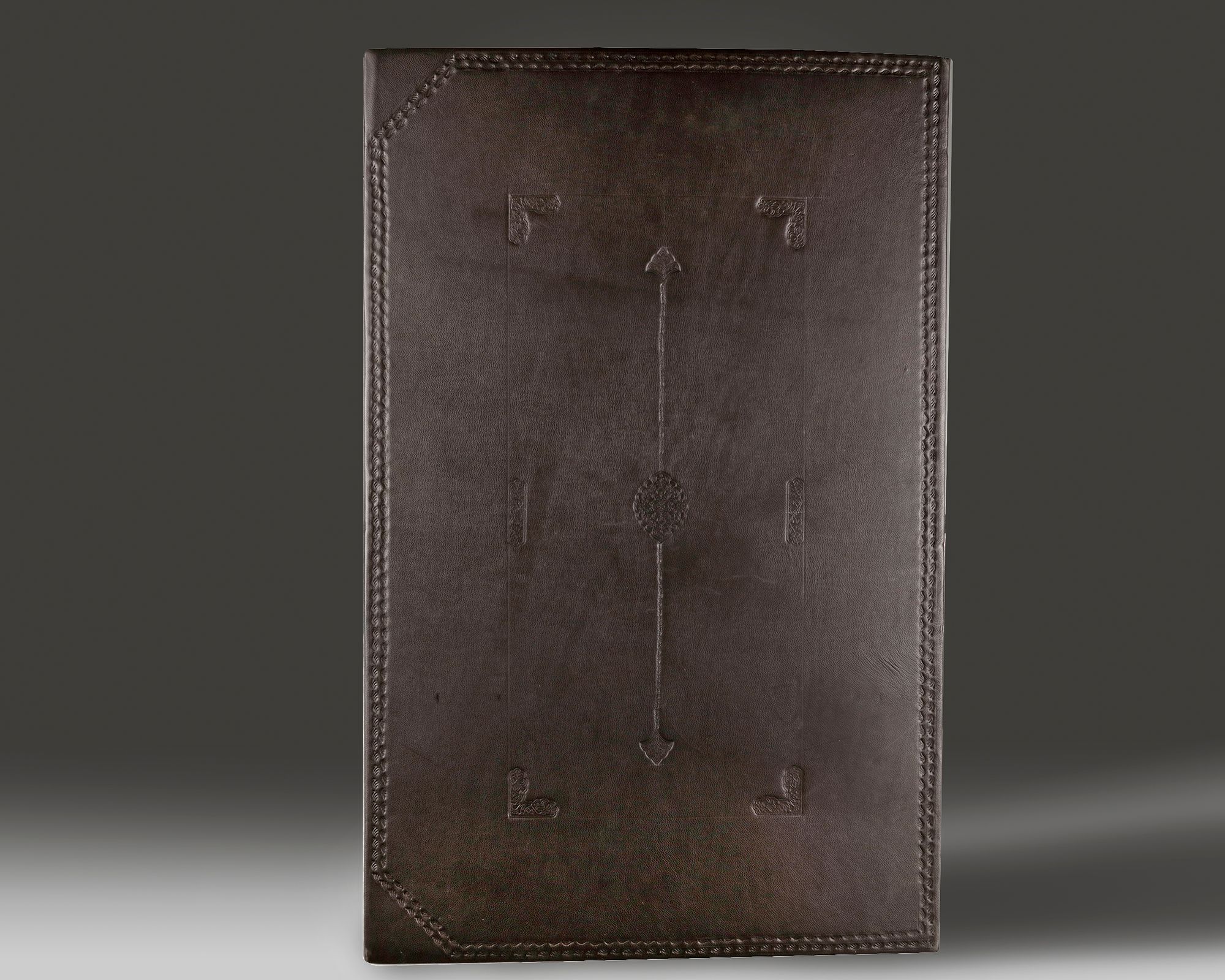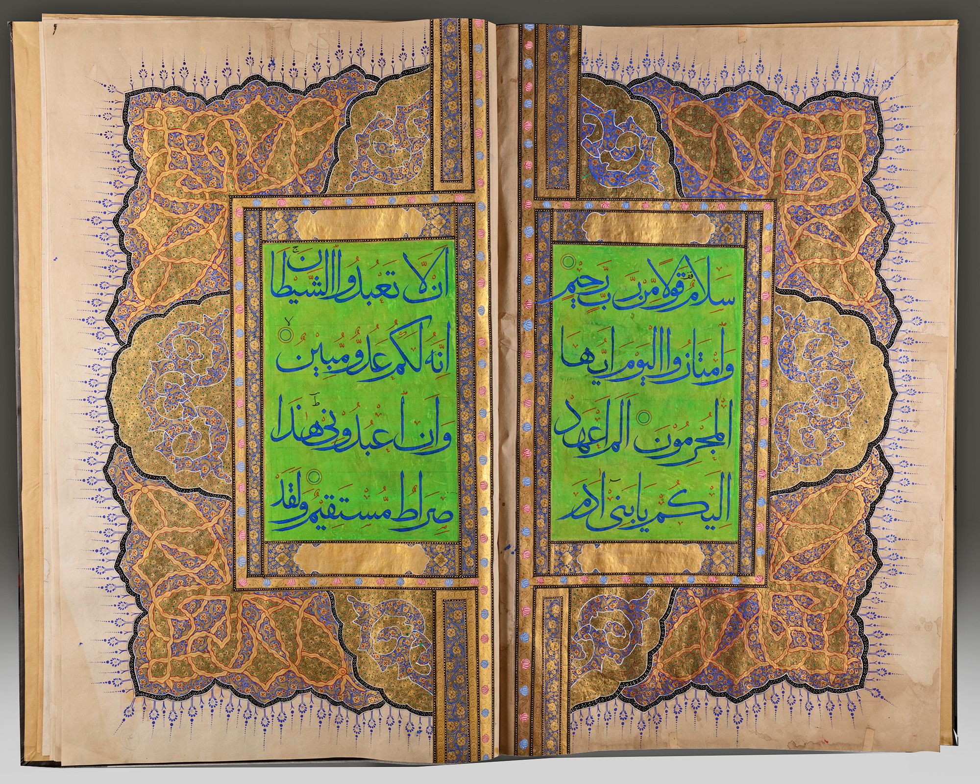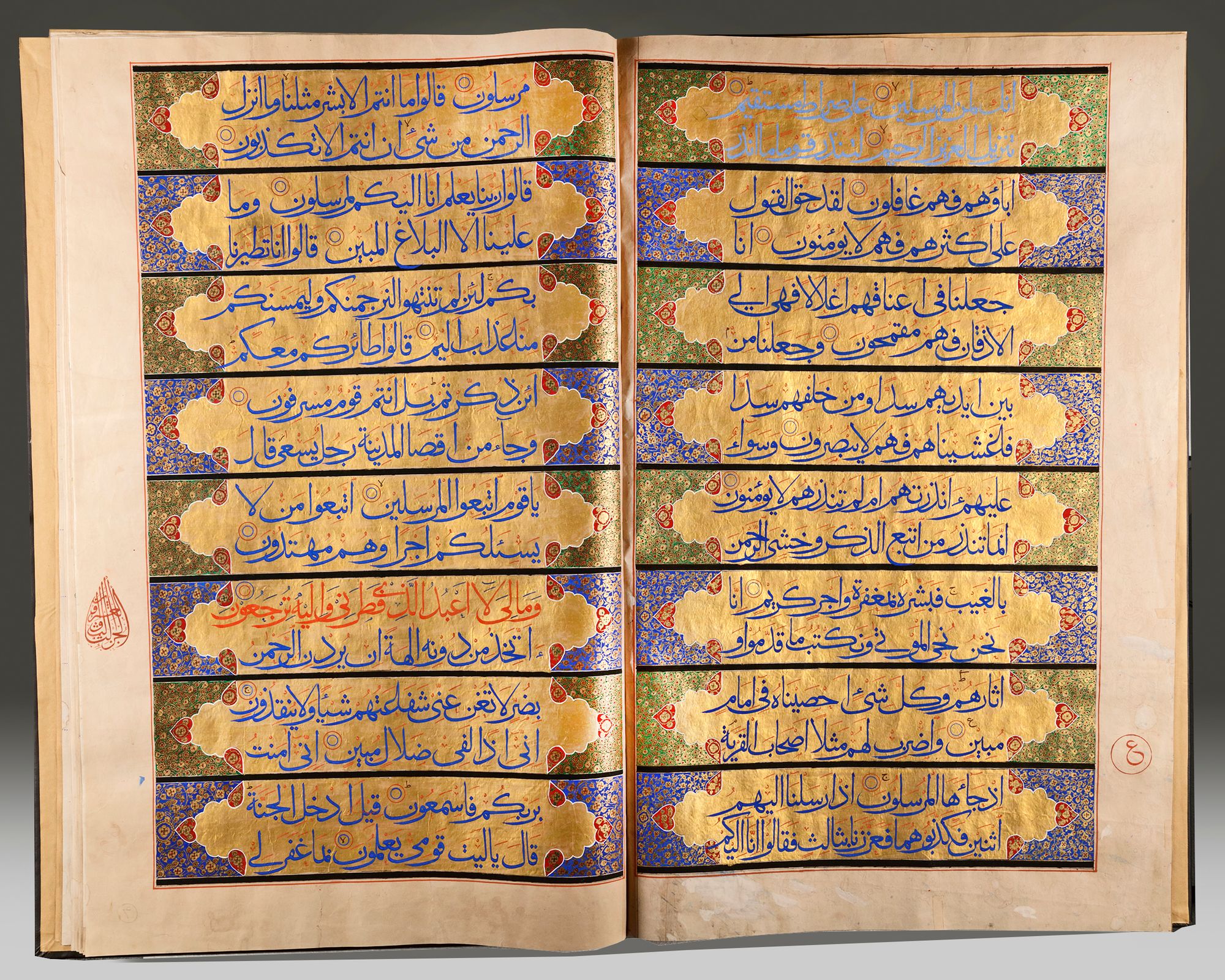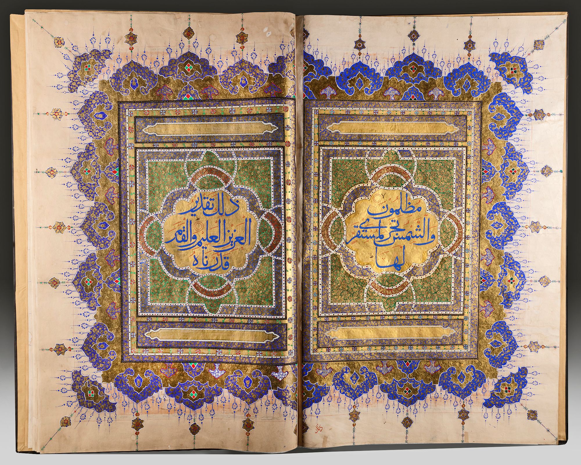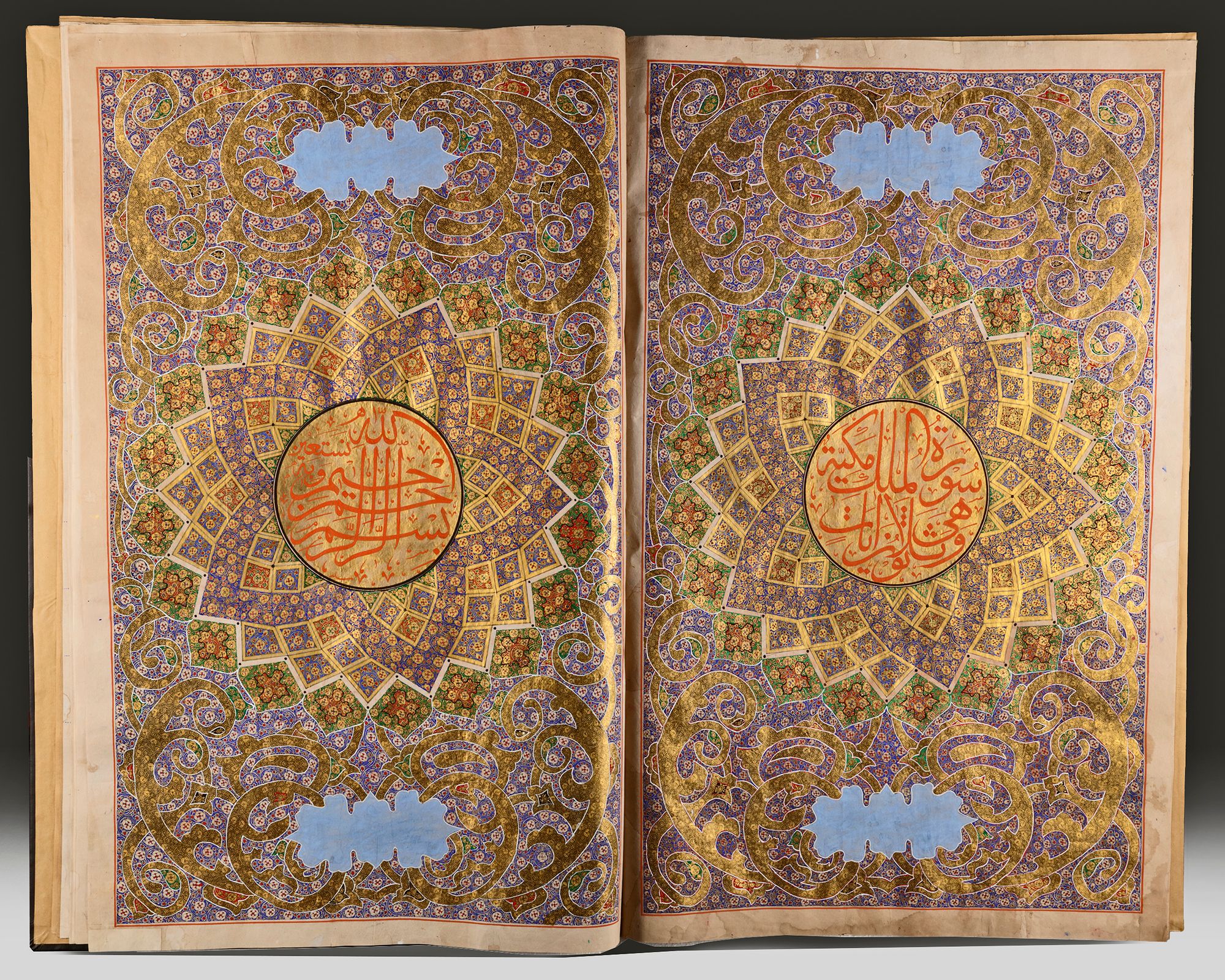 An exceptional large leather-bound collection of Islamic transcripts, each folio decorated with a different kind of an Arabic calligraphy (Quran suras, names of Allah and religous texts), all gilt and in naskh script on gilt grounds.