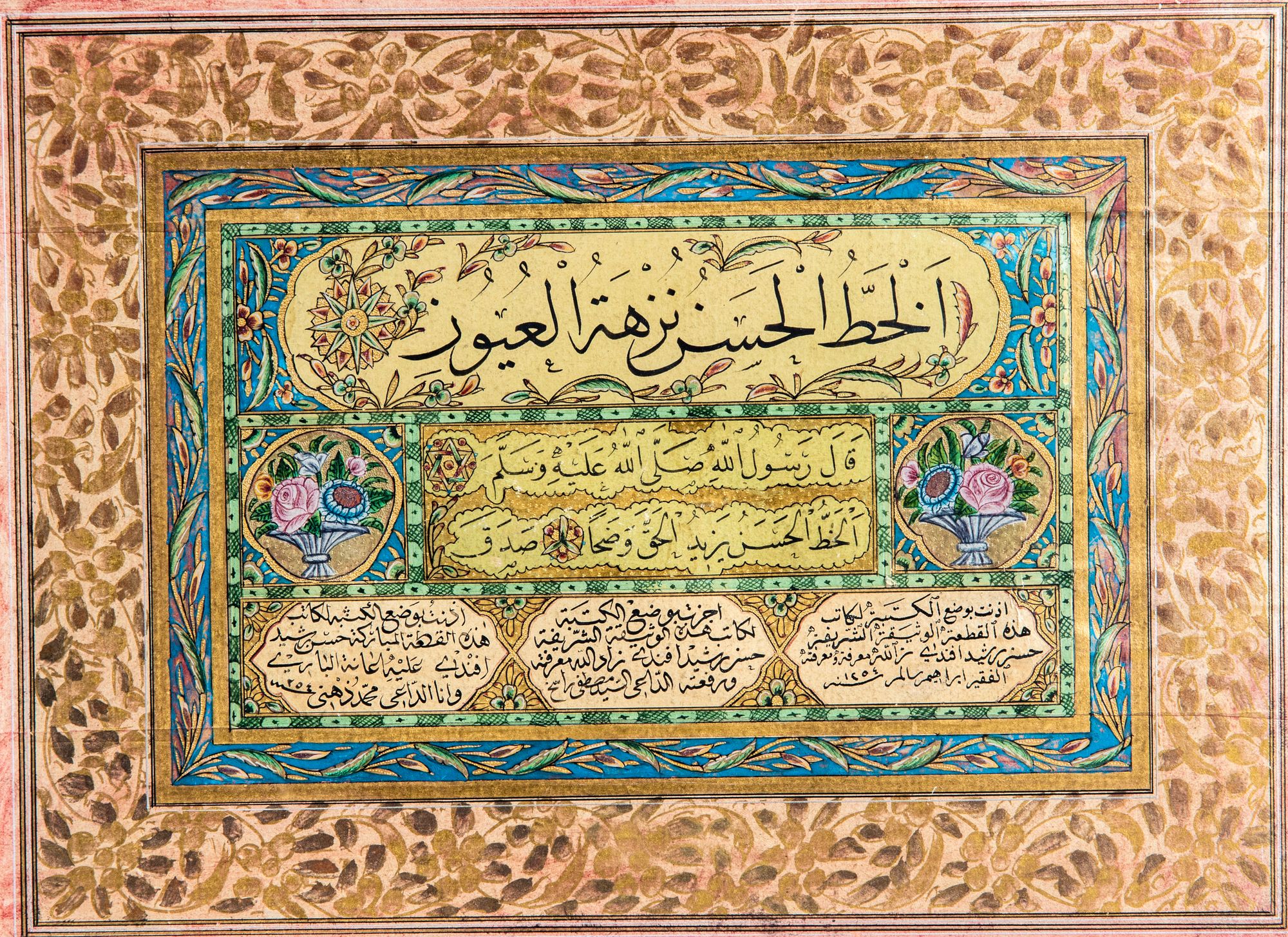 An illuminated calligrapher's diploma (ijazet), signed by Husain Rashid Effendi, and witnessed by Ibrahim Salem, Mustafa Rasekh and Muhammad Zuhni Ottoman Turkey, dated twice AH 1254/AD 1838-39 Arabic manuscript on paper laid down on card, text written in one line of thuluth script in black ink within a cartouche on a light green ground, above two lines of smaller naskhi script on the same ground and within gold cloudbands, flanked by stylised floral vases, three cartouches below this with calligraphers' details, all within a rectangular panel richly decorated with stylised floral motifs and serrated leaves in colours and gold, ruled margins and outer border in colours and gold.
