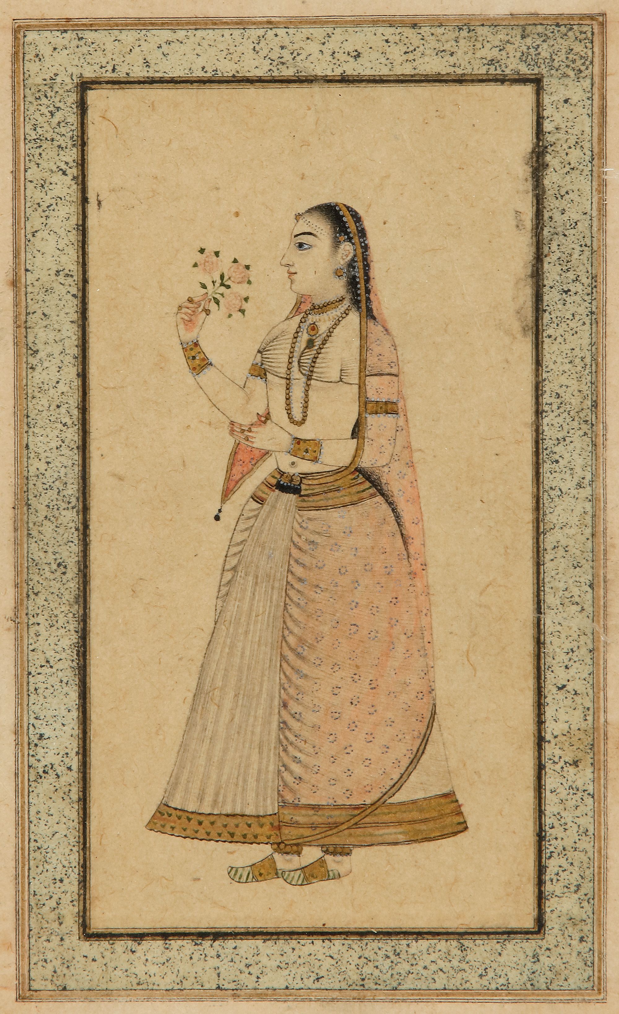 Gouache and gold painting on paper, a lady holding flowers in right hand and wearing a pleated skirt, gaghra, and a transparent choli bodice on a cream colored ground. Framed and glazed.