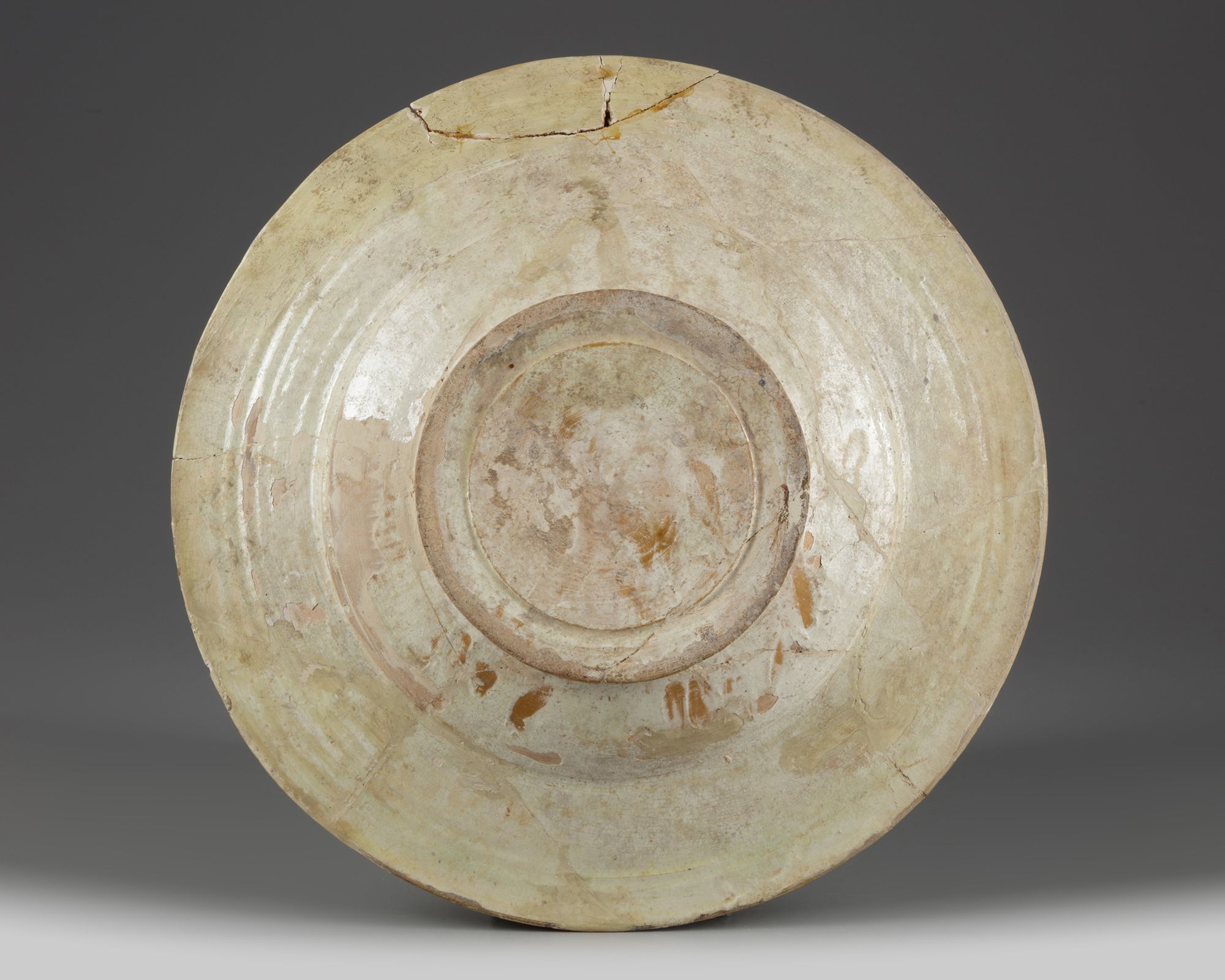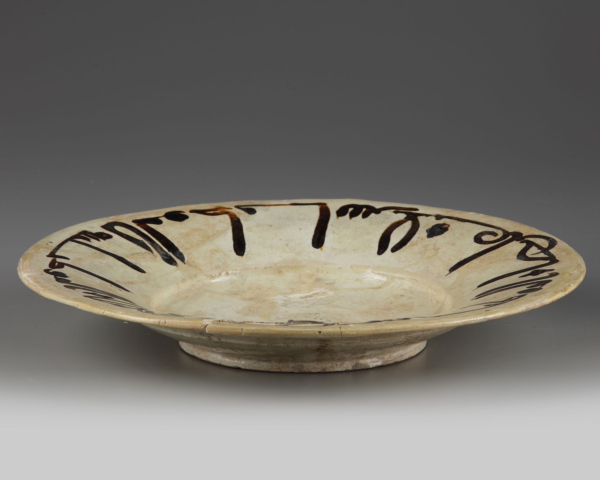 A slip-painted calligraphic pottery dish. Persia, 10th century. Of shallow form on a short foot with wide slightly flaring rim, decorated in manganese on a cream ground with a band of undeciphered inscription to the rim, a circle motif to the centre of the well.