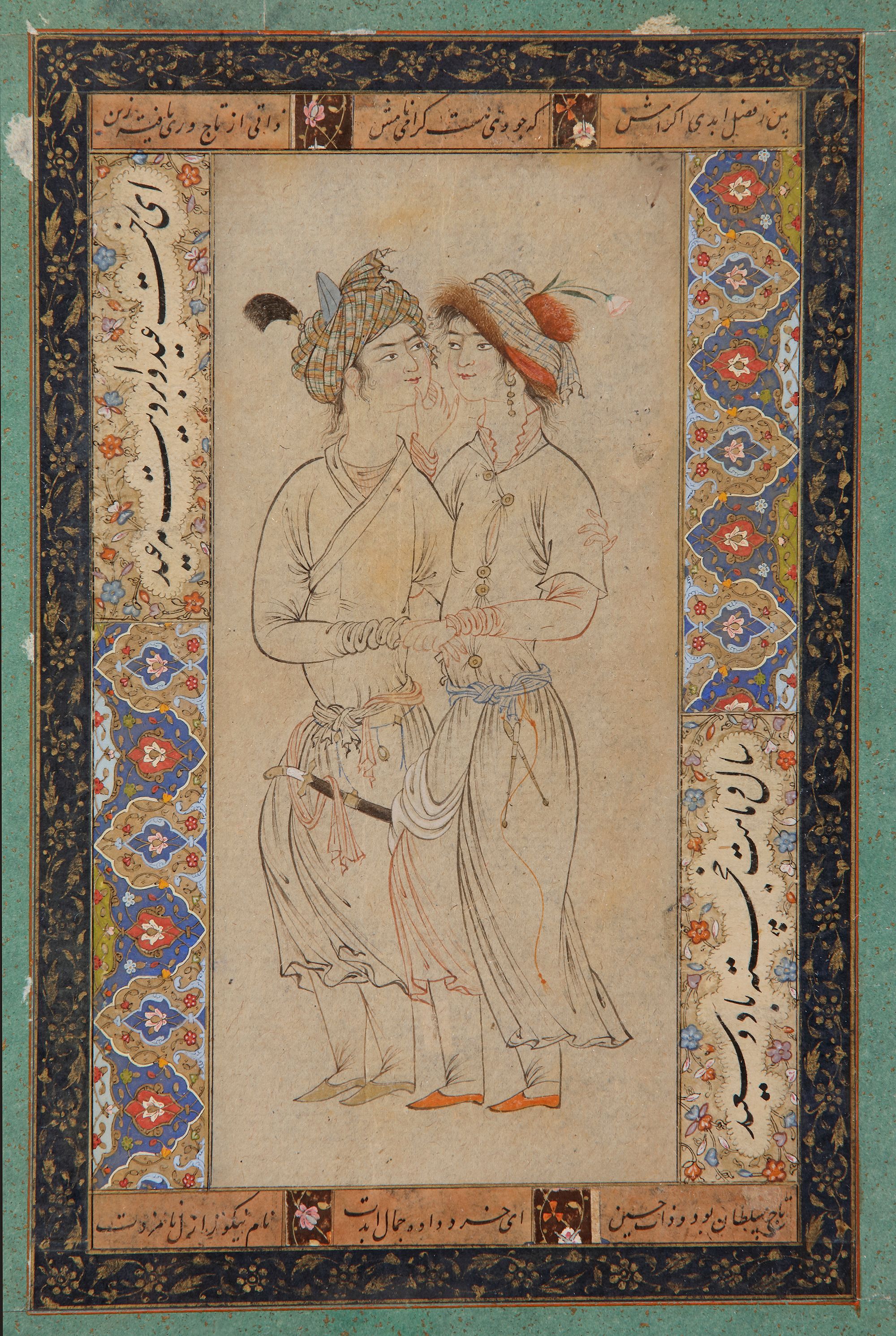Gouache heightened with gold on paper, laid down on an album page, depicting a standing loving couple, surrounded by a border with gilt floral sprays and Persian inscriptions in black nastaliq script. Laid within a dark blue border with illuminated floral sprays, green and gilt borders. Painting: 18 by 26 cm.