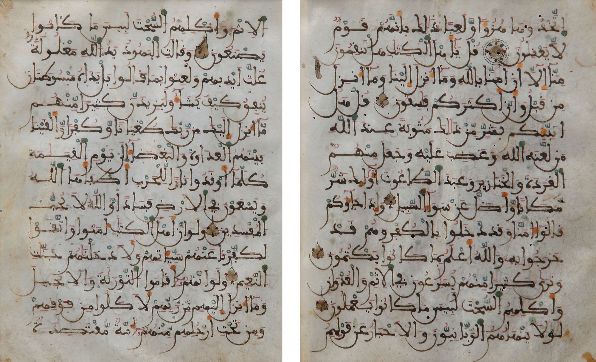 An Arabic manuscript on paper, 2 leaves with 13 lines of fine sepia Kufic script in brown ink with diacritics and vowel points in blue and red, the end of each verse marked with eight dots arranged within a circle. Quran 50 surah Al-Ma’idah, ‘the Table,’ from v.54-v.68. Framed and glazed. Each folio: 15 by 13 cm.