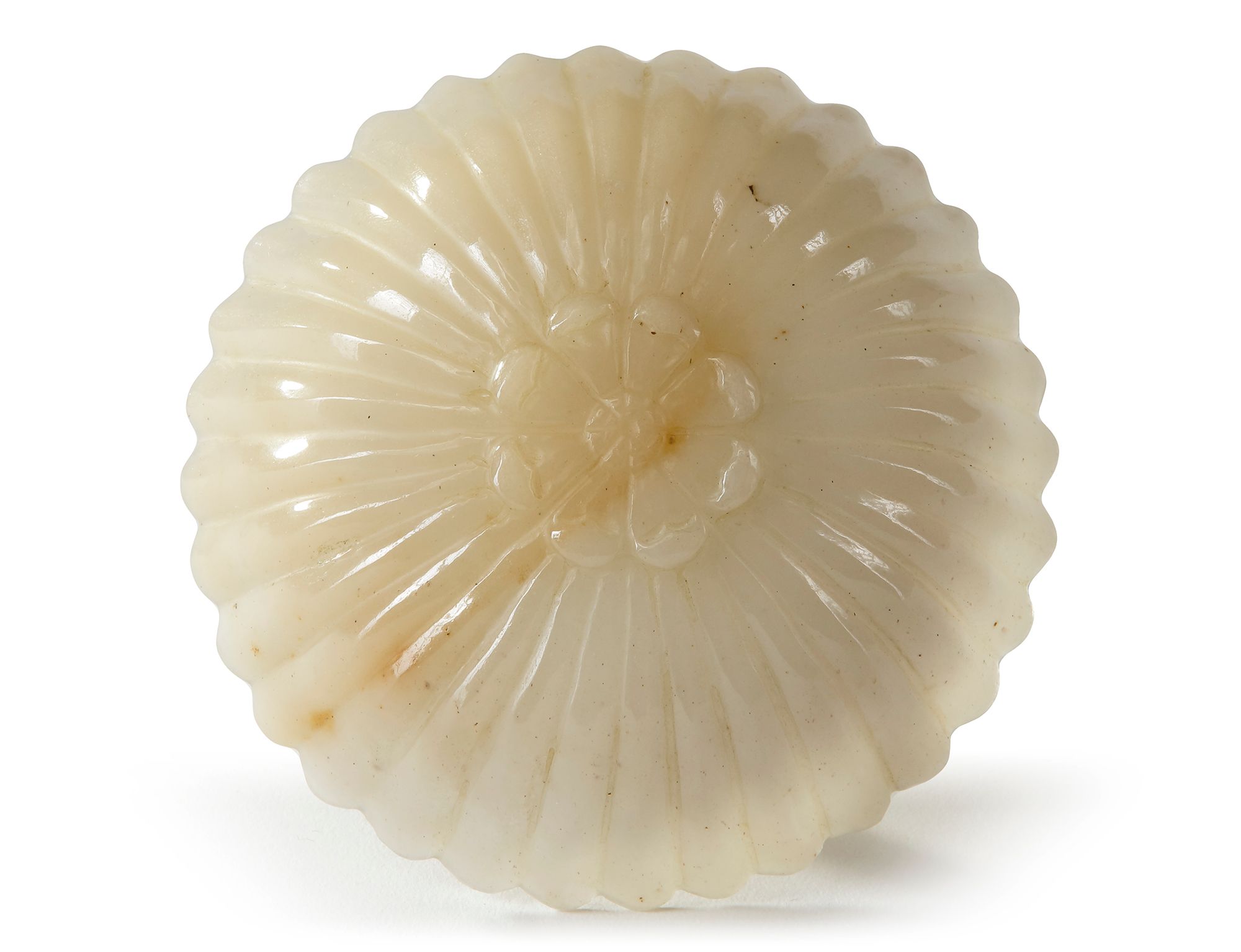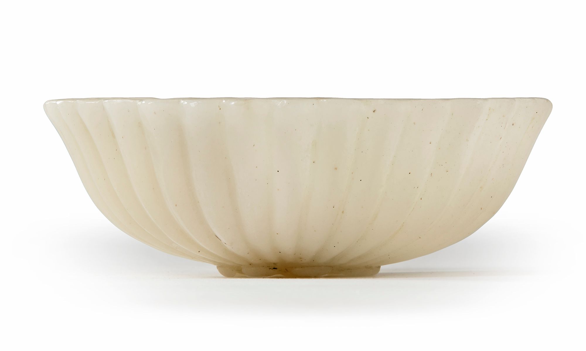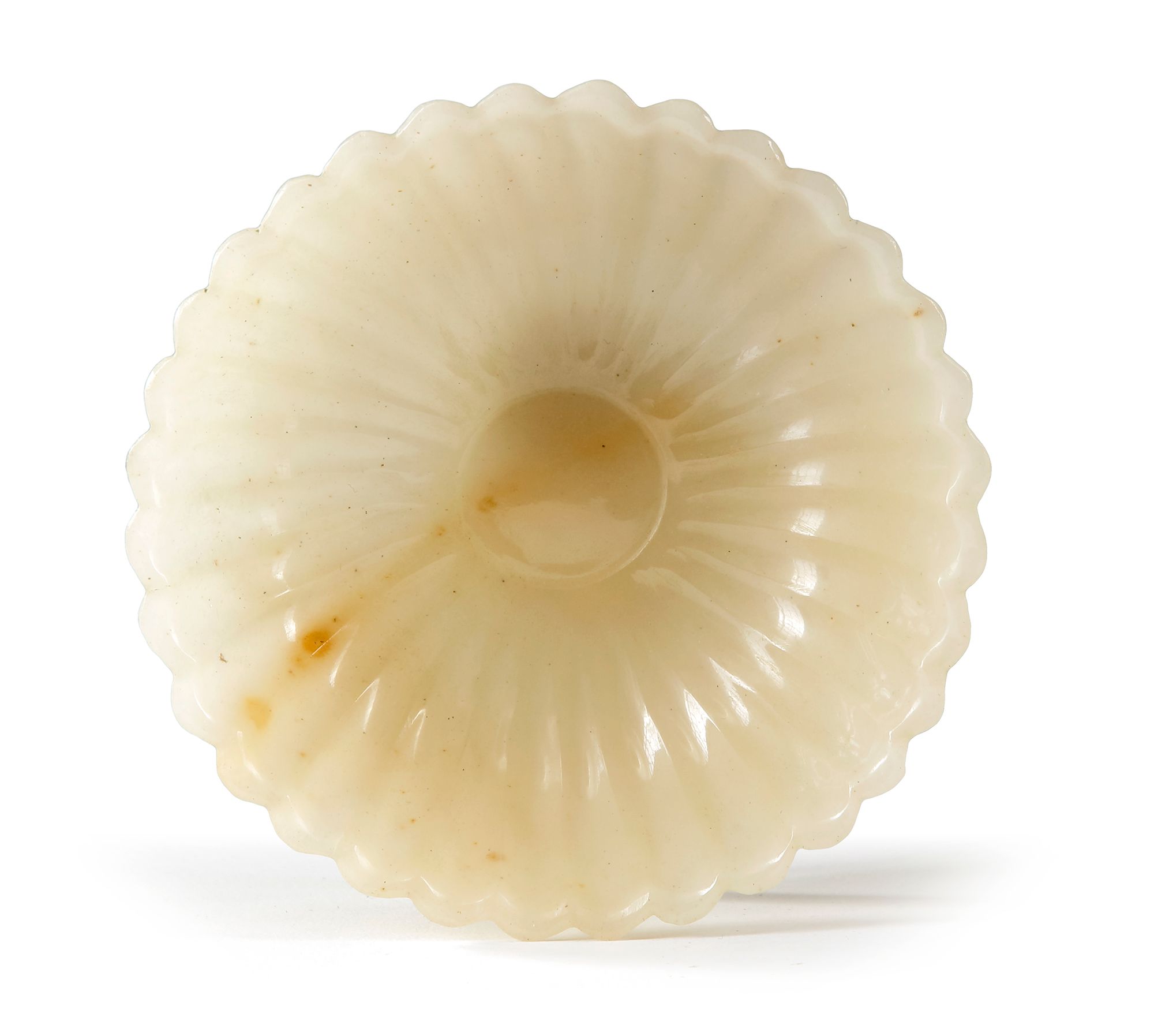 A Mughal pale fluted jade bowl of shallow rounded form on a short circular foot, thinly carved with fluted sides rising from a flower head with a cross-hatched centre to an everted lobed rim.