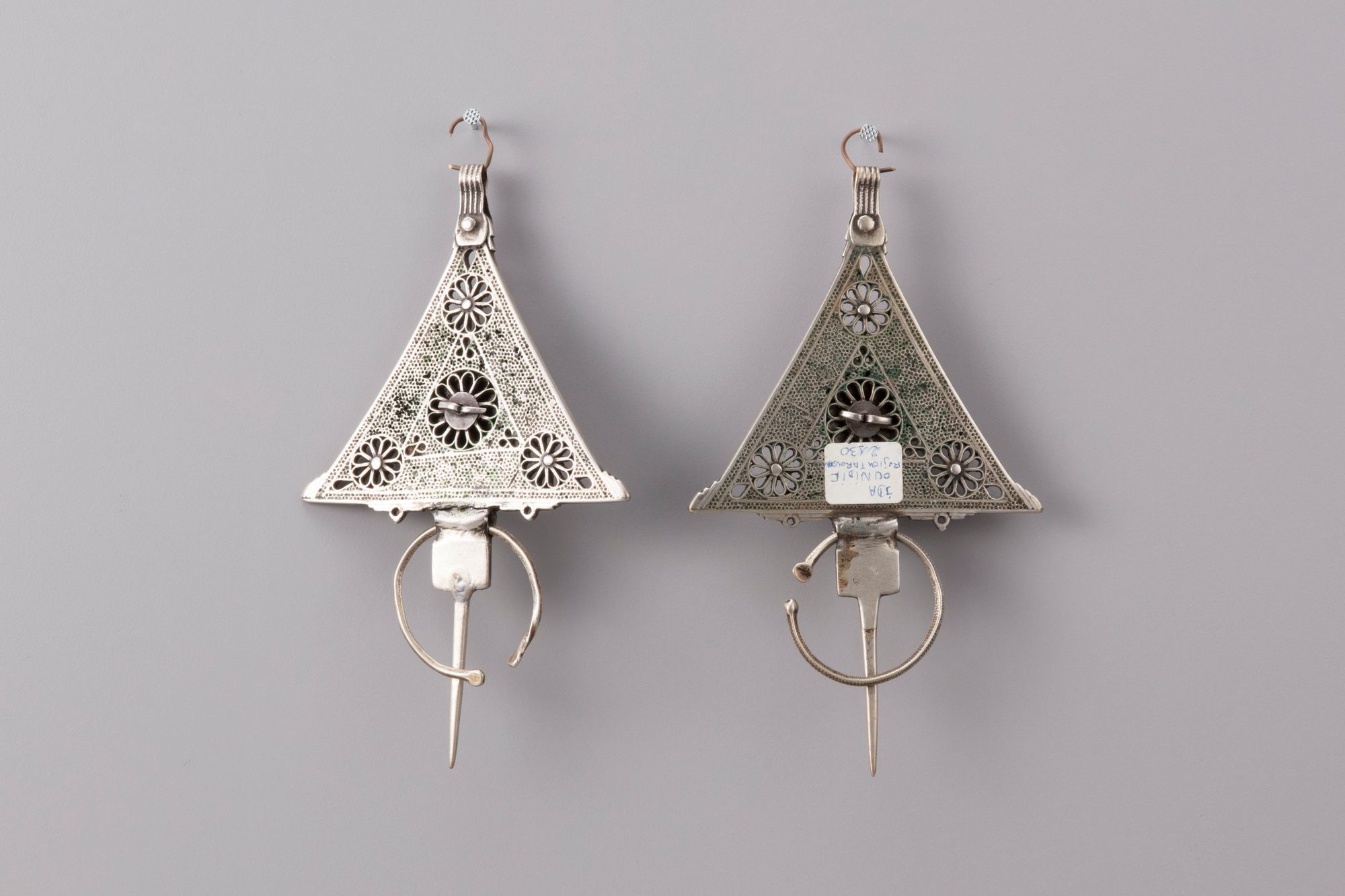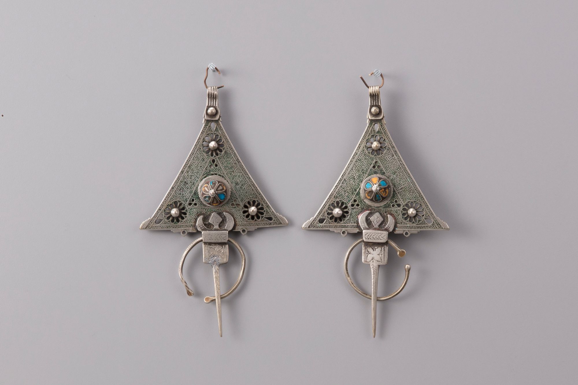 Fibulae were commonly worn by women as an everyday adornment whilst going about daily work as well as on special occasions. It is essentially a cloak fastener, comprising an ornate metal triangular, round or oval shape with detailed etchings in filigree or enamel, and a pin which serves to fasten two layers of material together and were usually worn as a pair. These type of Fibulae are worn by Berbers, the indigenous ethnic group of North Africa.