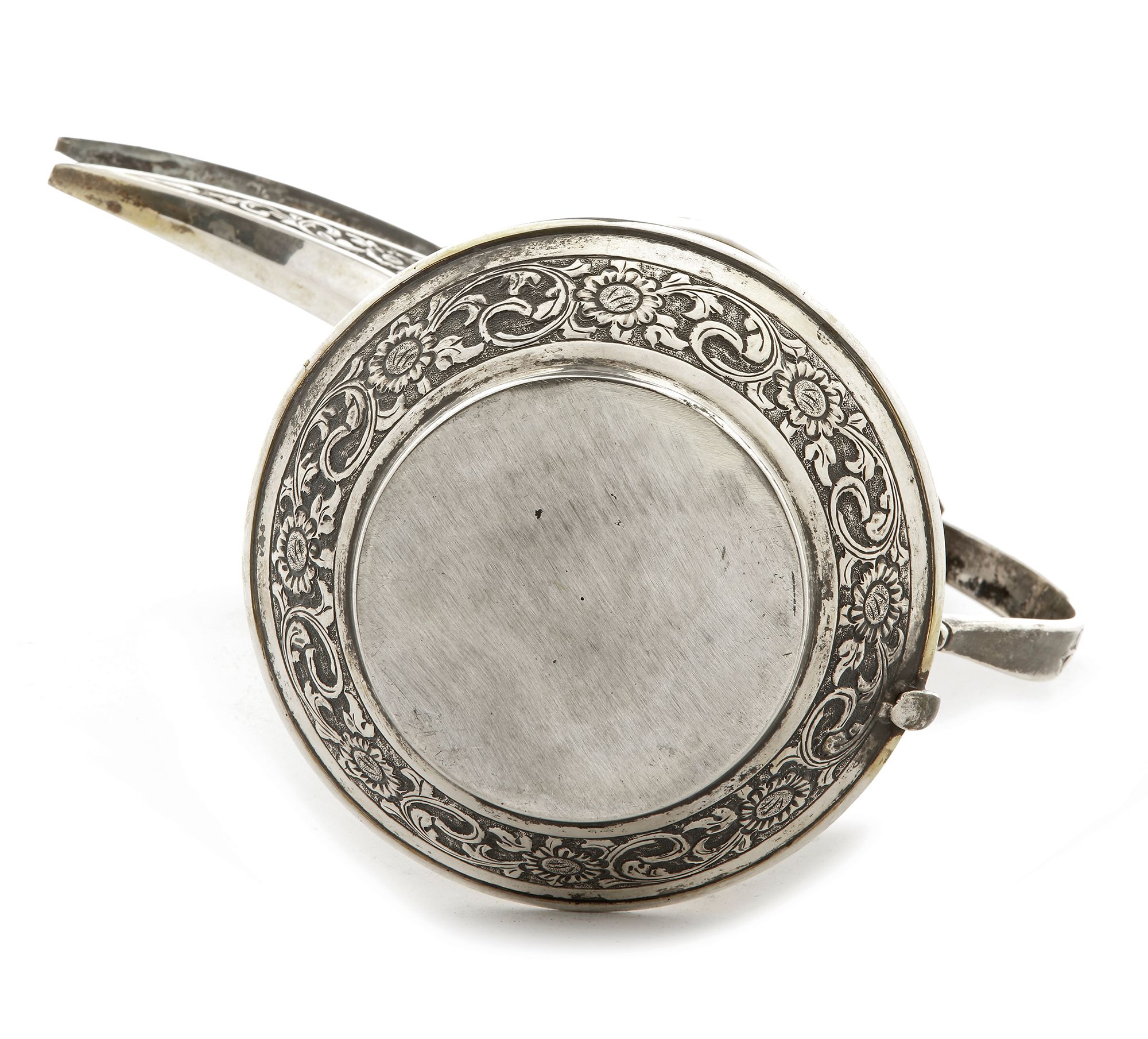 Of a solid silver with fine engraved and chiseled motives on body and lid.