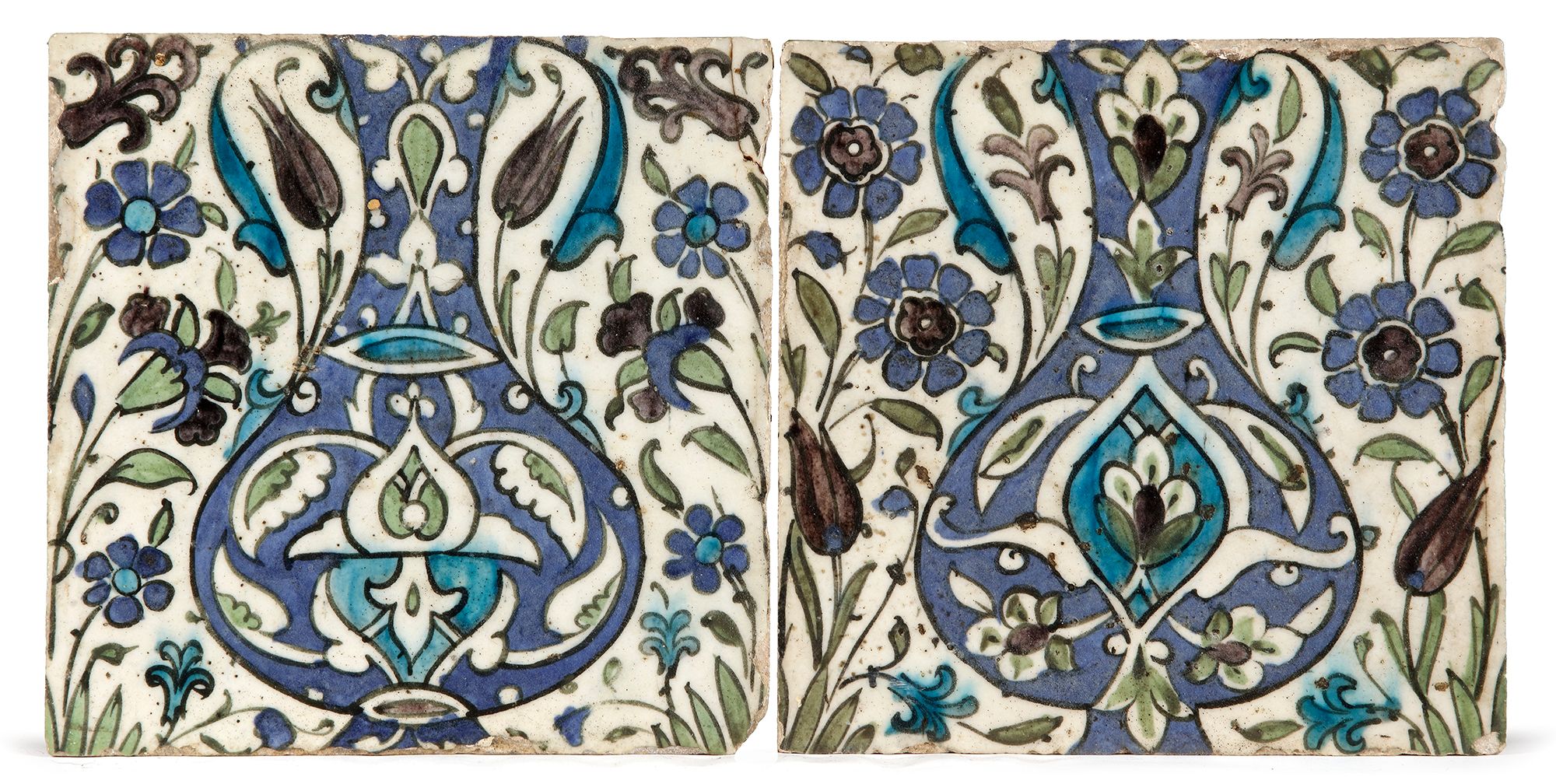 Square form, decorated on a cobalt-blue ground with a turquoise vase surrounded by white roses and flower scrolls 23.5 by 23.5 cm.