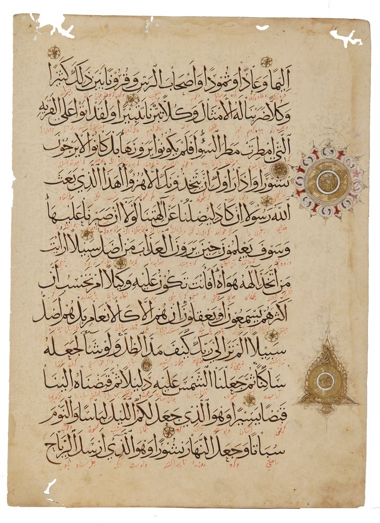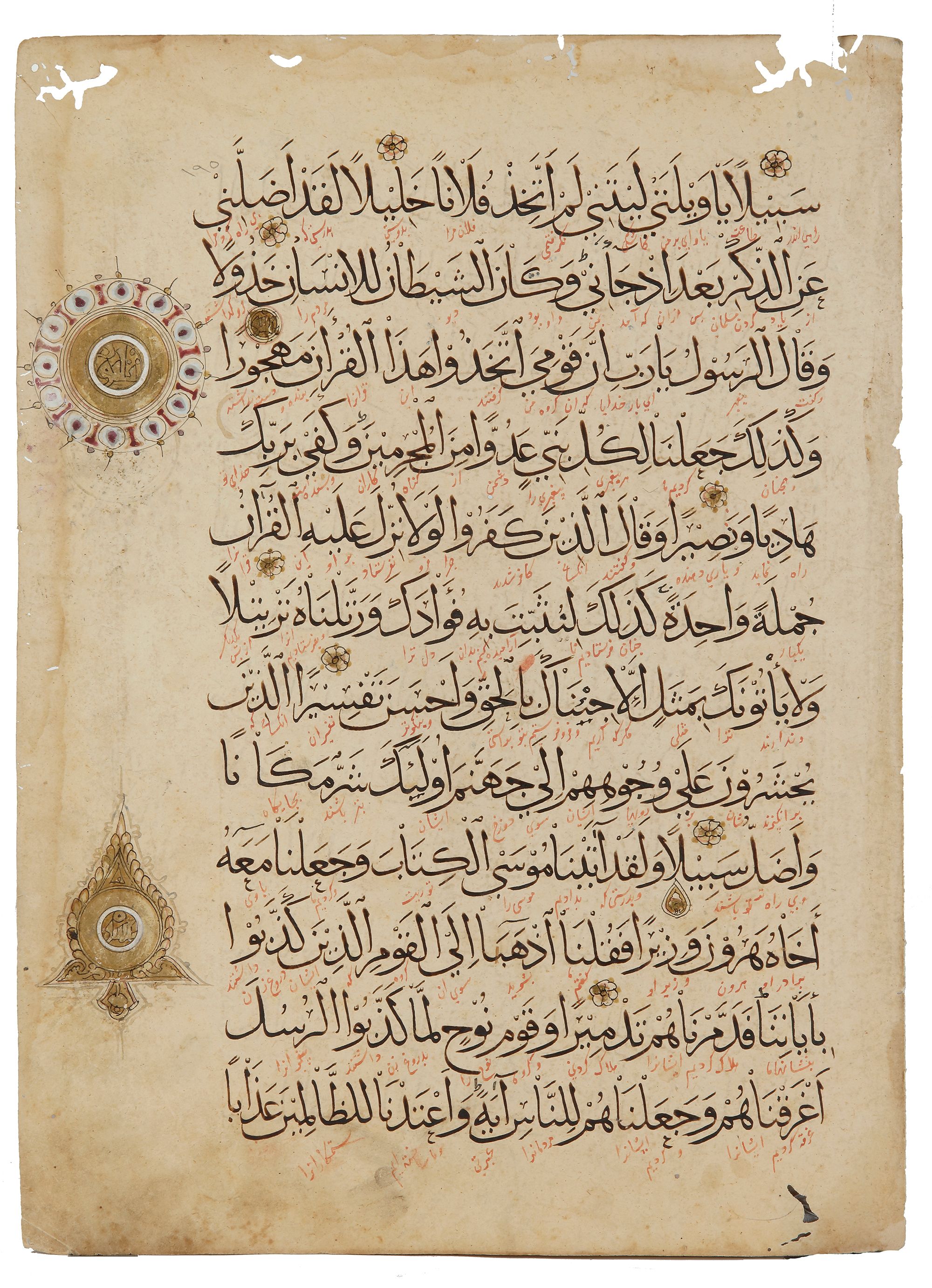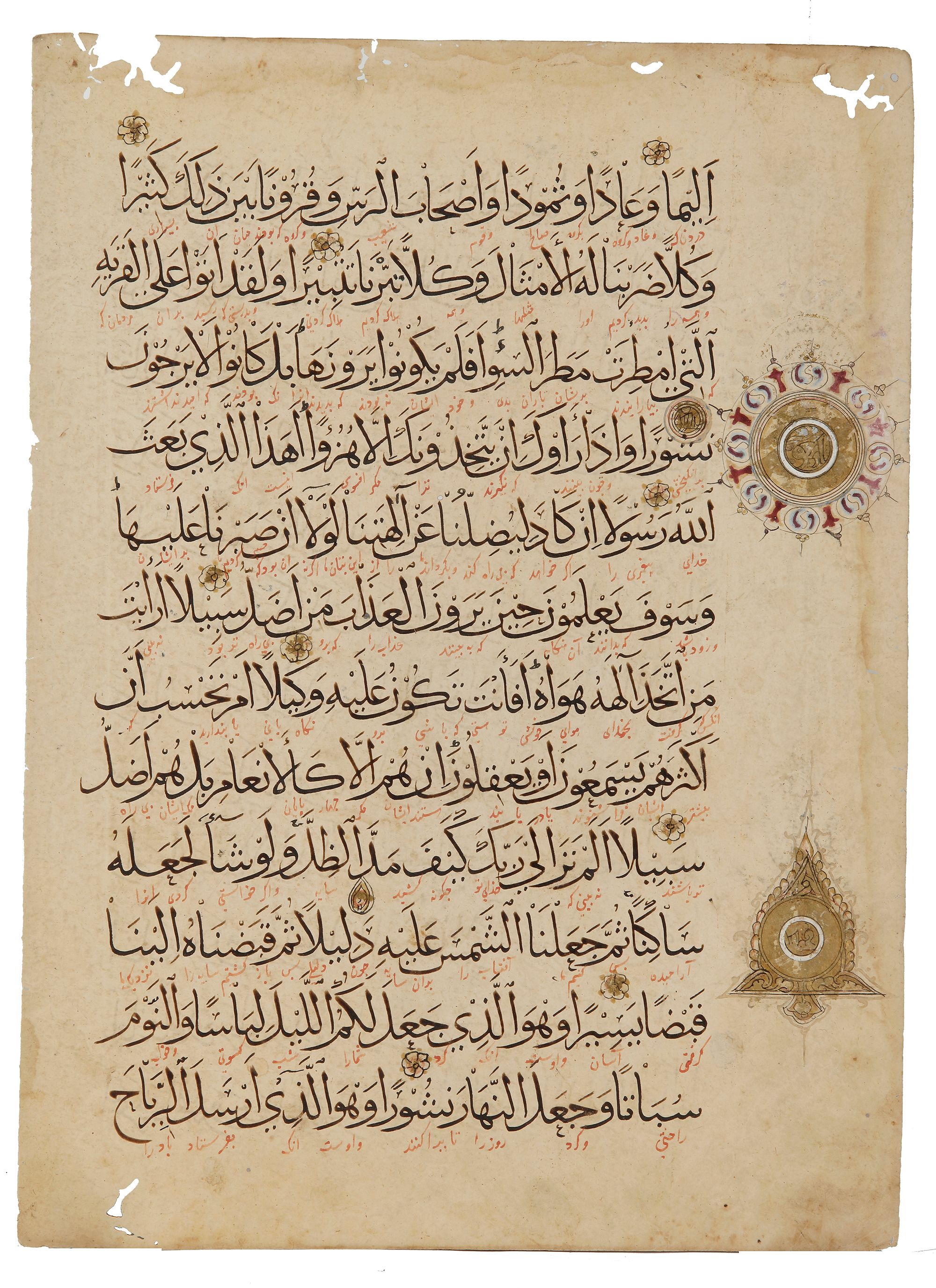 An Arabic manuscript on paper with red Turkish translation, with 12 lines to both sides, written in black naskh script with floral gold verse markers.