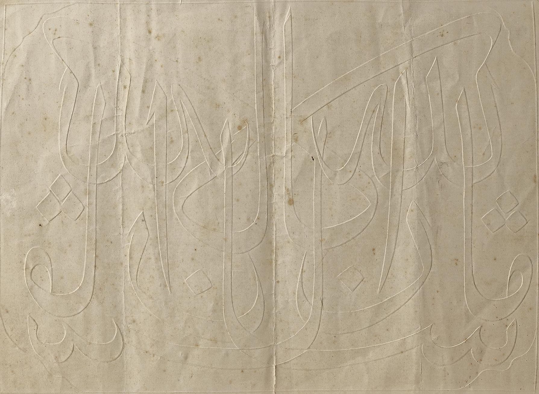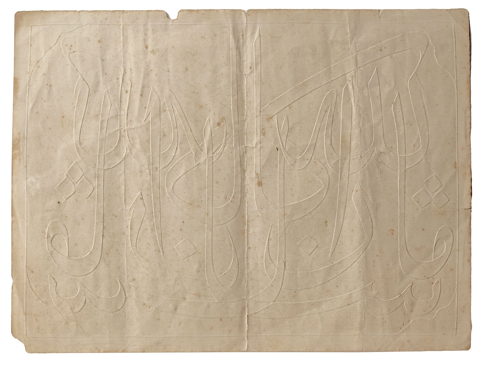 A nail-work calligraphy 'Mashallah' on polished cream paper in elegant thuluth script in mirror image. An Arabic phrase that means 'God has willed it' and is used to express appreciation, joy, praise, or thankfulness for an event or person that was just mentioned. 17.4 by 23.6 cm.