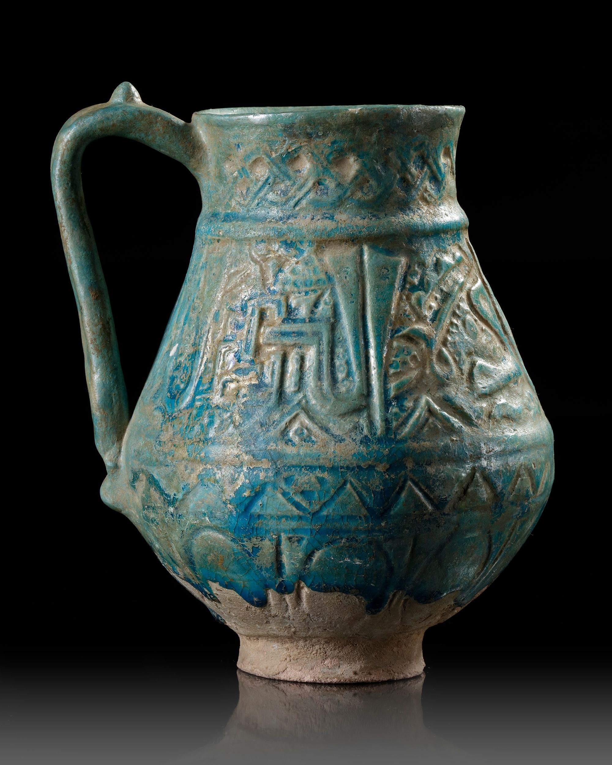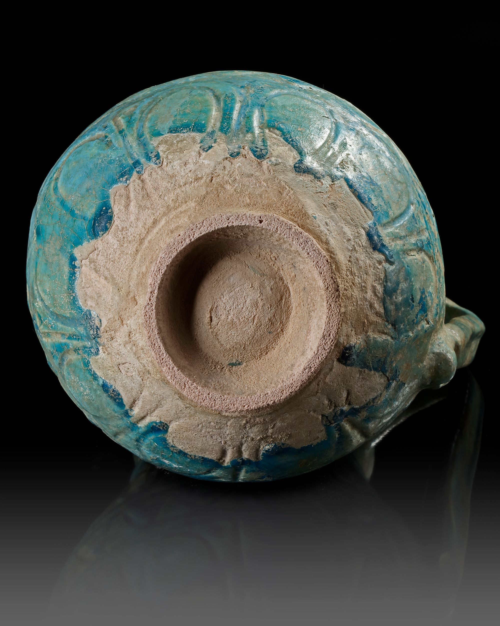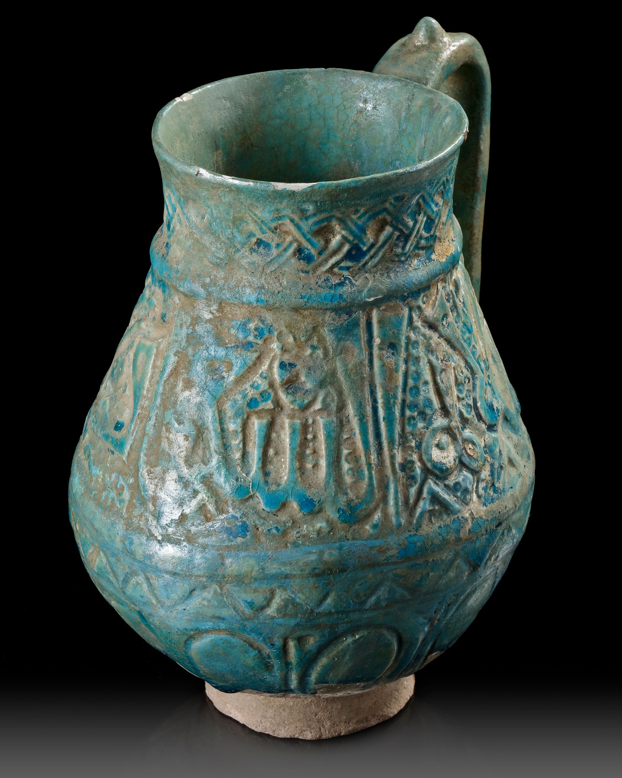 With a thick, turquoise glaze. The glaze covers all but the lower end of the body and the raised concave foot. The overall form of the body is piriform with a corseted neck and a slightly flared mouth with unpronounced rim.