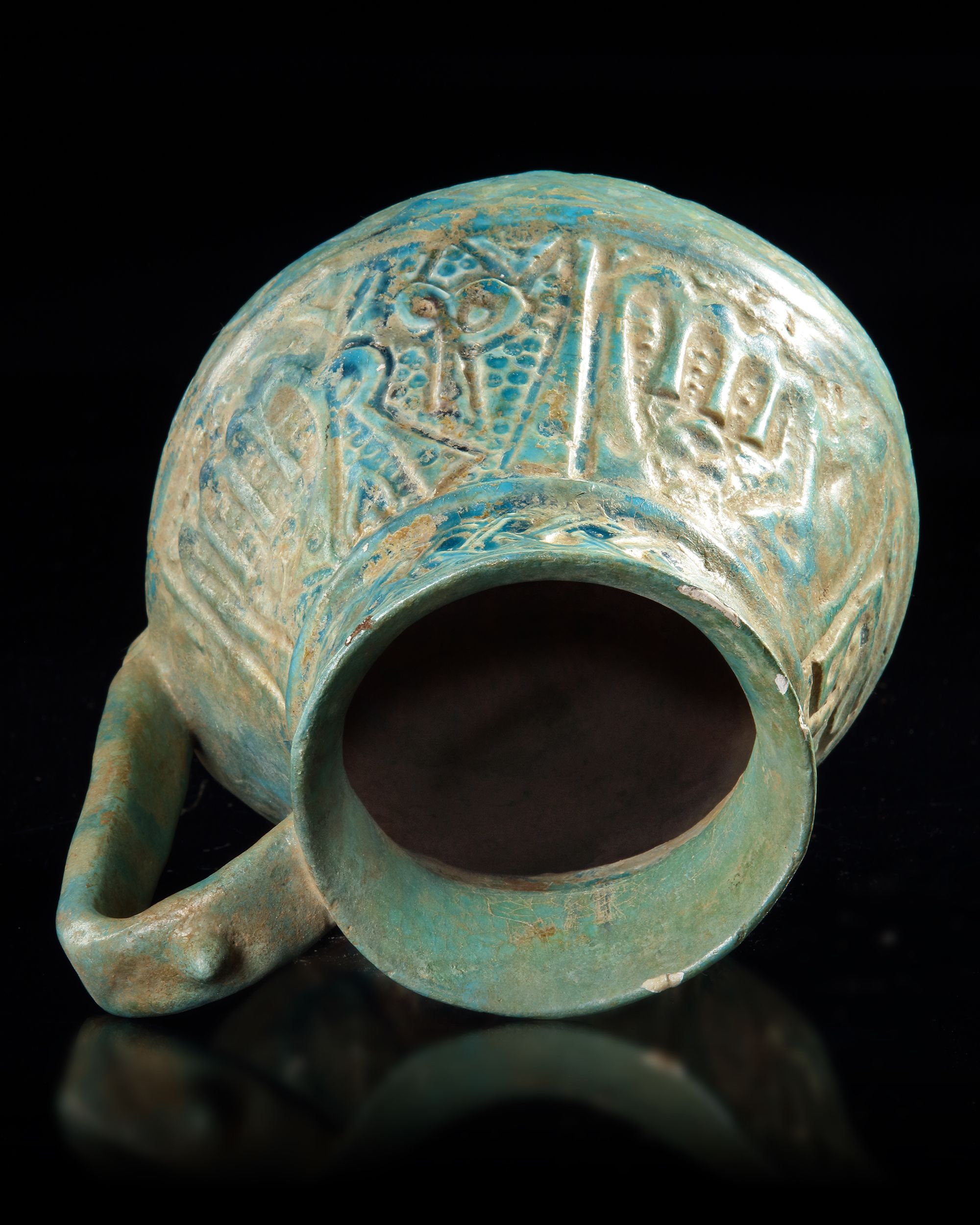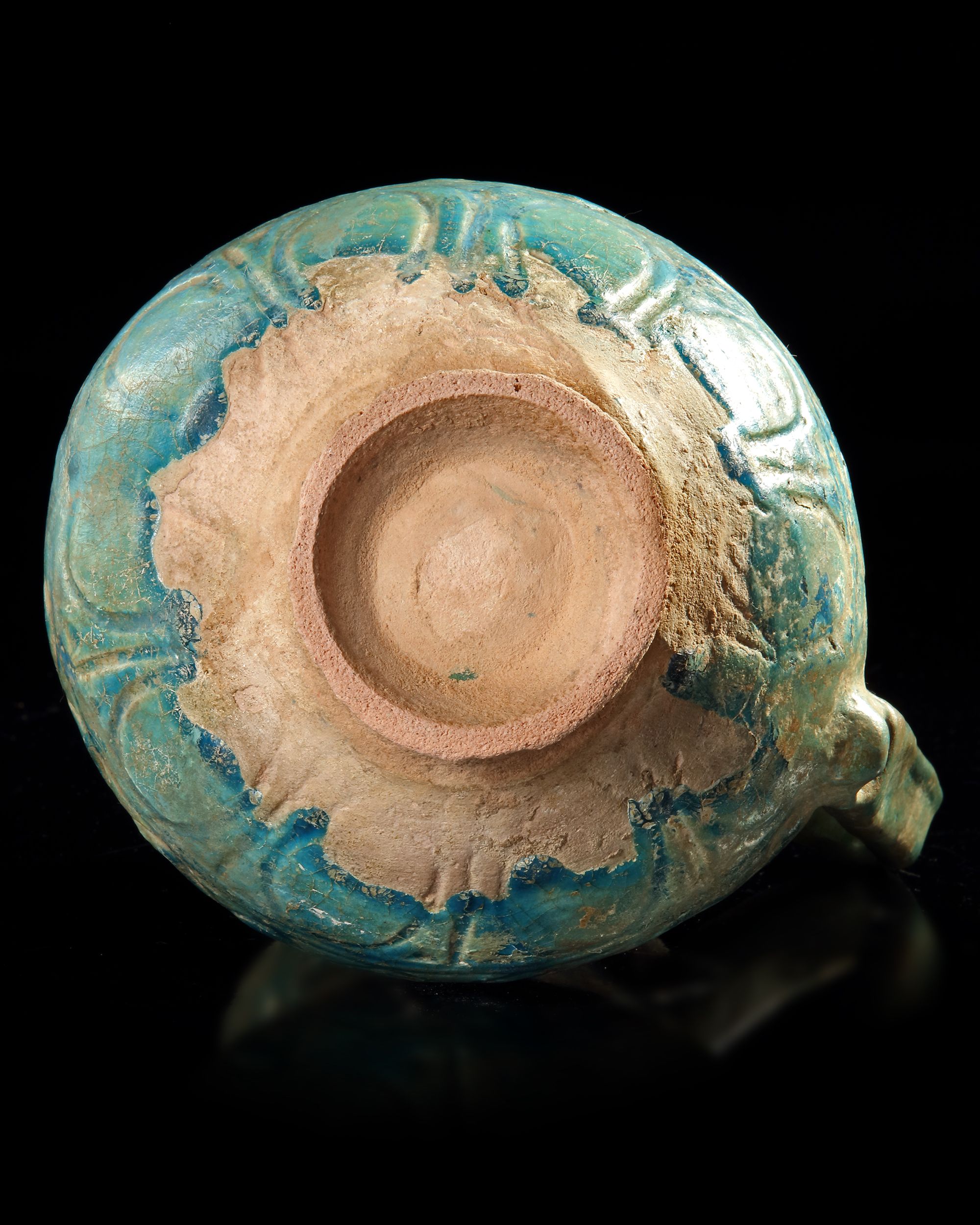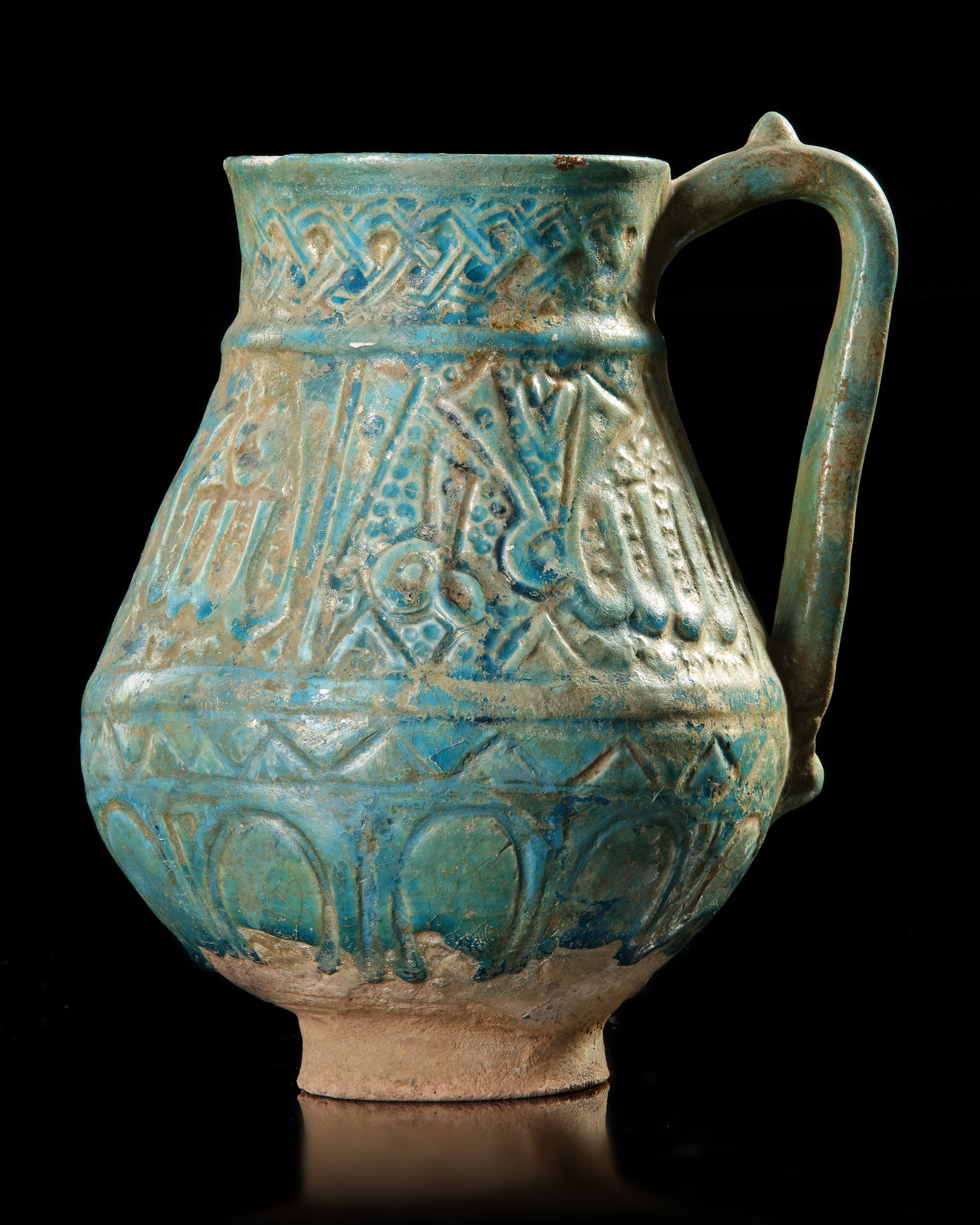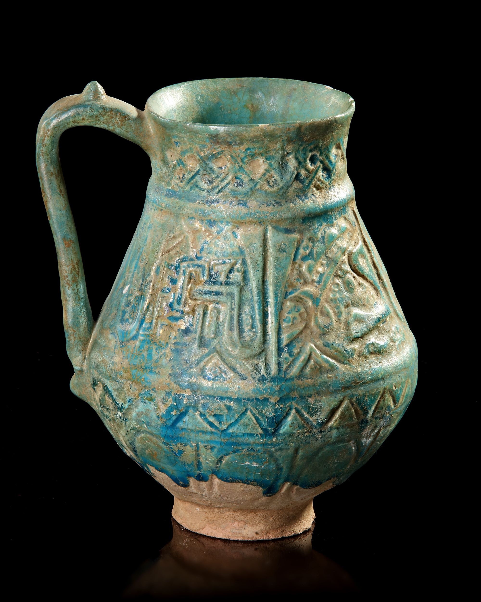 With a thick, turquoise glaze. The glaze covers all but the lower end of the body and the raised concave foot. The overall form of the body is piriform with a corseted neck and a slightly flared mouth with unpronounced rim.