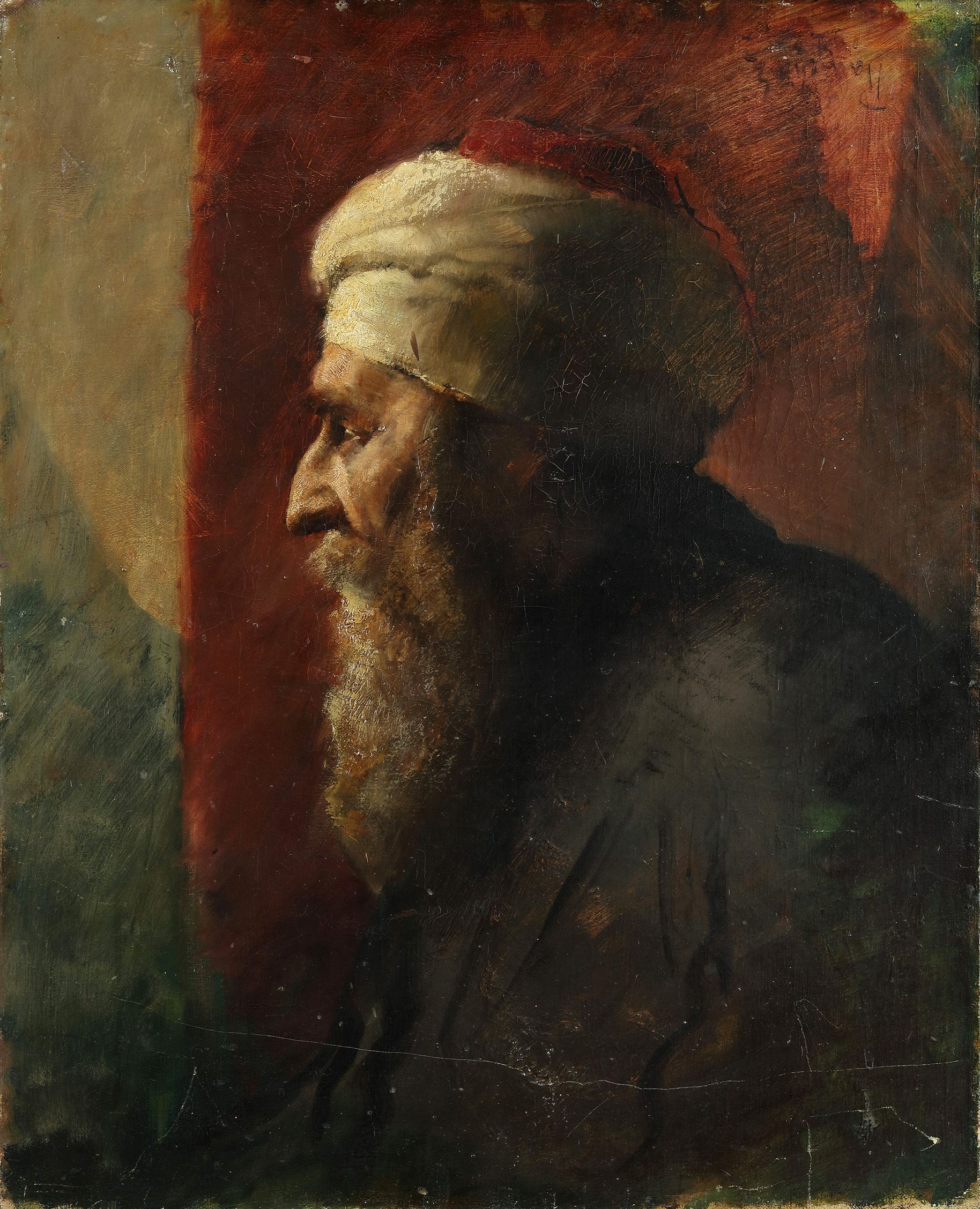 Orientalist school. Portrait of an old man with beard wearing a turban. Signature in mirror image upper right. Oil on canvas.