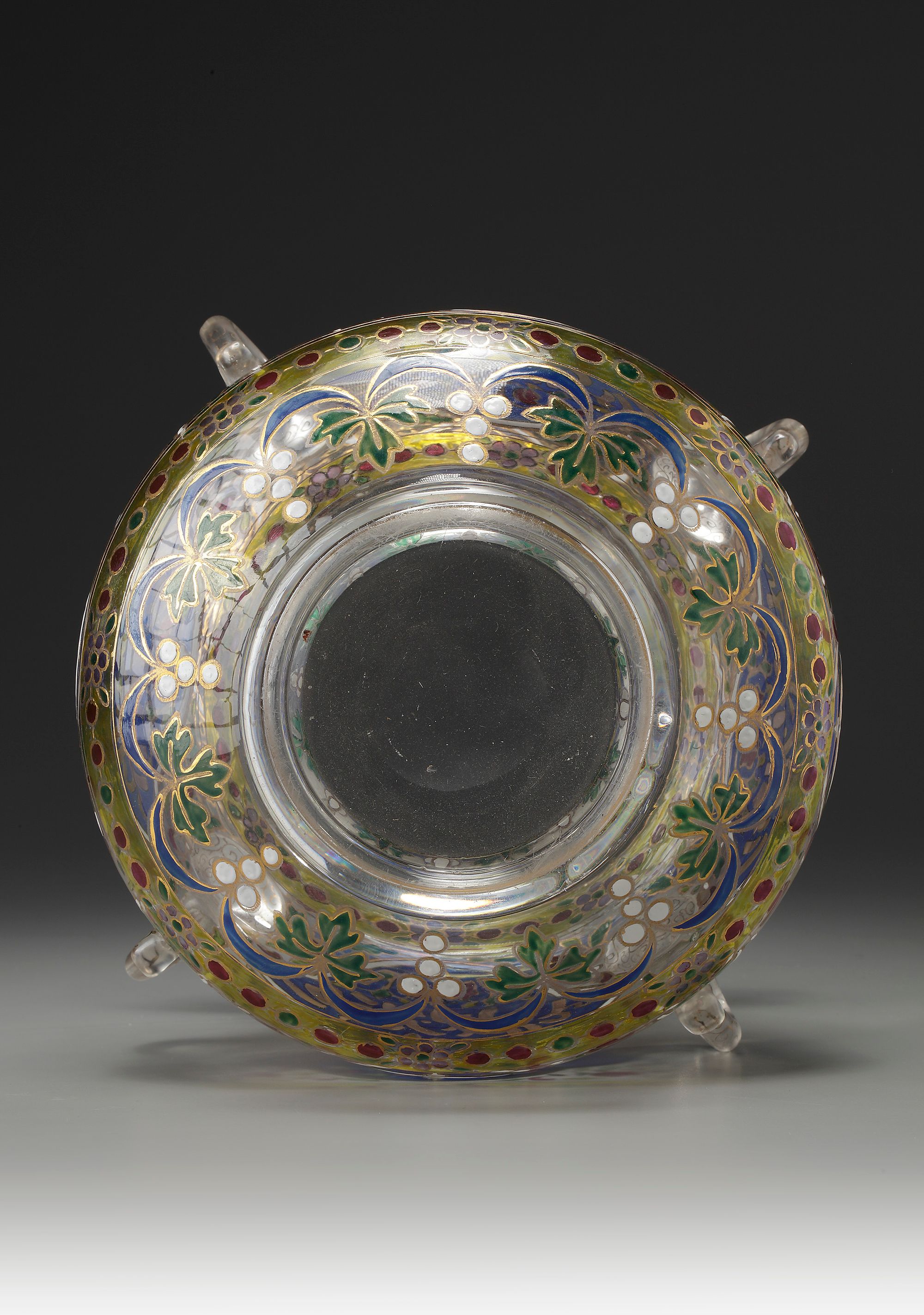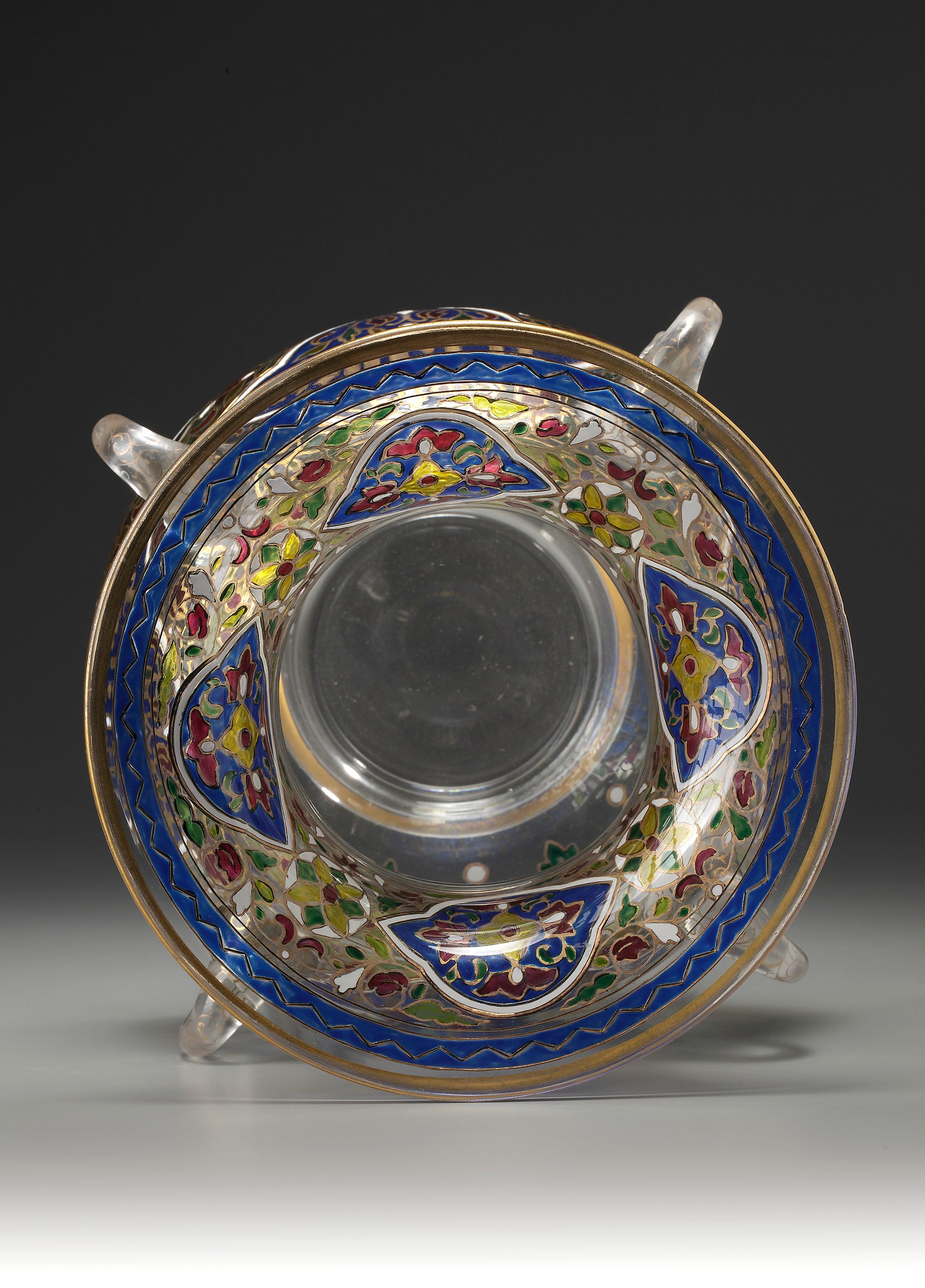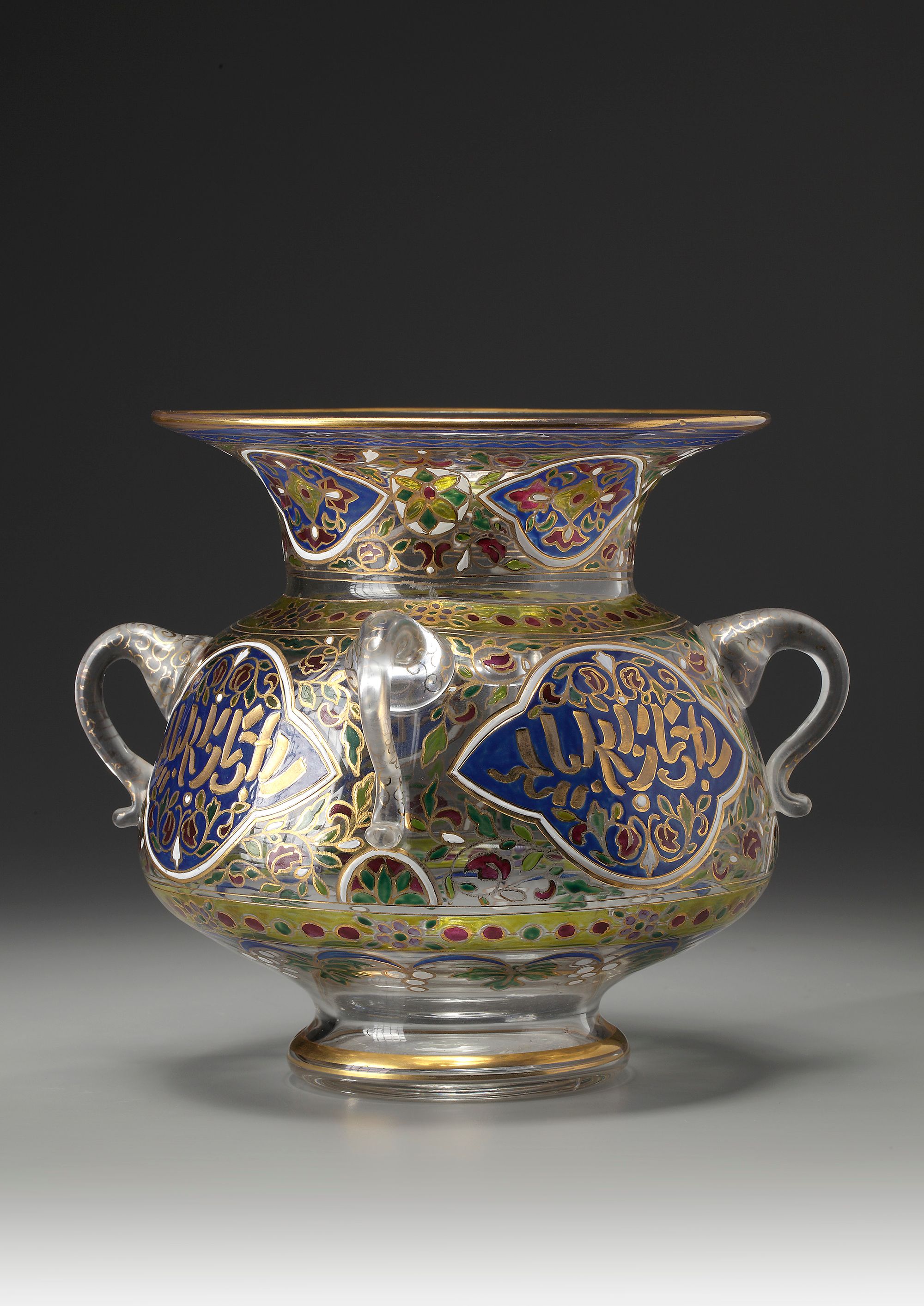 An Islamic Mamluk style Mosque oil Lamp, with a large round bulbous body rising to a narrower waist, above which the top section is flared. Standing a foot so it can be placed on a surface, but suspended by chains that went through four of loops on the outside of the body. it was made in France following the style of the lamps that were made during the Mamluk dynasty in Egypt and Syria.Decorated and gilt with panels enclosing an Arabic inscription and interspersed by foliage sprigs and flowers.