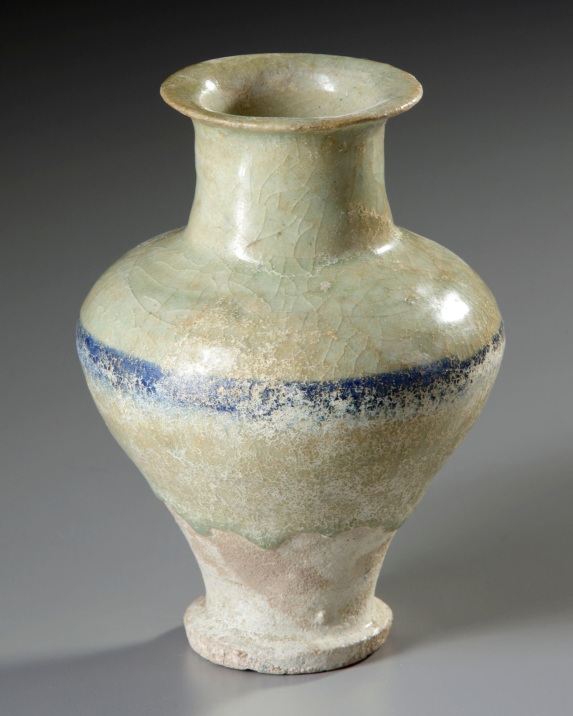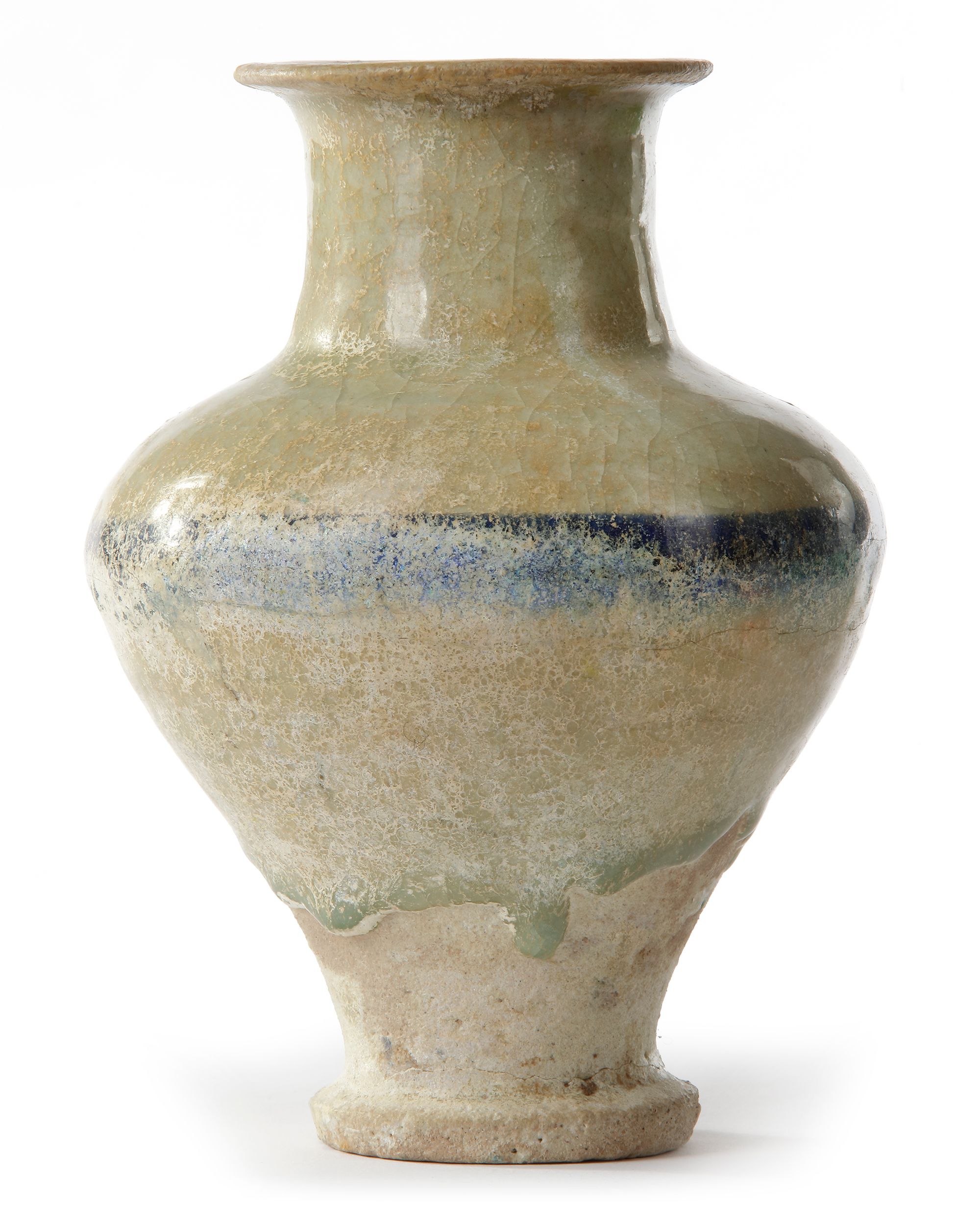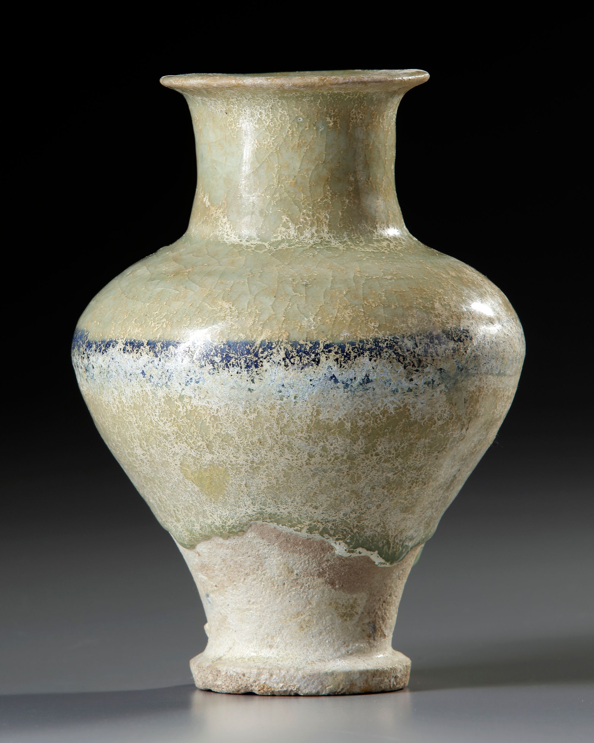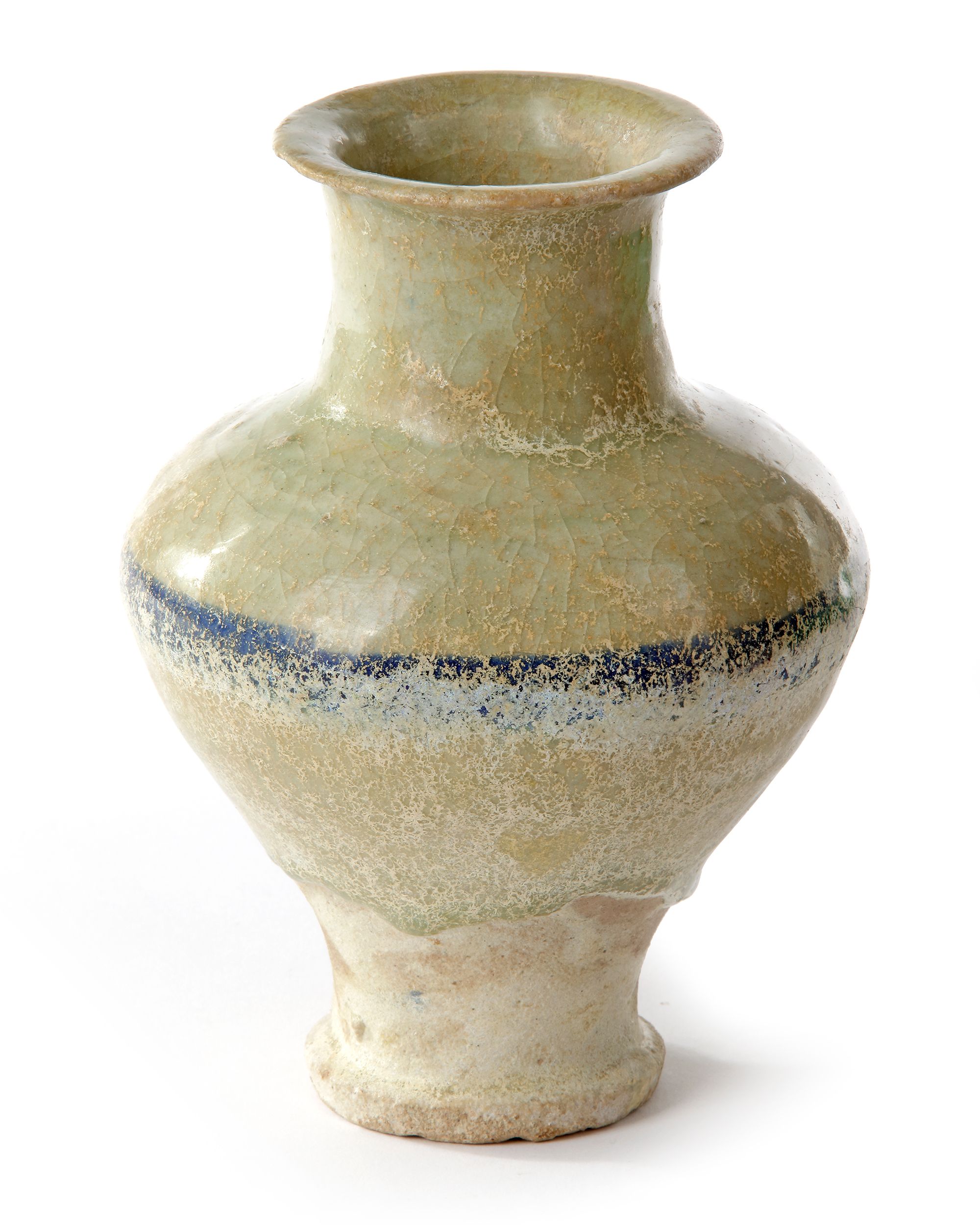 Of baluster form with short cylindrical neck and everted rim, painted underglaze in alternating black and blue horizontal band.