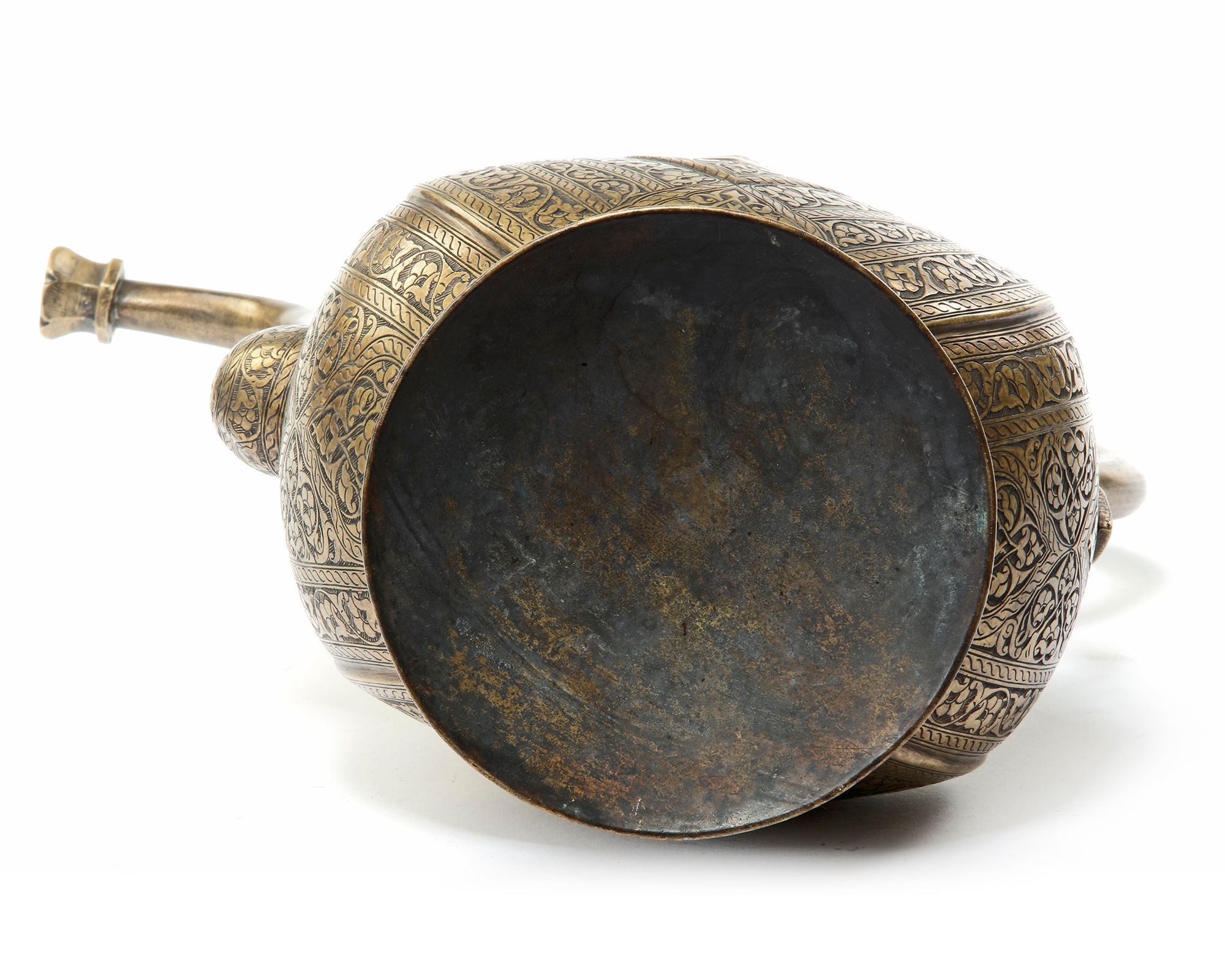 A brass ewer with piriform body and flared foot, collar to the neck, hinged tapering lid with knop finial, S-curved handle to the rear and slender tapering spout with octagonal floret finial; bands of dense foliage and tendrils reserved on a hatched field. 46 cm.