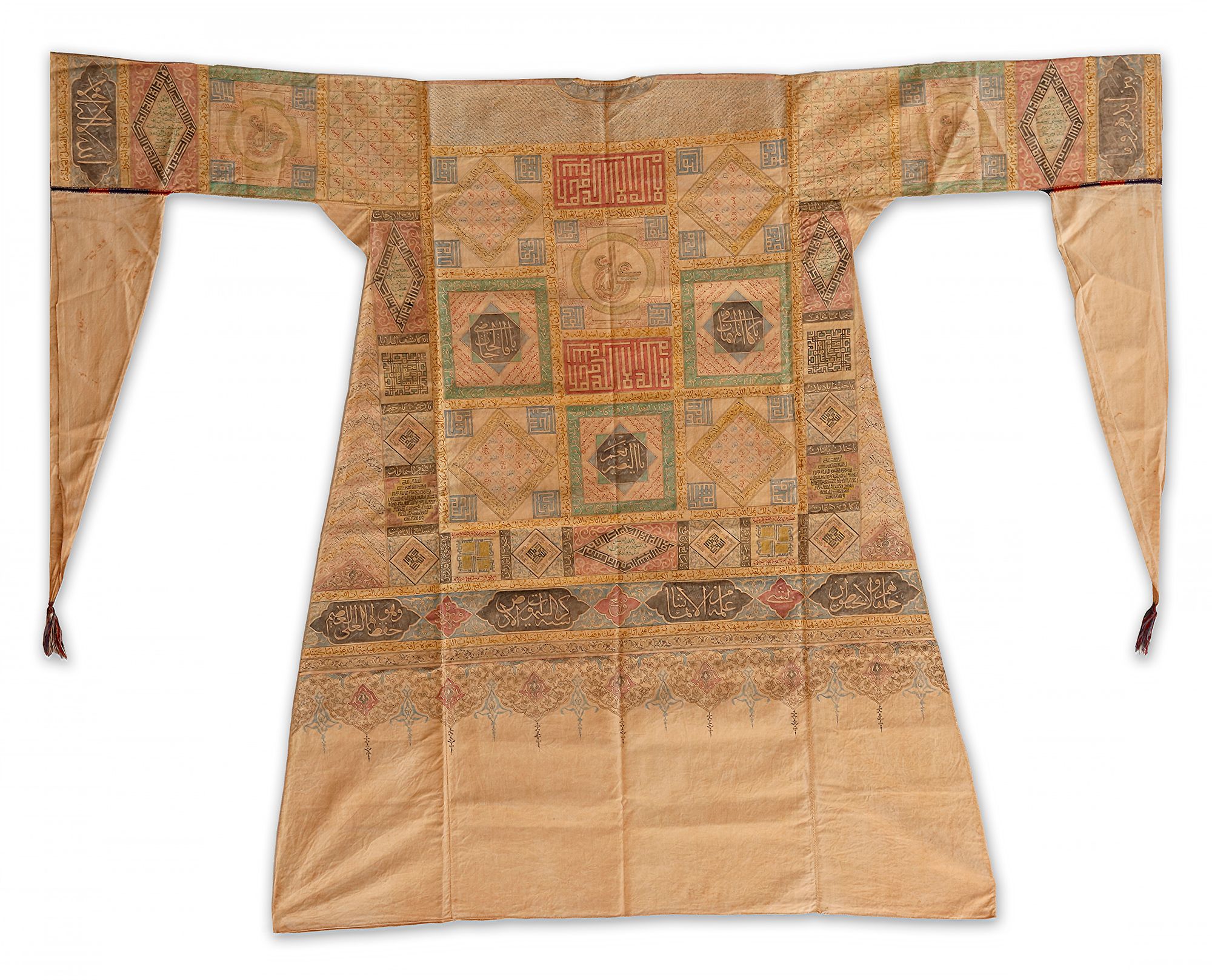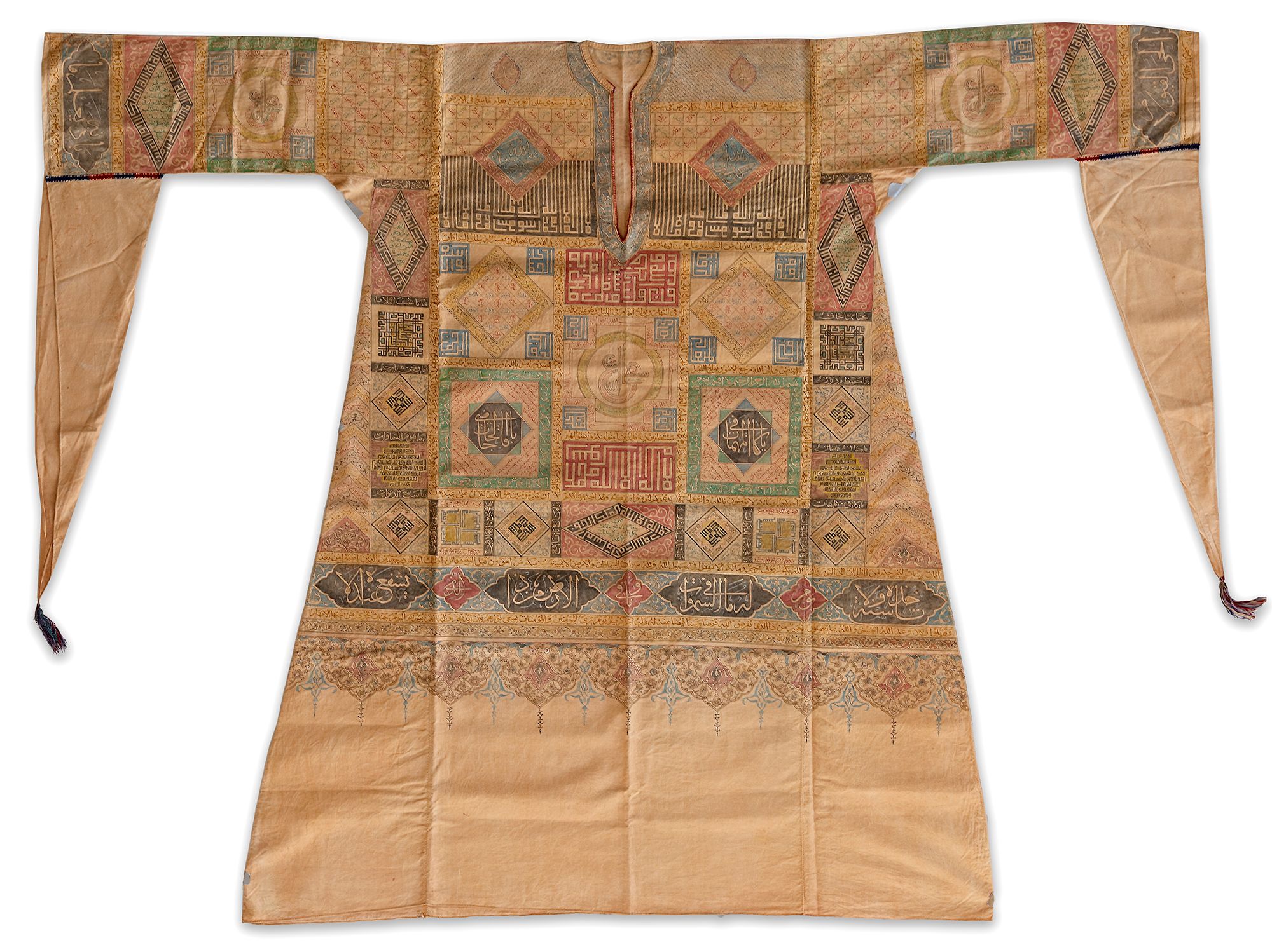 A large cotton shirt (jama) covered with text written in a variety of scripts, including thuluth, and square Kufic, in assorted colors, arranged in numerous panels, roundels, cartouches and lines.