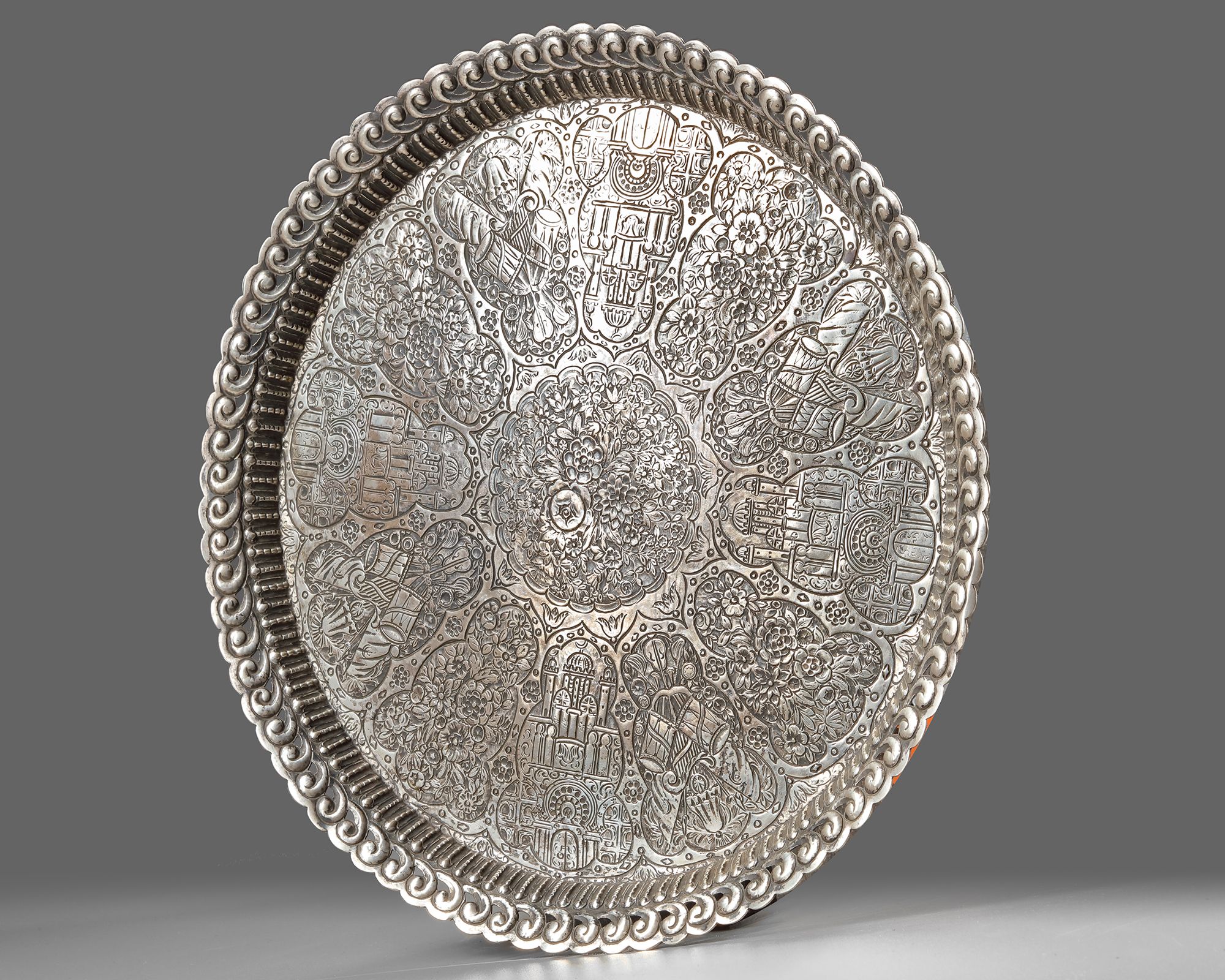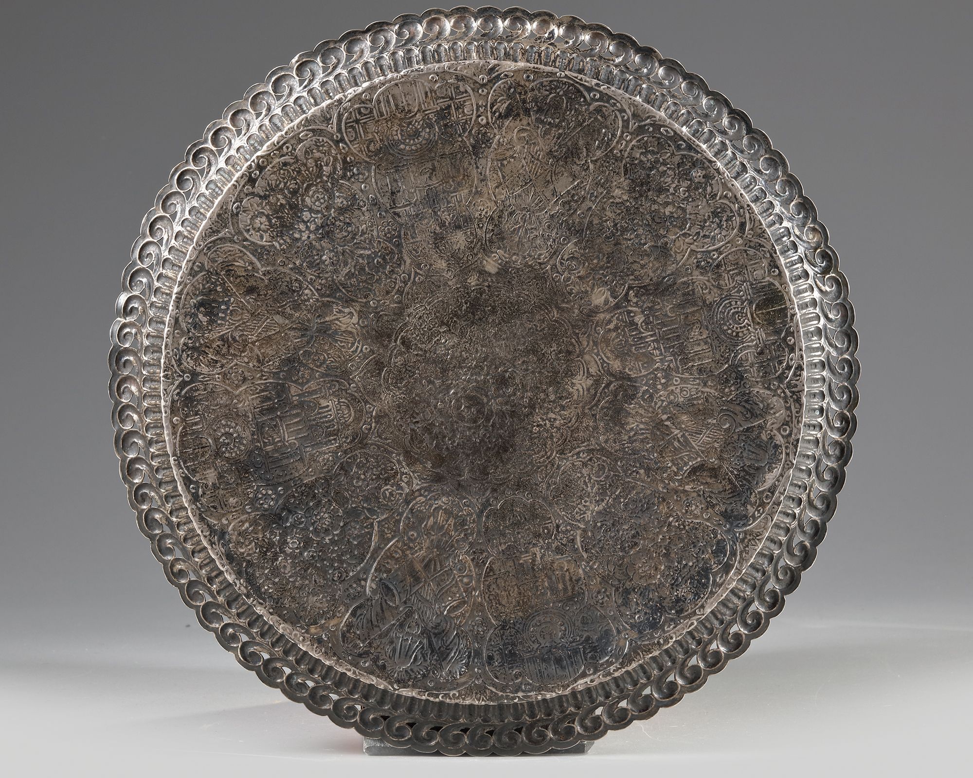 An Ottoman silver tray, elegantly cared with panels enclosing mosques and dense design of flowers and Arabesques. 33 cm. diam.