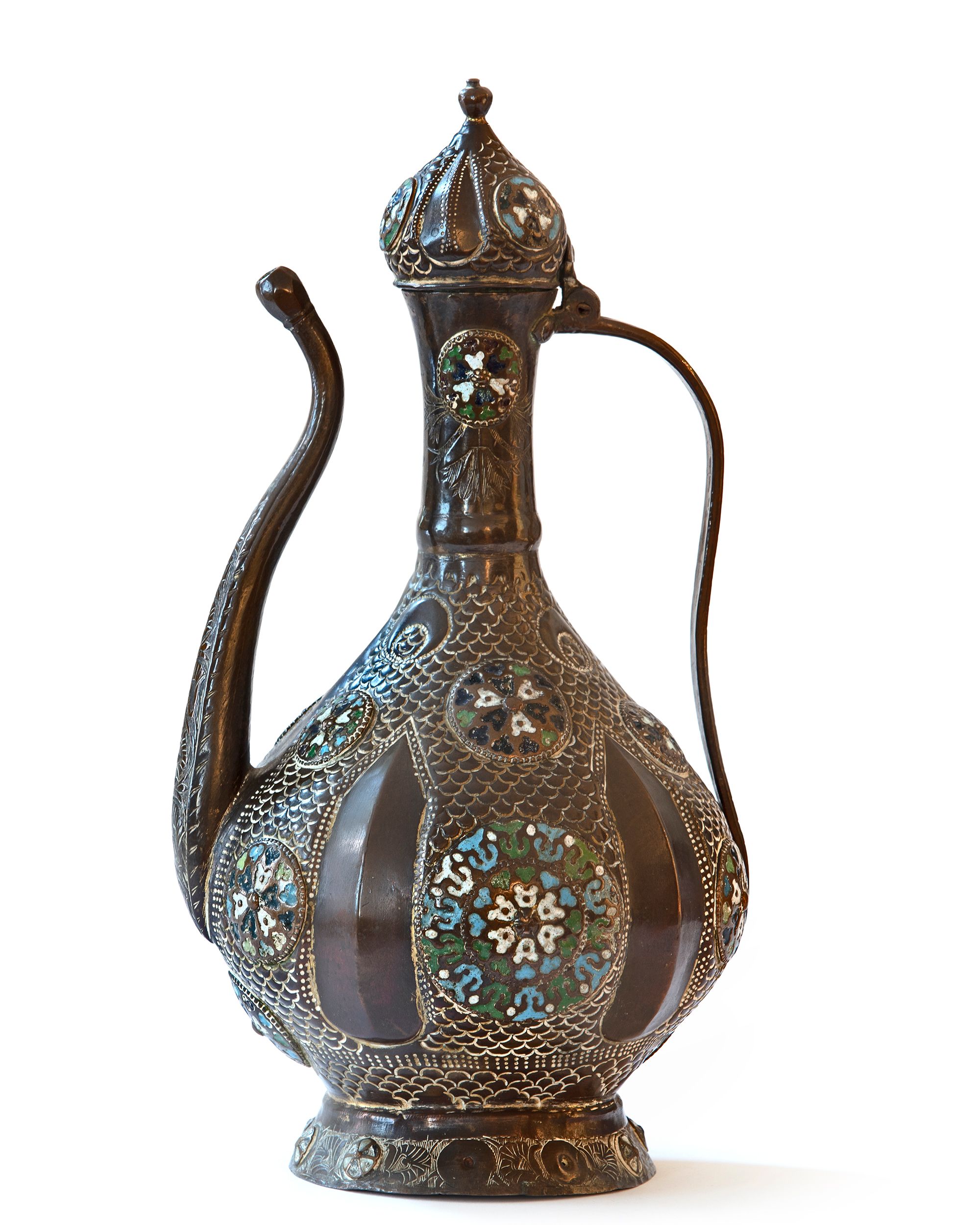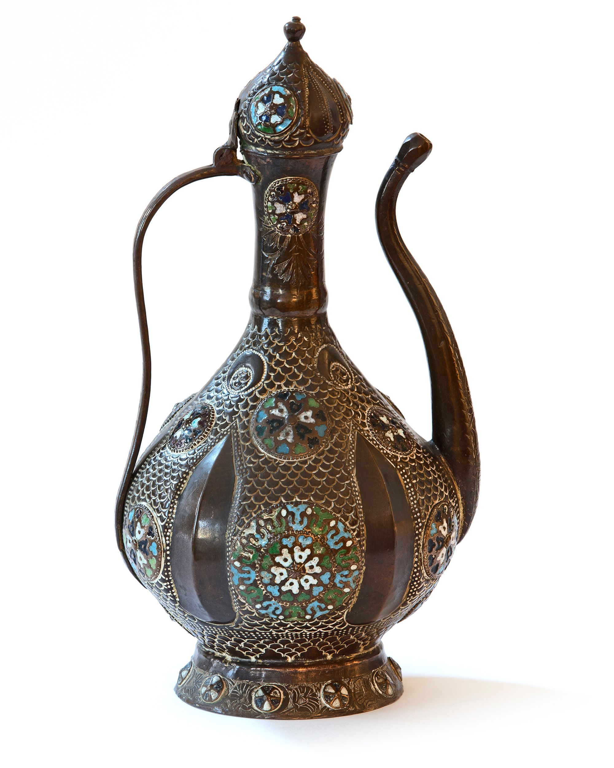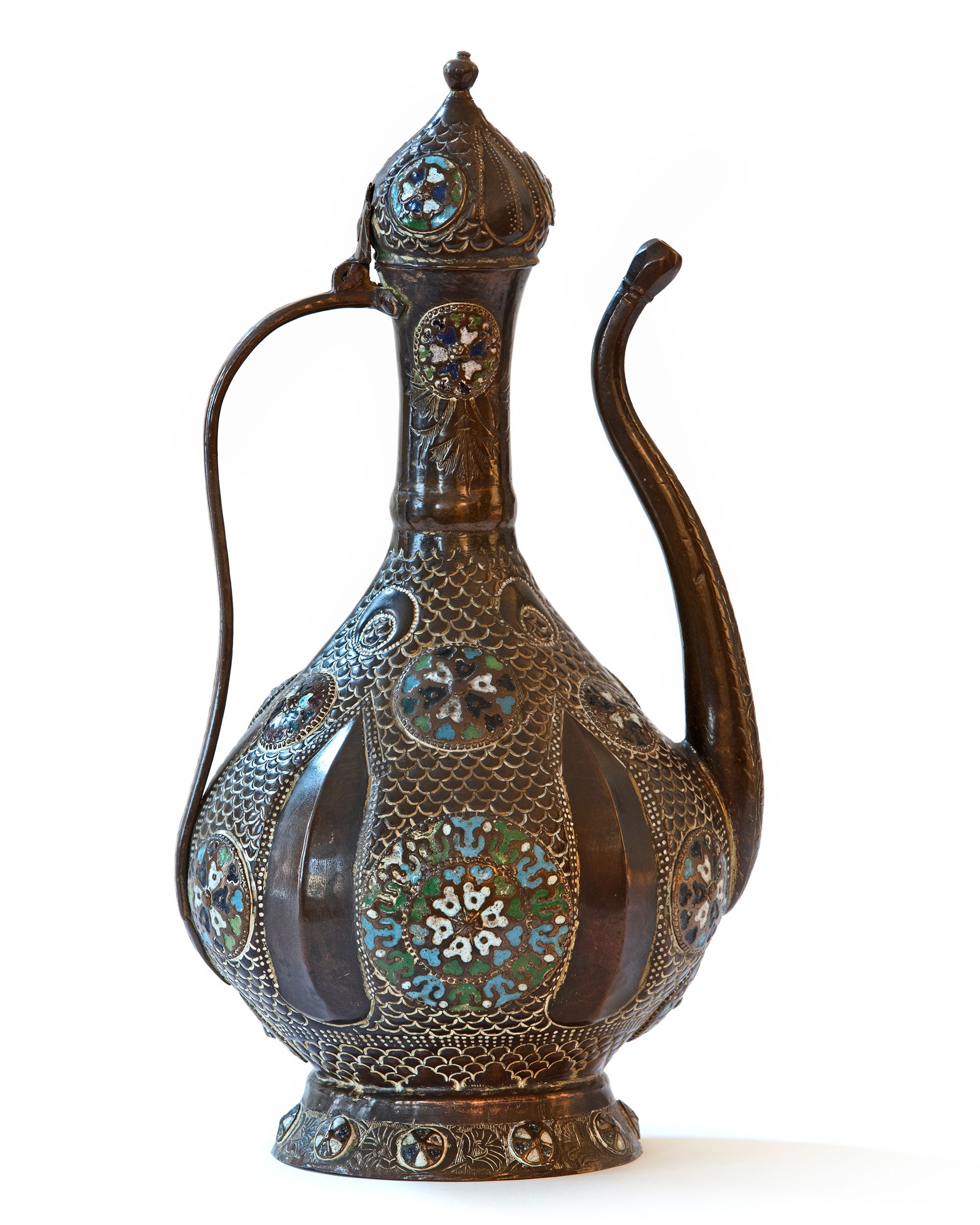 Ewer with blue medallions, in copper incised with scales and applied with enamelled medallions with blue enamelled flower decoration. H 35 cm