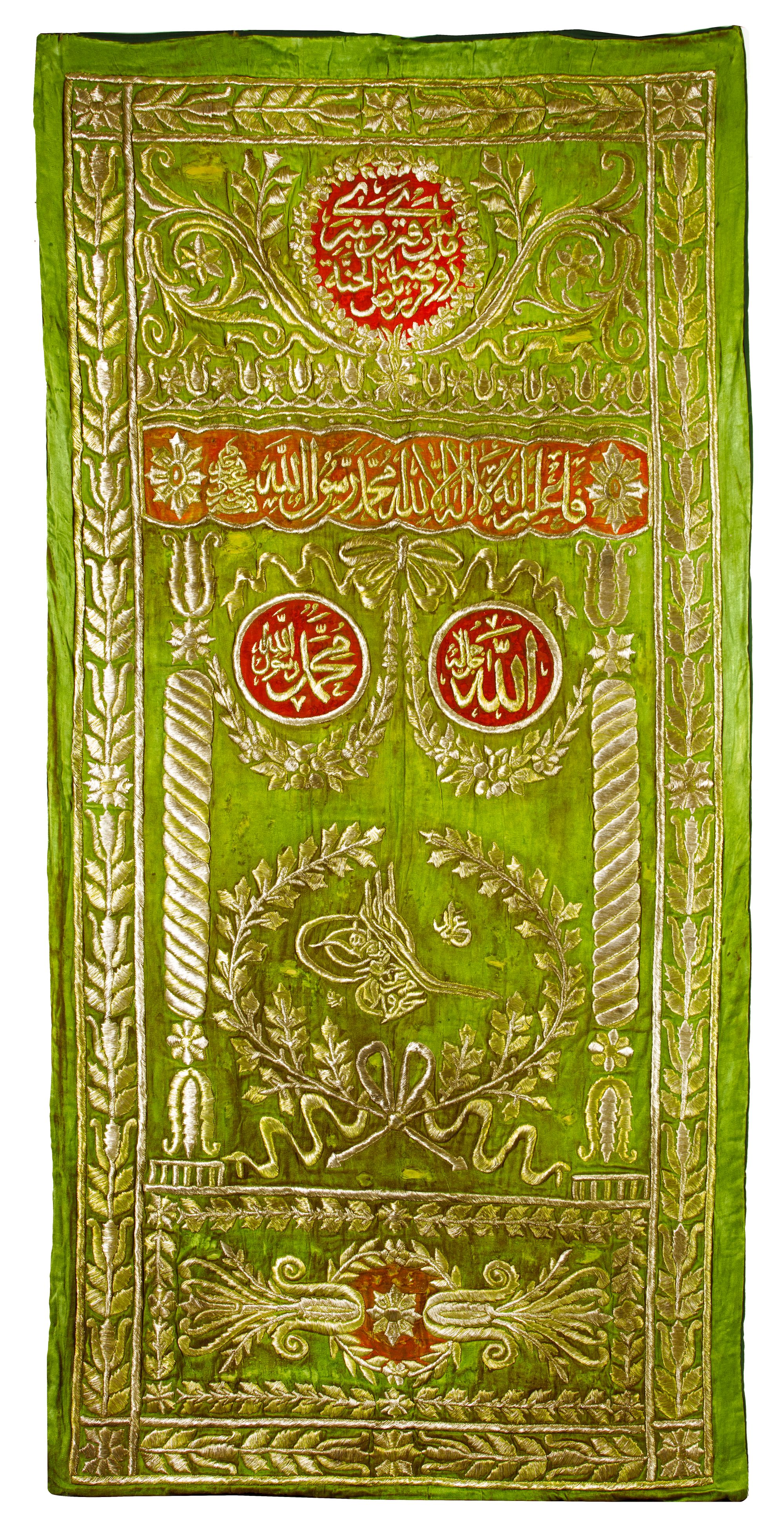 Of rectangular form, the green silk ground applied with red and orange cartouches and roundels, embroidered with silver and silver-gilt metal threads, with central roundels below a calligraphic band and roundel at peak, the tughra of Sultan Mahmud flanked by two spiralling columns and framed by a pattern of foliate and floral motifs.