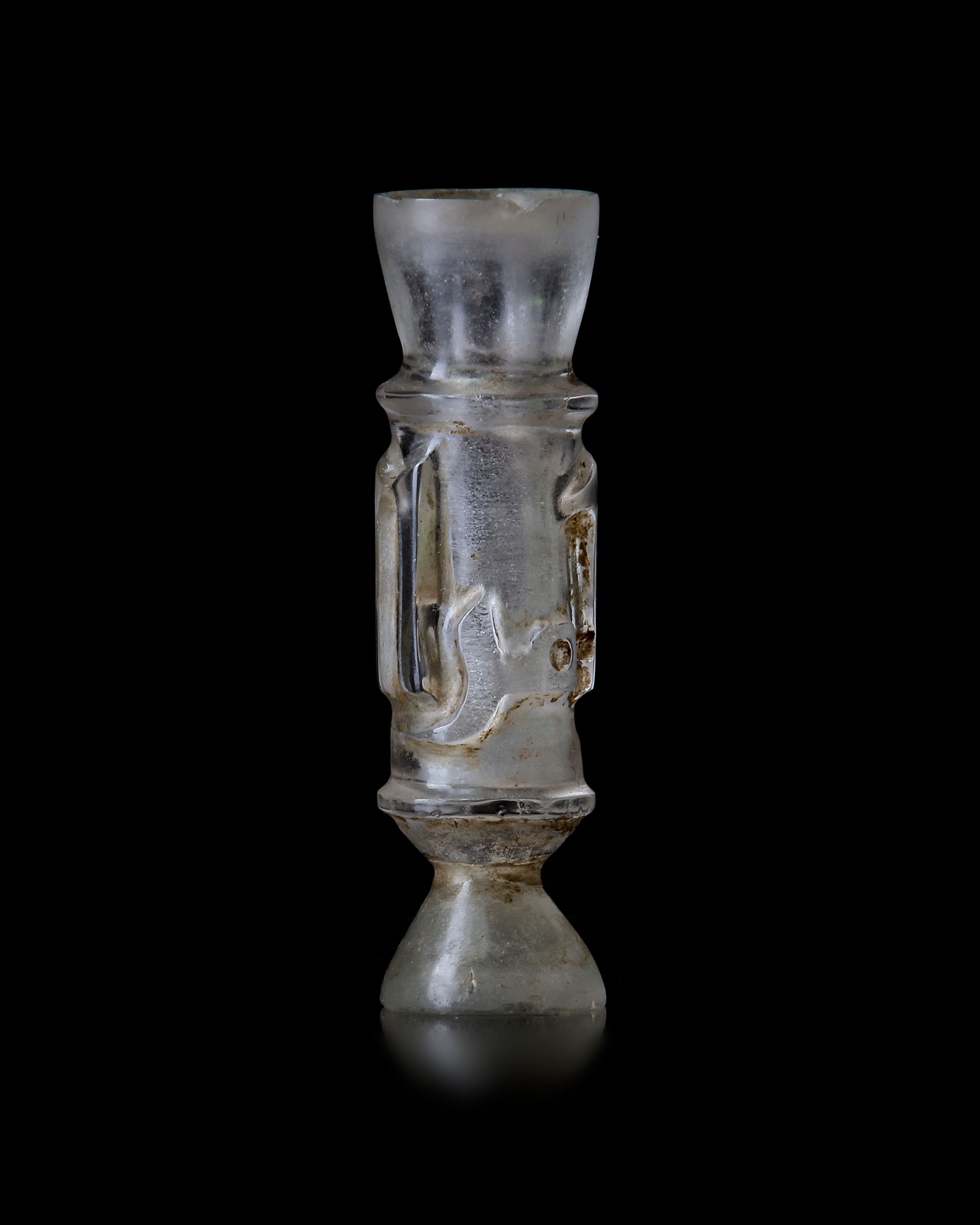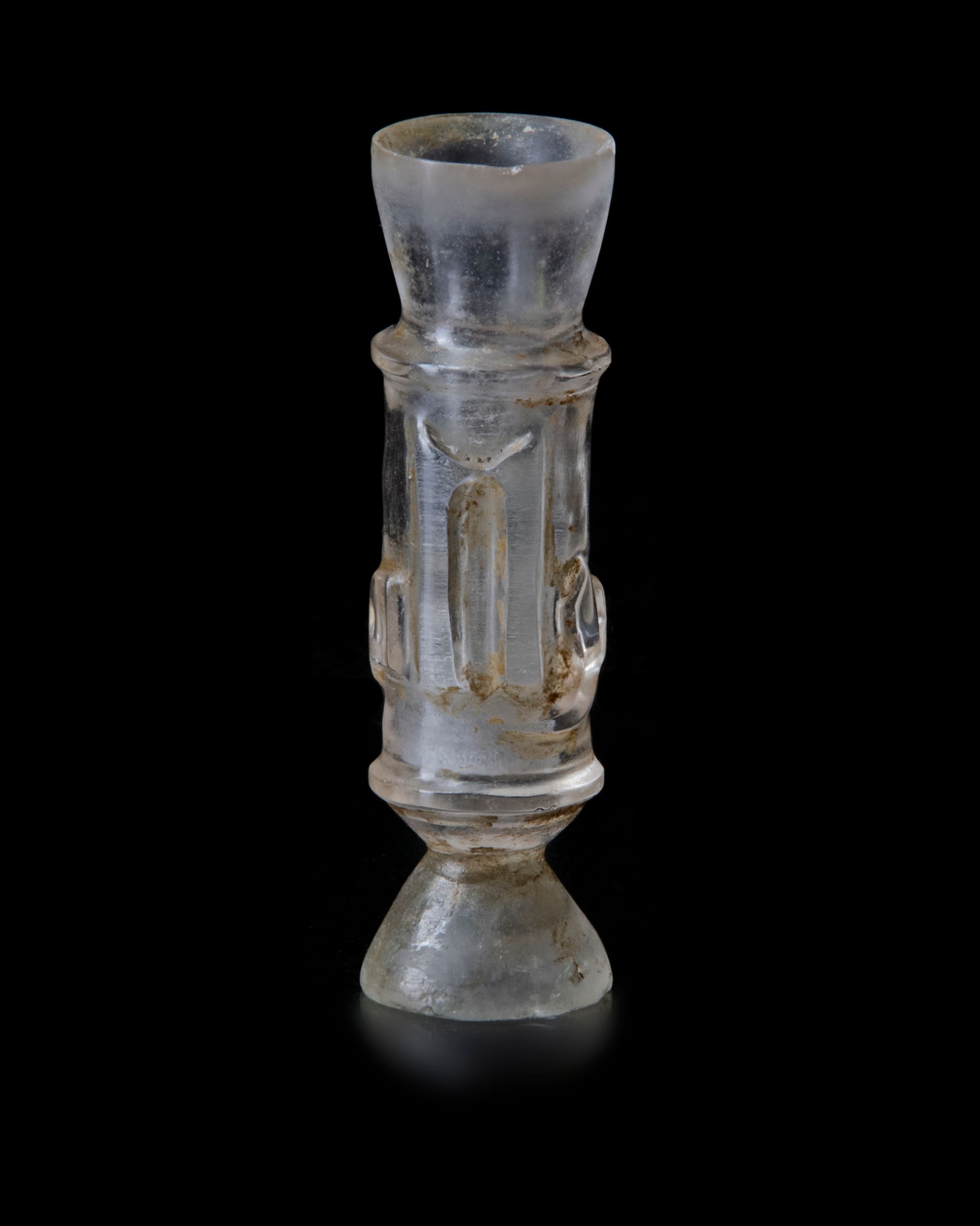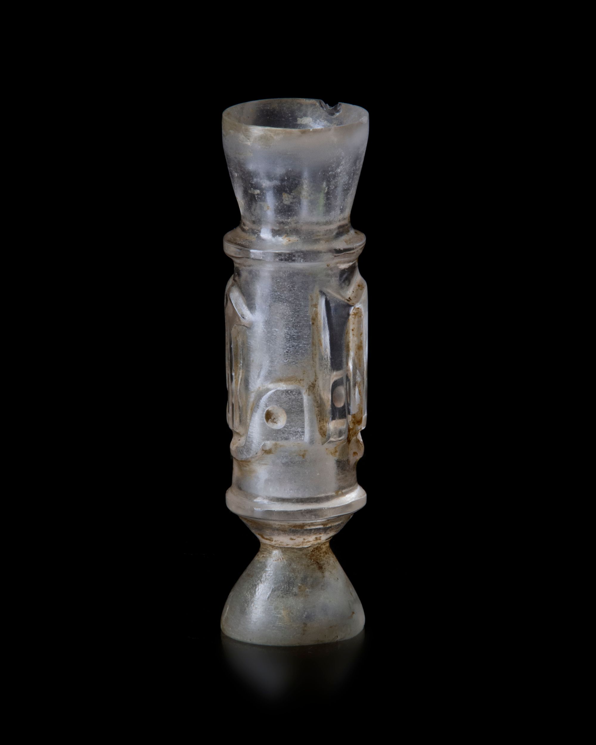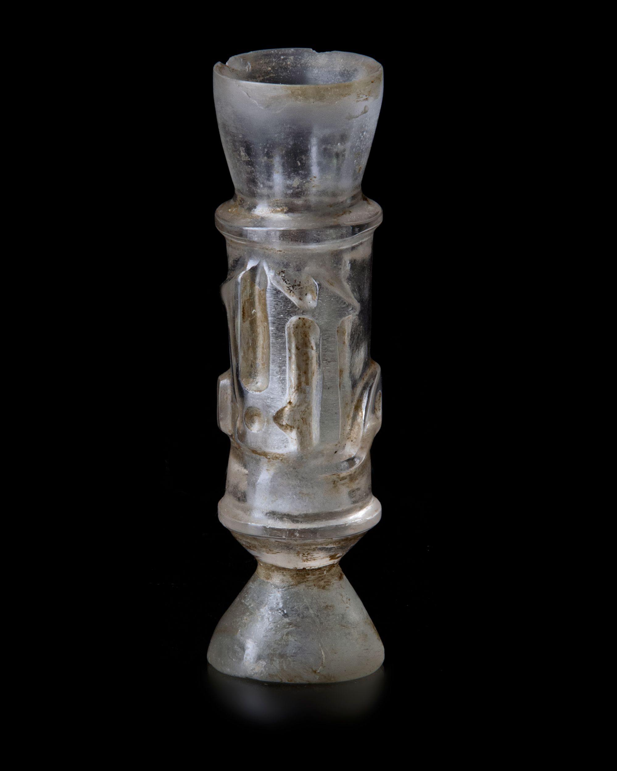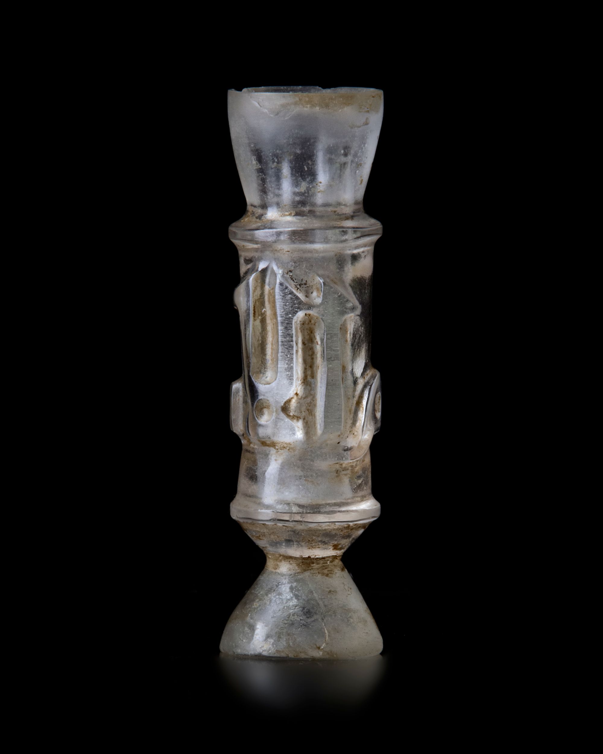 CATALOGUE NOTE Small rock crystal like this bottle could not have held much, but their contents must have been very precious indeed to deserve such containers. They were most probably used for storing perfumes, which were among the most luxurious times of any Islamic court. They often survive in cathedral treasuries, where they were rededicated after being captured from their original Islamic settings. • R.H. Pinder Wilson writes: "Rock crystals together with woven silks were the first objects to reach Europe and to reveal to the West the artistic achievements of the Islamic world. It is, therefore, surprising that Islamic rock crystals have been the subject of systematic study only since 1912 when Robert Schmidt published eighty-three crystals. Since then, thanks to C.J. Lamm and Kurt Erdmann, the total number of known Islamic rock crystals stands at just under one hundred and eighty." (B.W. Robinson et al., Islamic Art in the Keir Collection, London, 1988, p.289). Since then, a small number of Islamic rock crystal items have appeared on the art market, bringing the total to approximately two hundred.