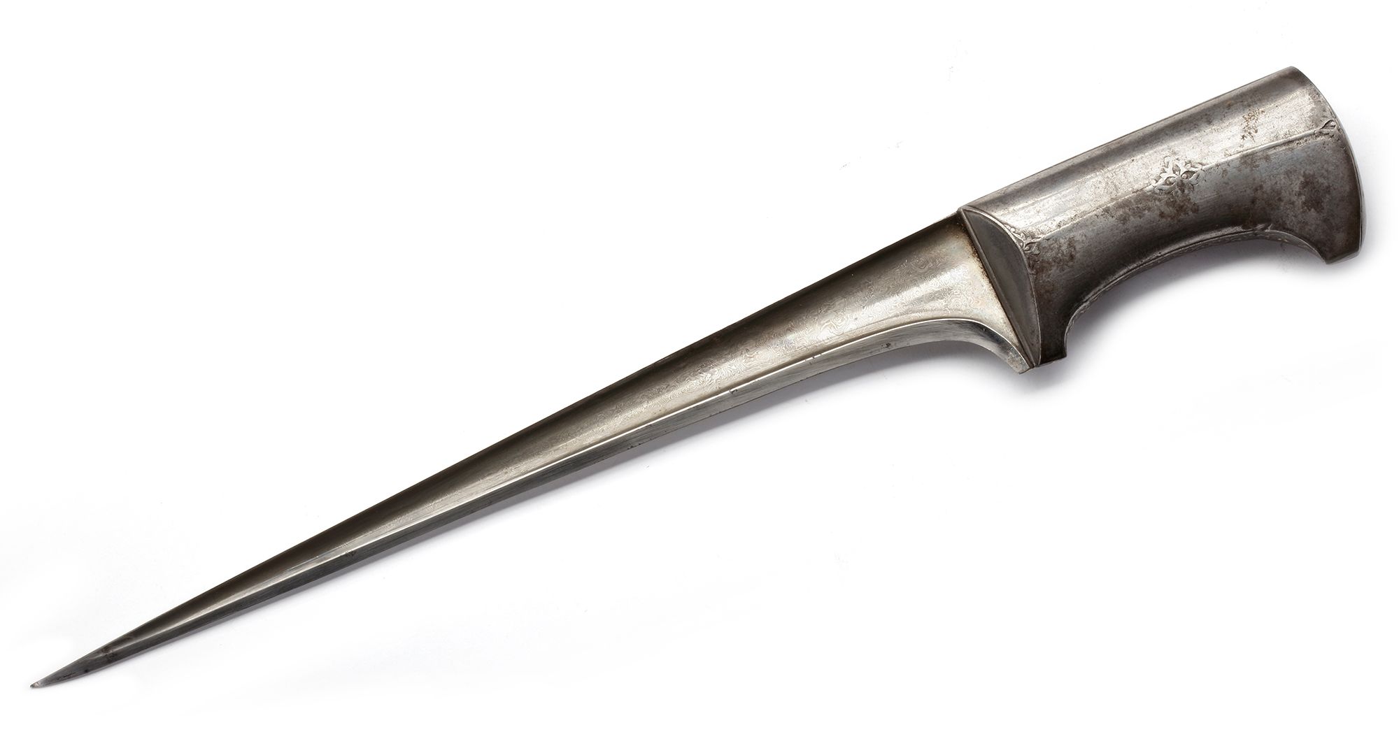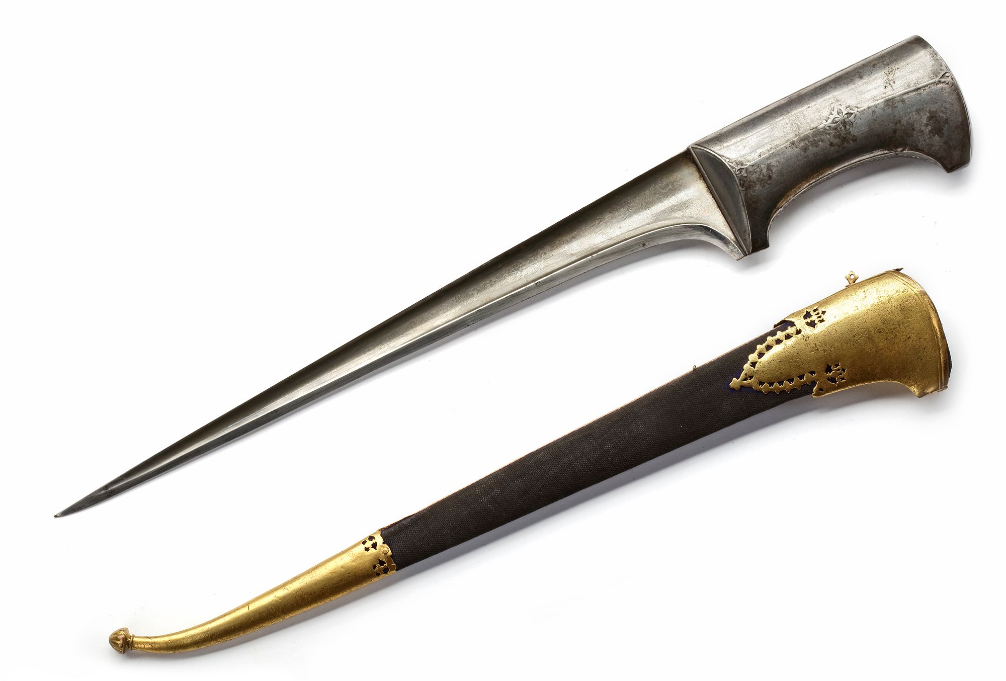 The fine watered-steel ’T’ section blade with single edge and flattened spine, the steel hilt decorated with a central quatrefoil motif and two half quatrefoils all conjoined by a central ridge, the two edges of the grip with engraved and gilded undulating foliate vines, the upper vine terminating in a palmette at the spine of the blade, the wood scabbard clad in blue velvet with gilt copper fitting to each end. 44.3 cm. 49.5 cm. including sheath.