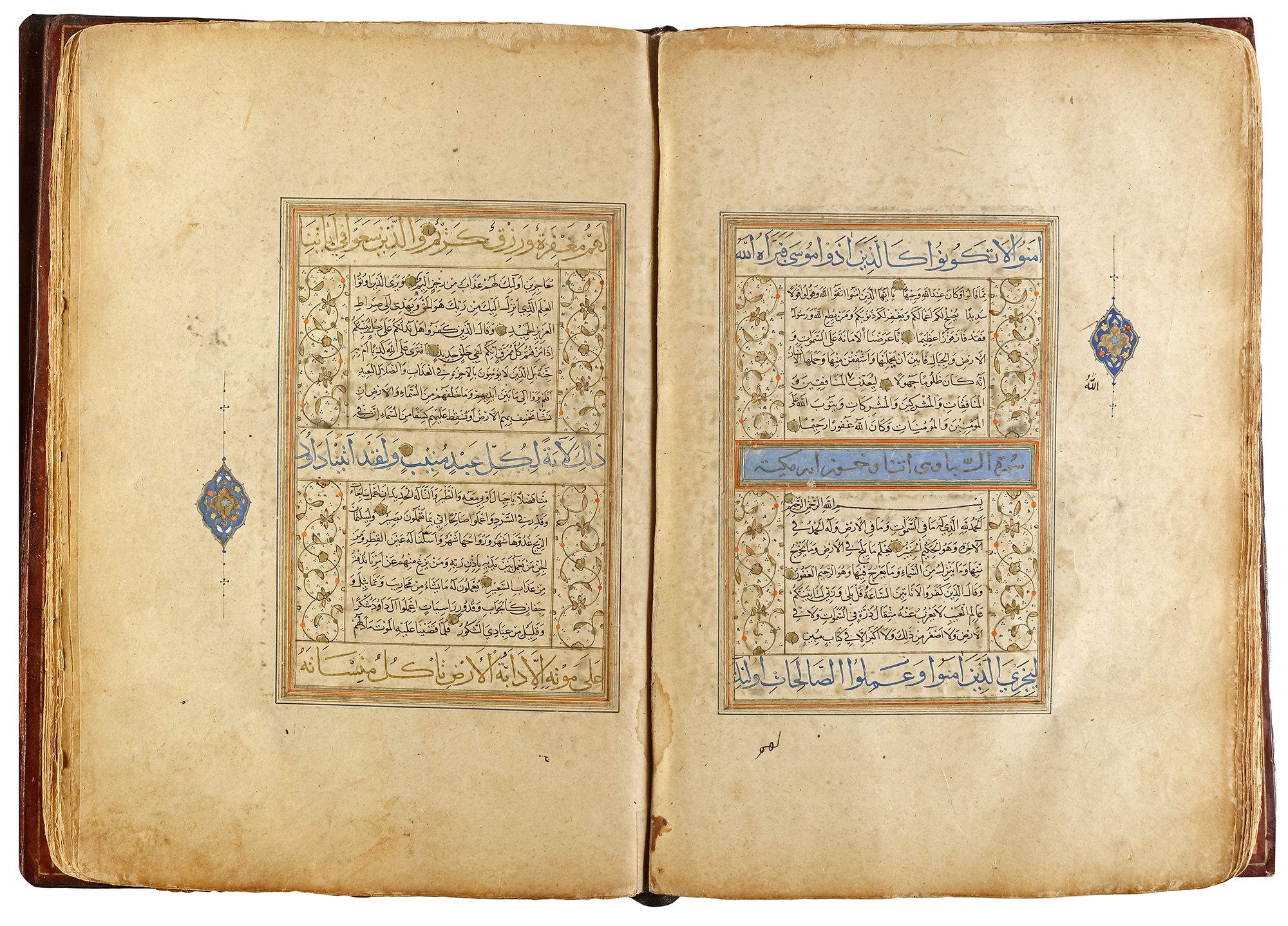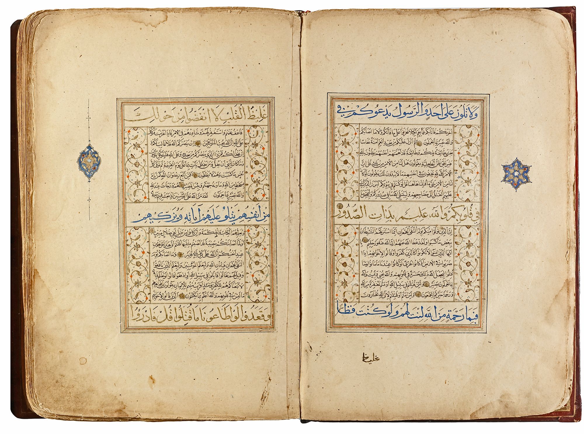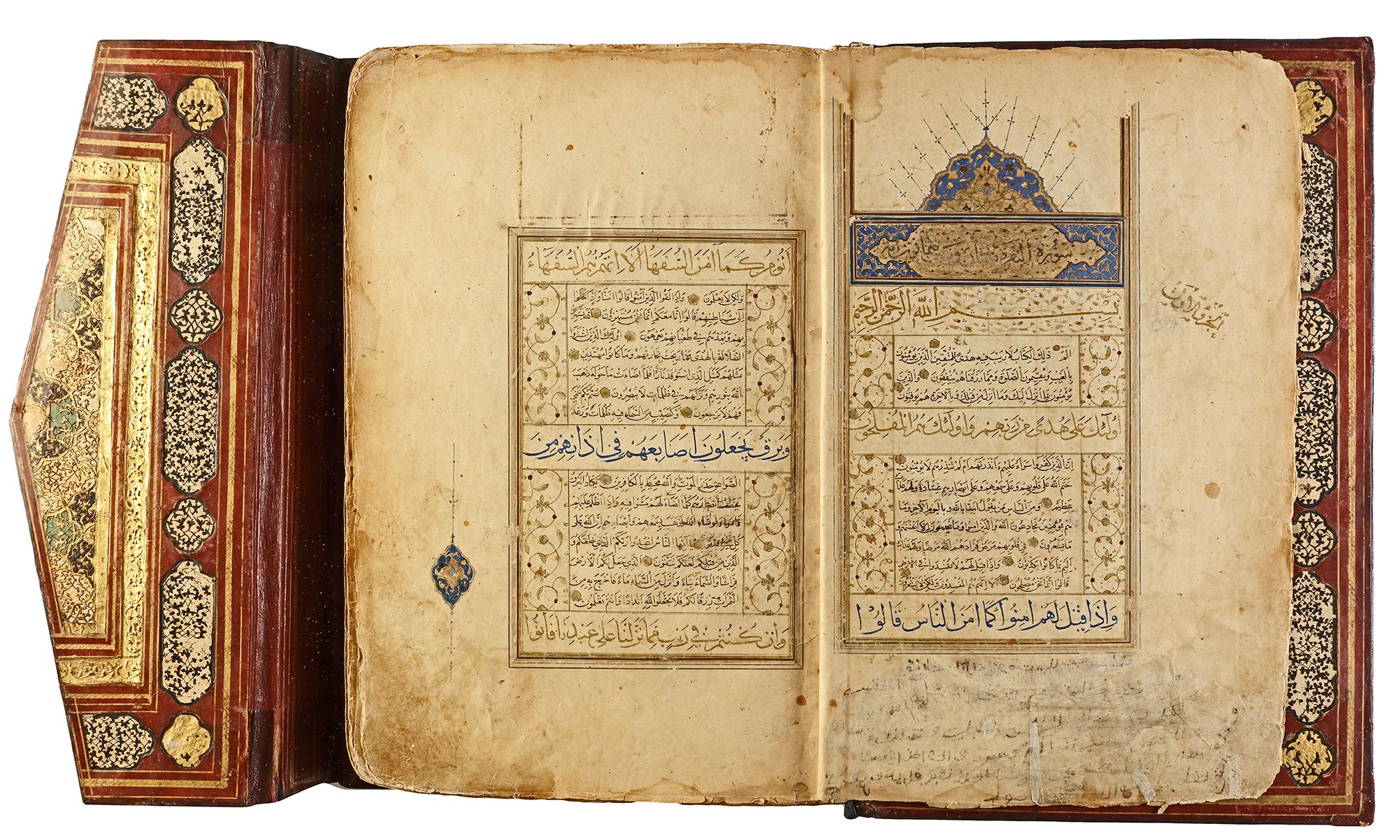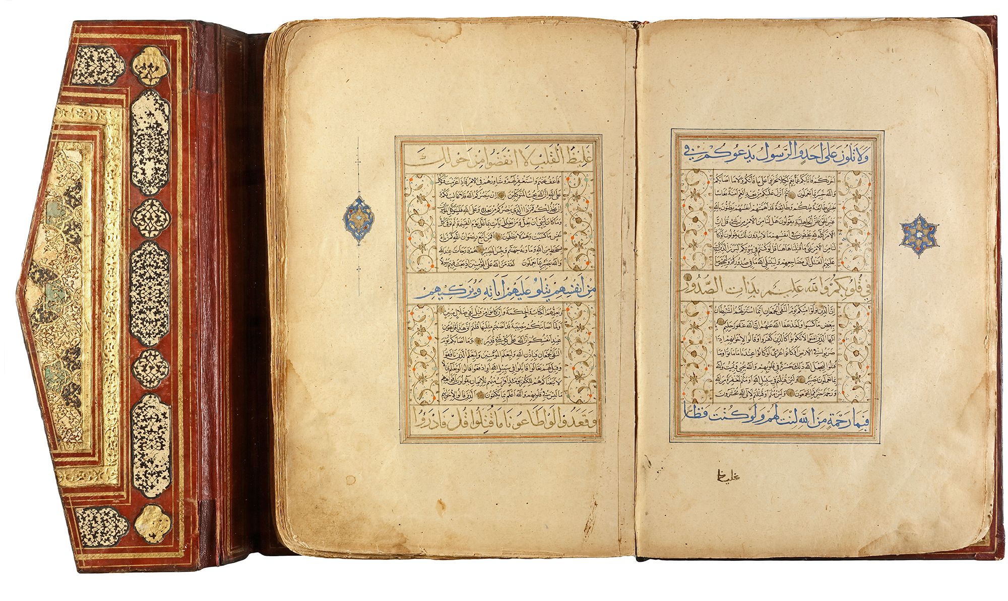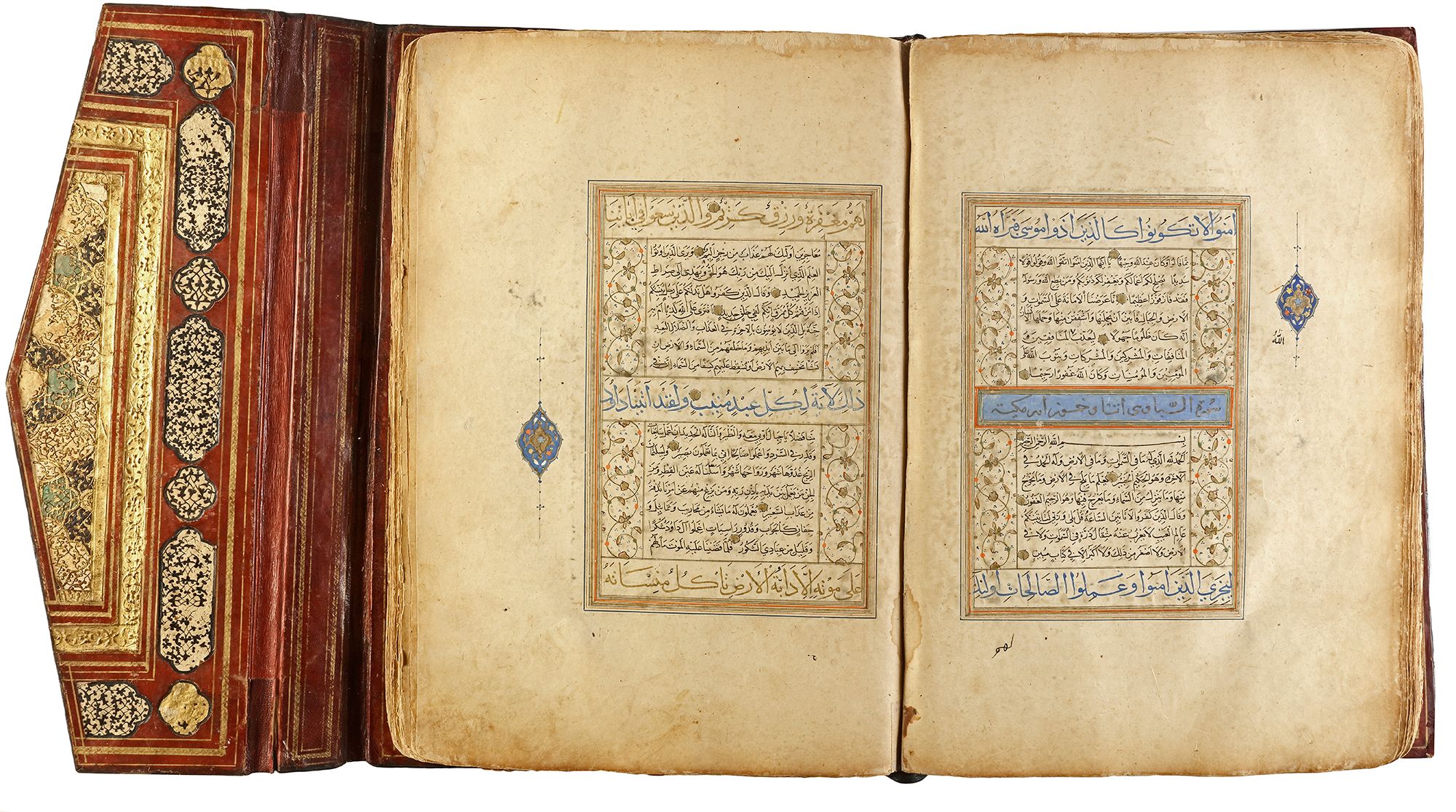 Arabic manuscript on paper, 241 leaves plus one fly-leaf, each folio with 14 lines of small black naskh script divided in two panels and three larger lines of alternating gold and blue muhaqqaq script, the naskh framed by gold flowering scrolls, text panels ruled in gold and polychrome borders, gold roundel verse markers outlined in black, surah headings in thuluth script within cartouches of blue ground, later catchwords, opening biofolio with dense gold and polychrome illumination surrounding light blue cartouches containing gold naskh script, the following folio with similarly illuminated headpiece. in contemporaneous brown morocco binding with flap, the exterior with gilt-stamped panels decorated with animals in a flowering landscape, the doublures with elegant découpé on a ground of yellow, green, black and white, some damages. Text panel 19.2 by 12.5 cm. Folio: 35.6 by 22.8 cm.