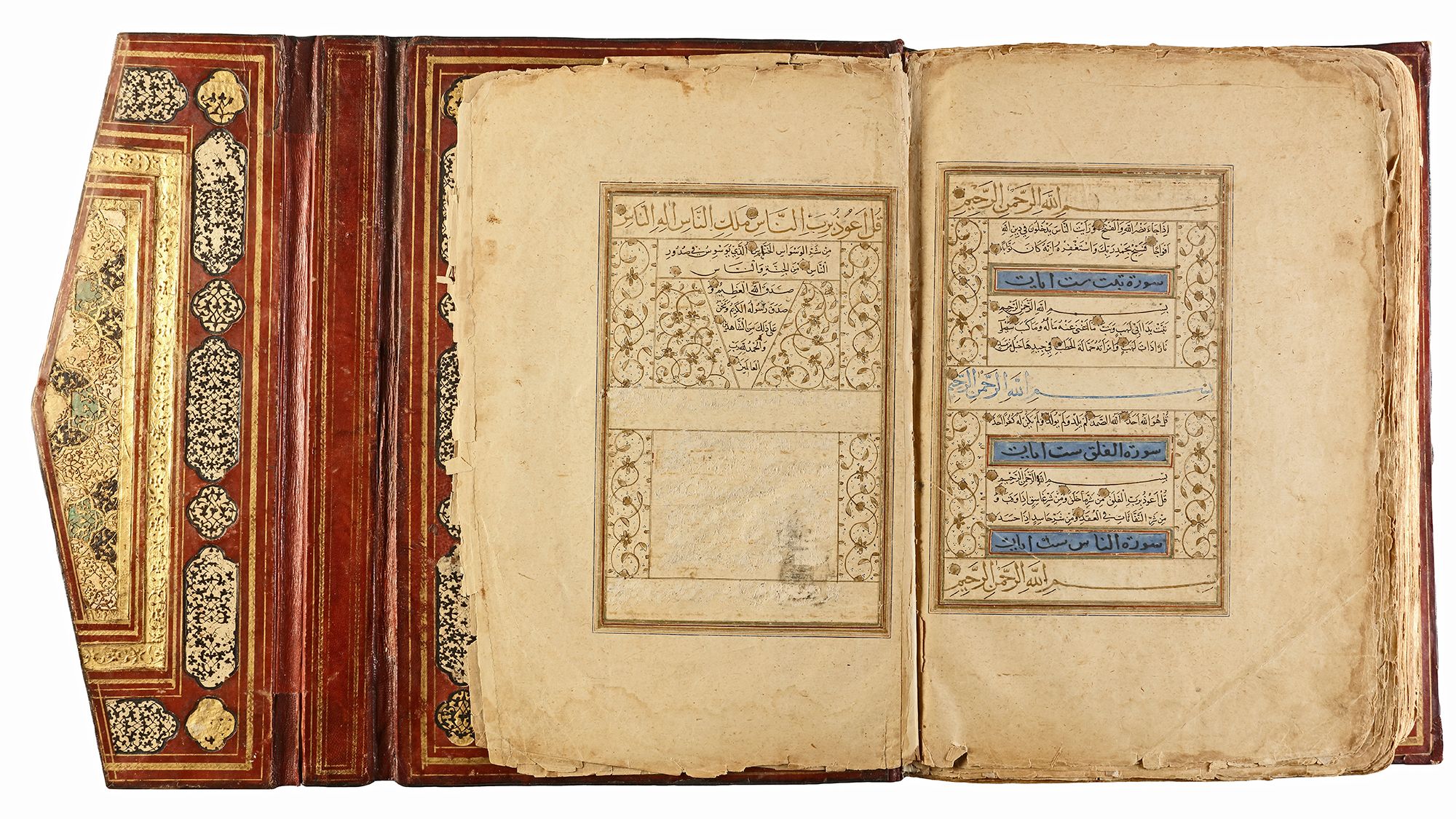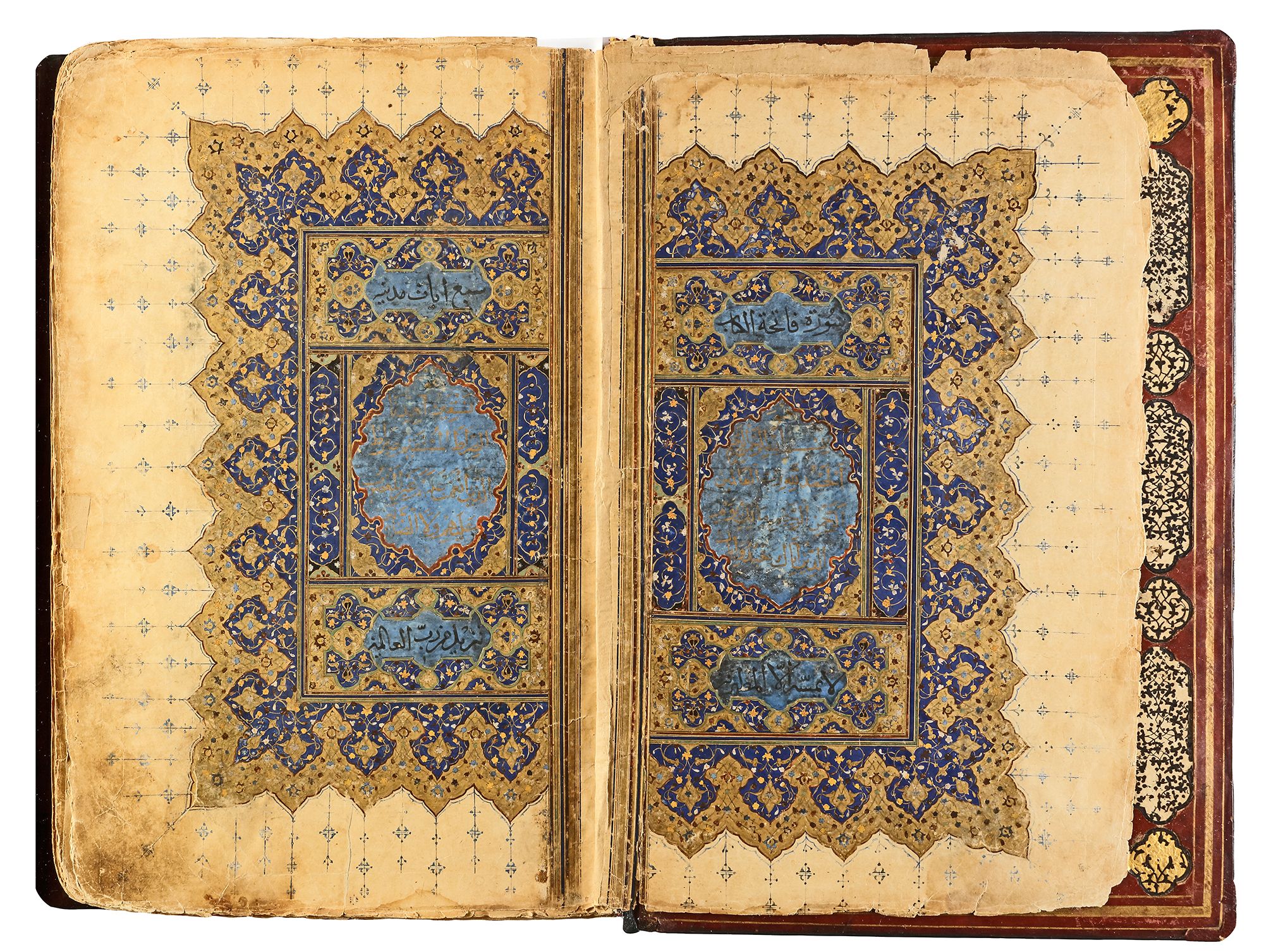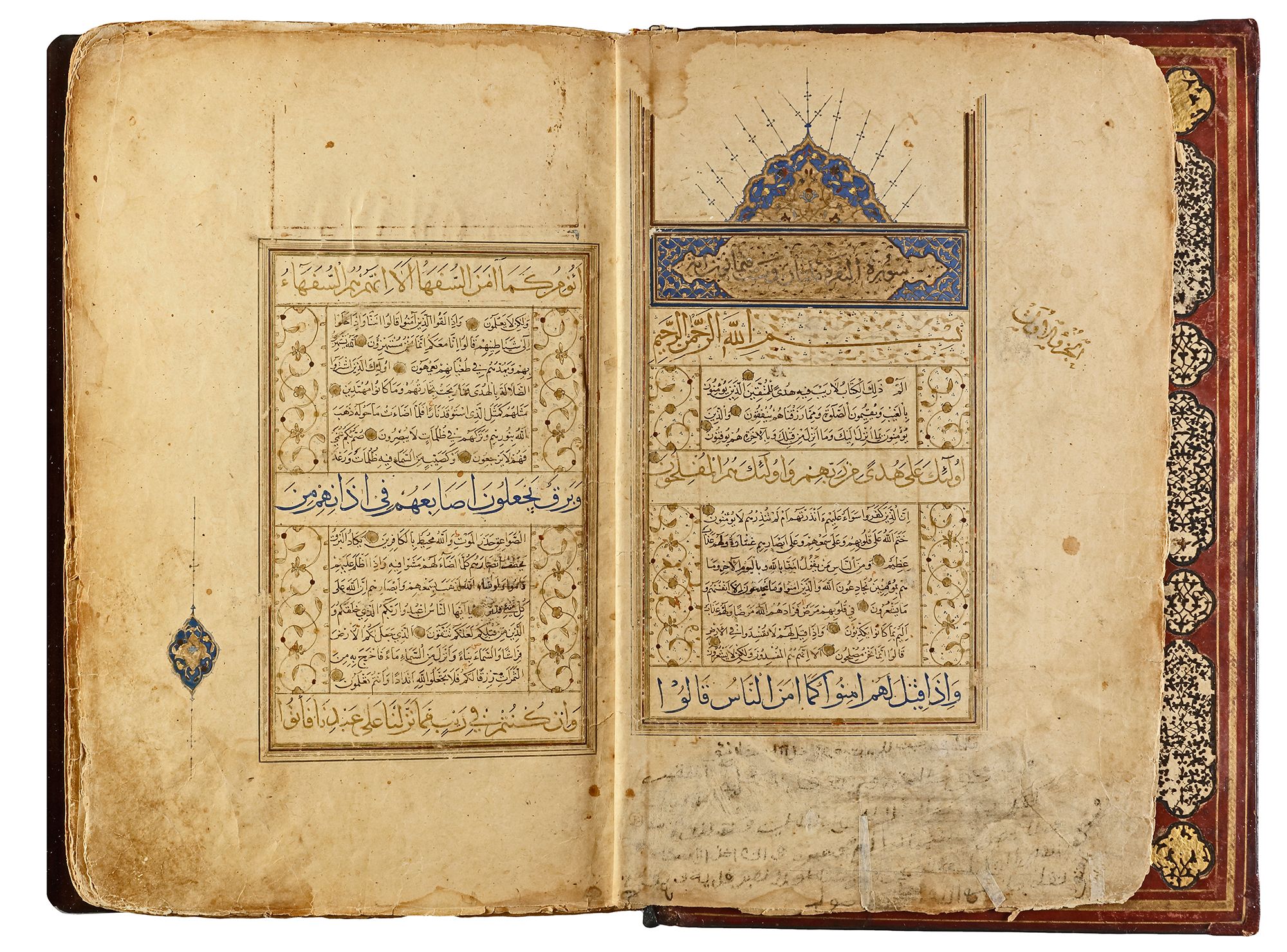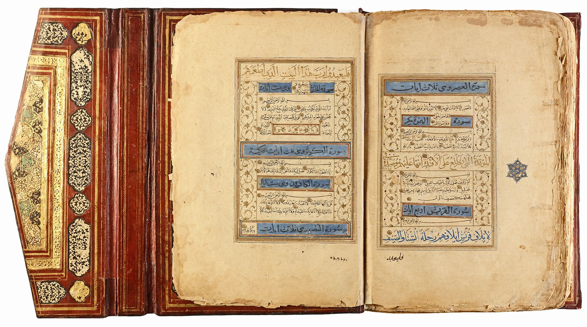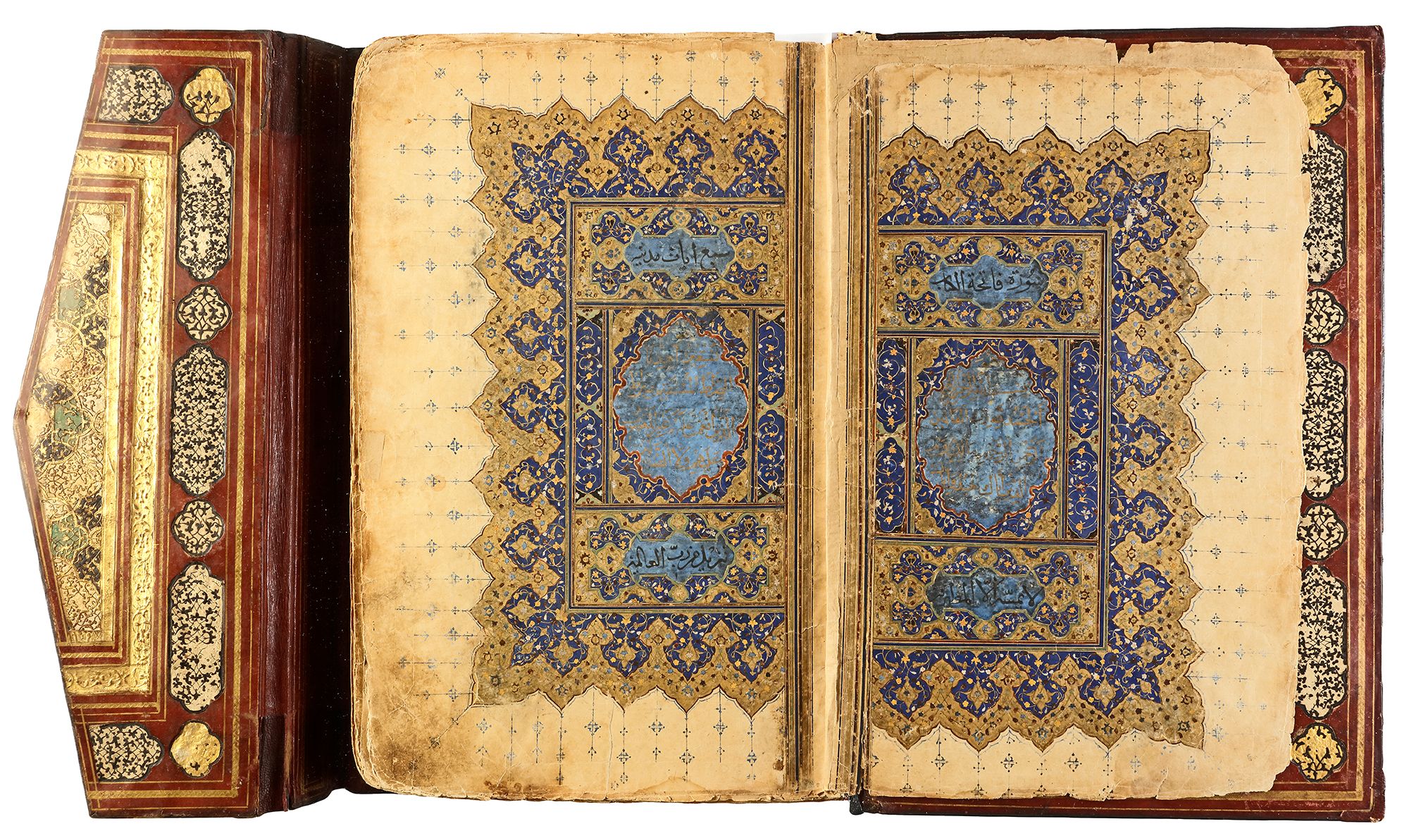 Arabic manuscript on paper, 241 leaves plus one fly-leaf, each folio with 14 lines of small black naskh script divided in two panels and three larger lines of alternating gold and blue muhaqqaq script, the naskh framed by gold flowering scrolls, text panels ruled in gold and polychrome borders, gold roundel verse markers outlined in black, surah headings in thuluth script within cartouches of blue ground, later catchwords, opening biofolio with dense gold and polychrome illumination surrounding light blue cartouches containing gold naskh script, the following folio with similarly illuminated headpiece. in contemporaneous brown morocco binding with flap, the exterior with gilt-stamped panels decorated with animals in a flowering landscape, the doublures with elegant découpé on a ground of yellow, green, black and white, some damages. Text panel 19.2 by 12.5 cm. Folio: 35.6 by 22.8 cm.