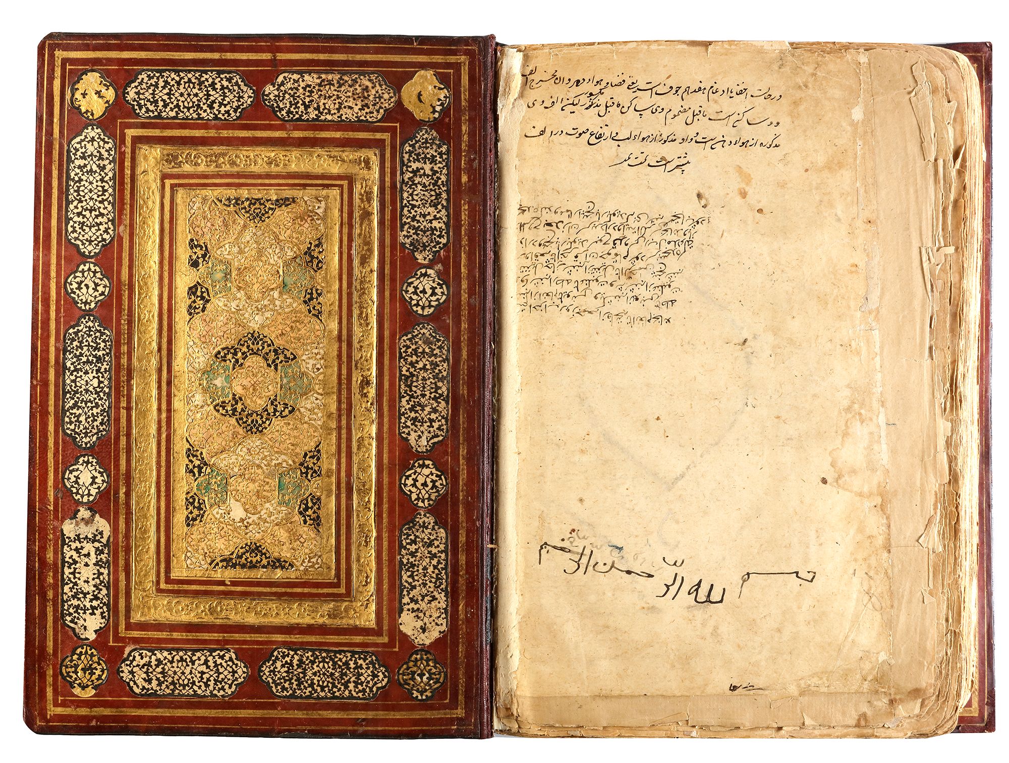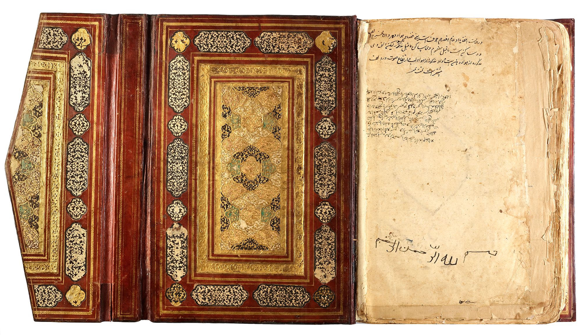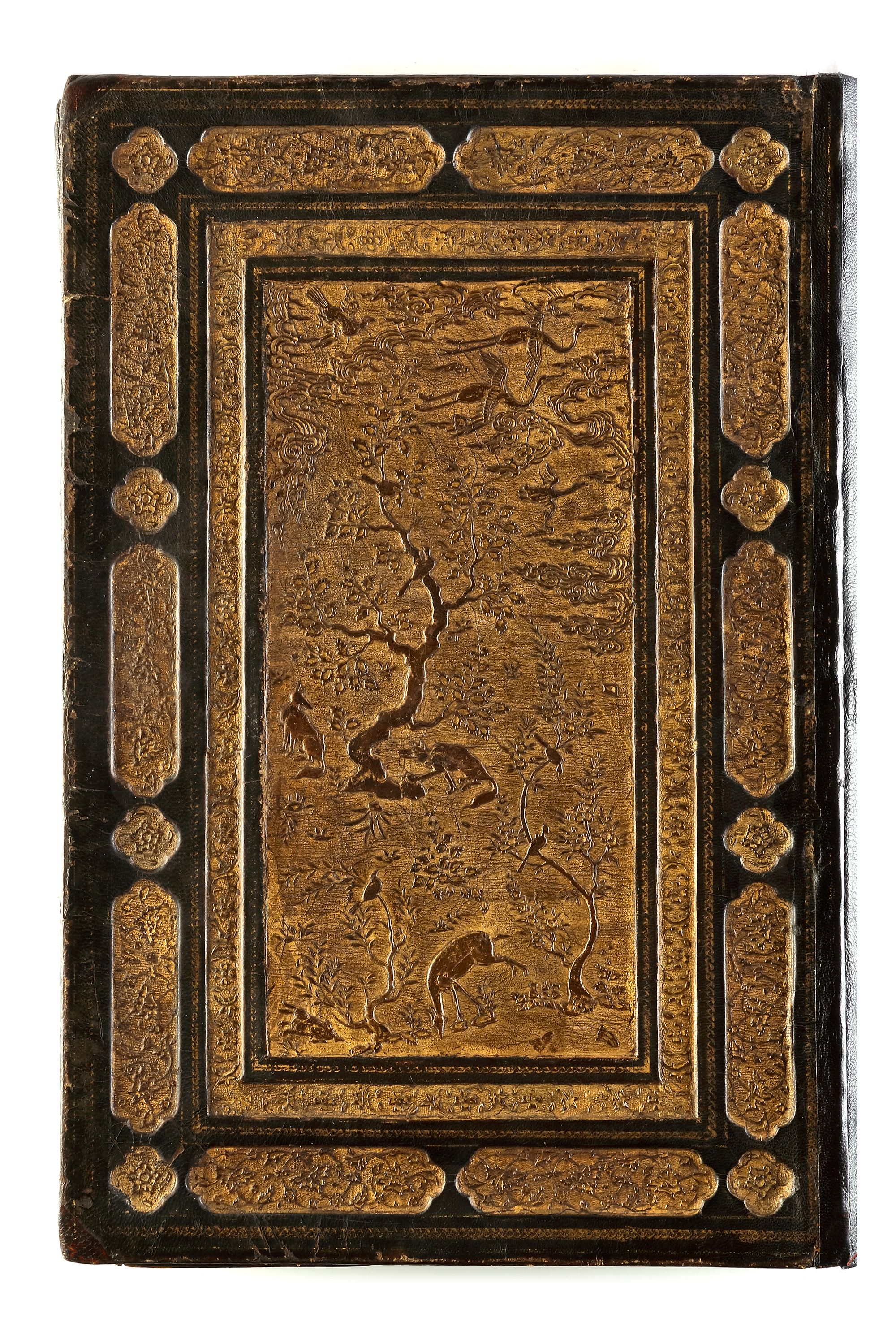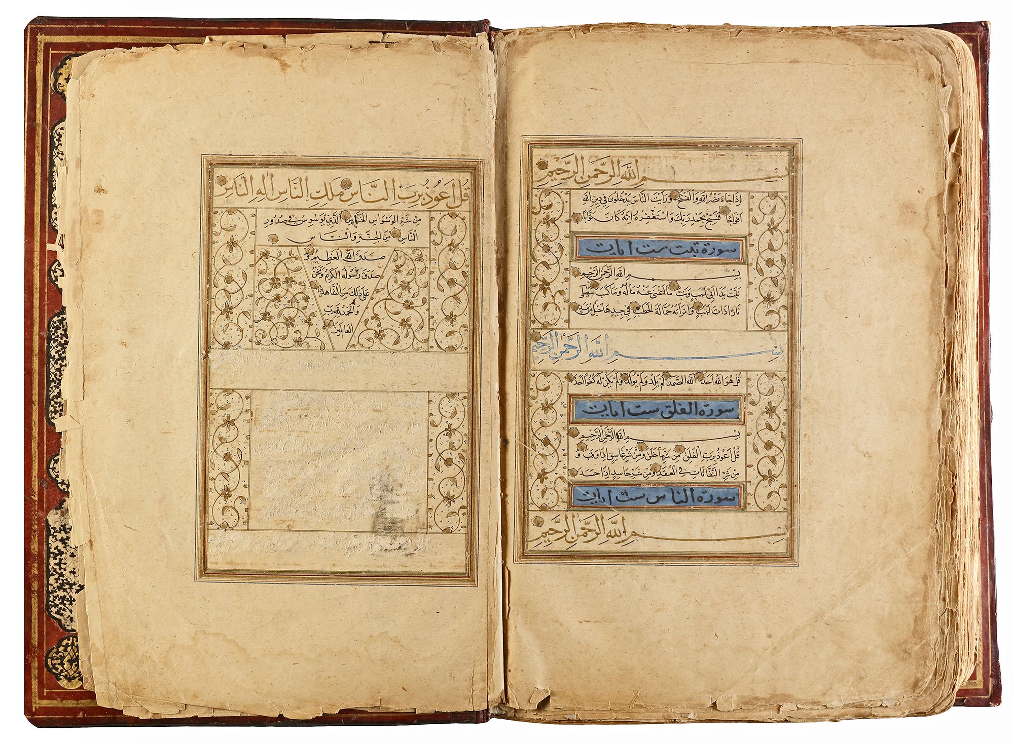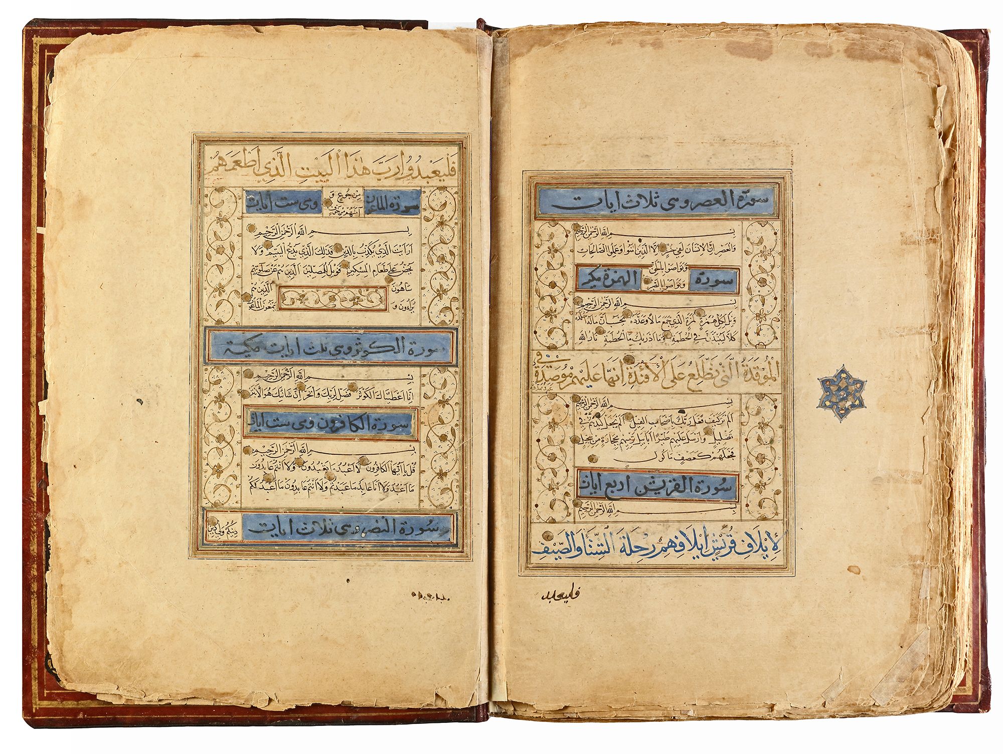 Arabic manuscript on paper, 241 leaves plus one fly-leaf, each folio with 14 lines of small black naskh script divided in two panels and three larger lines of alternating gold and blue muhaqqaq script, the naskh framed by gold flowering scrolls, text panels ruled in gold and polychrome borders, gold roundel verse markers outlined in black, surah headings in thuluth script within cartouches of blue ground, later catchwords, opening biofolio with dense gold and polychrome illumination surrounding light blue cartouches containing gold naskh script, the following folio with similarly illuminated headpiece. in contemporaneous brown morocco binding with flap, the exterior with gilt-stamped panels decorated with animals in a flowering landscape, the doublures with elegant découpé on a ground of yellow, green, black and white, some damages. Text panel 19.2 by 12.5 cm. Folio: 35.6 by 22.8 cm.