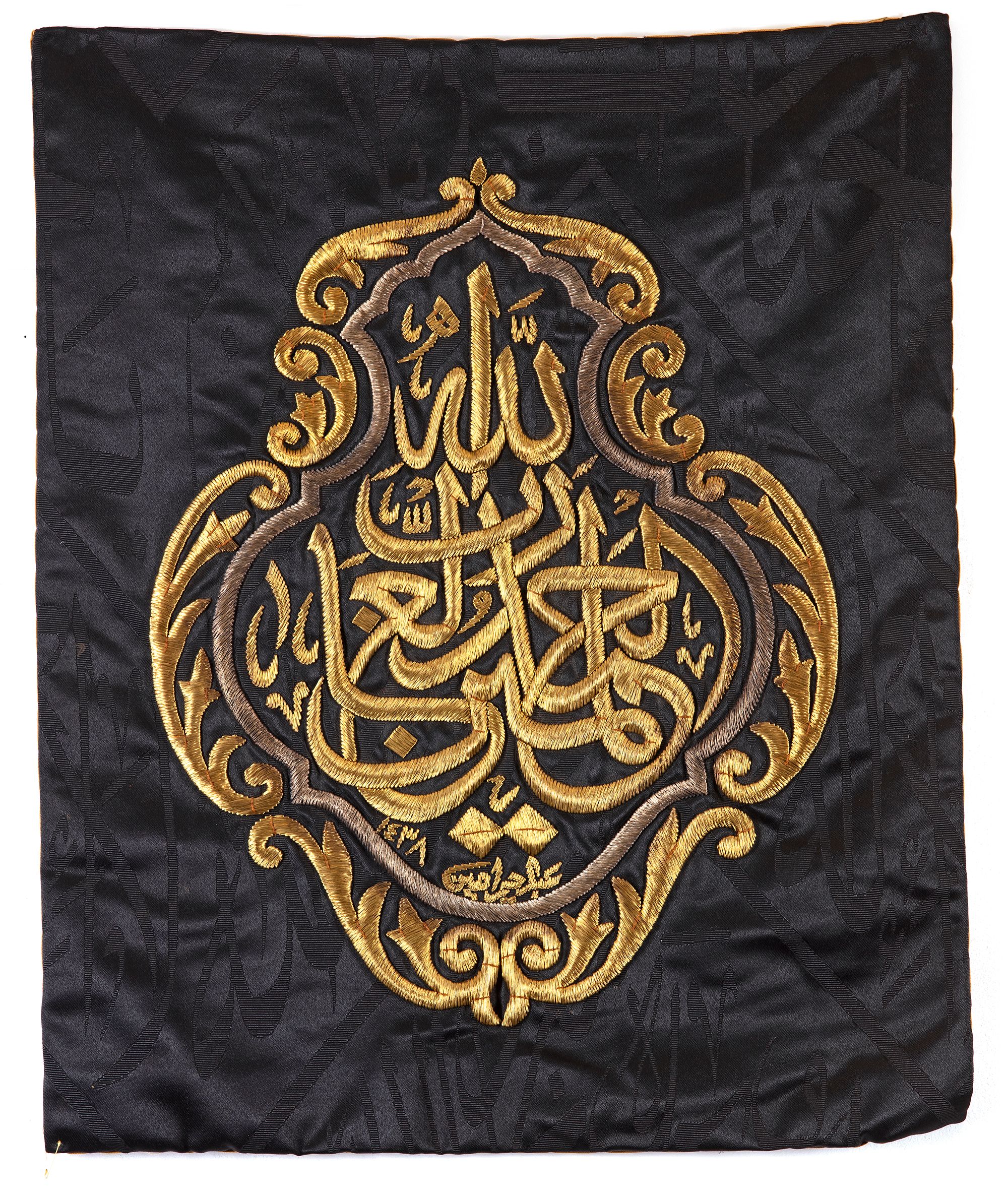 A black Kaaba kiswa brocade or samadiyah, of square form placed always on the four corners of the Kaaba. Embellished in silver and gilt wires on a black silk ground with Al-Basmalah and a large roundel of in thuluth script Quran 112 surah Al-Ikhlas or Al-Tawhid, All surrounded by flower sprigs and arabesque a black silk ground that embroidered with bands containing Kalimat Al-Tawhid. 77 by 64 cm.