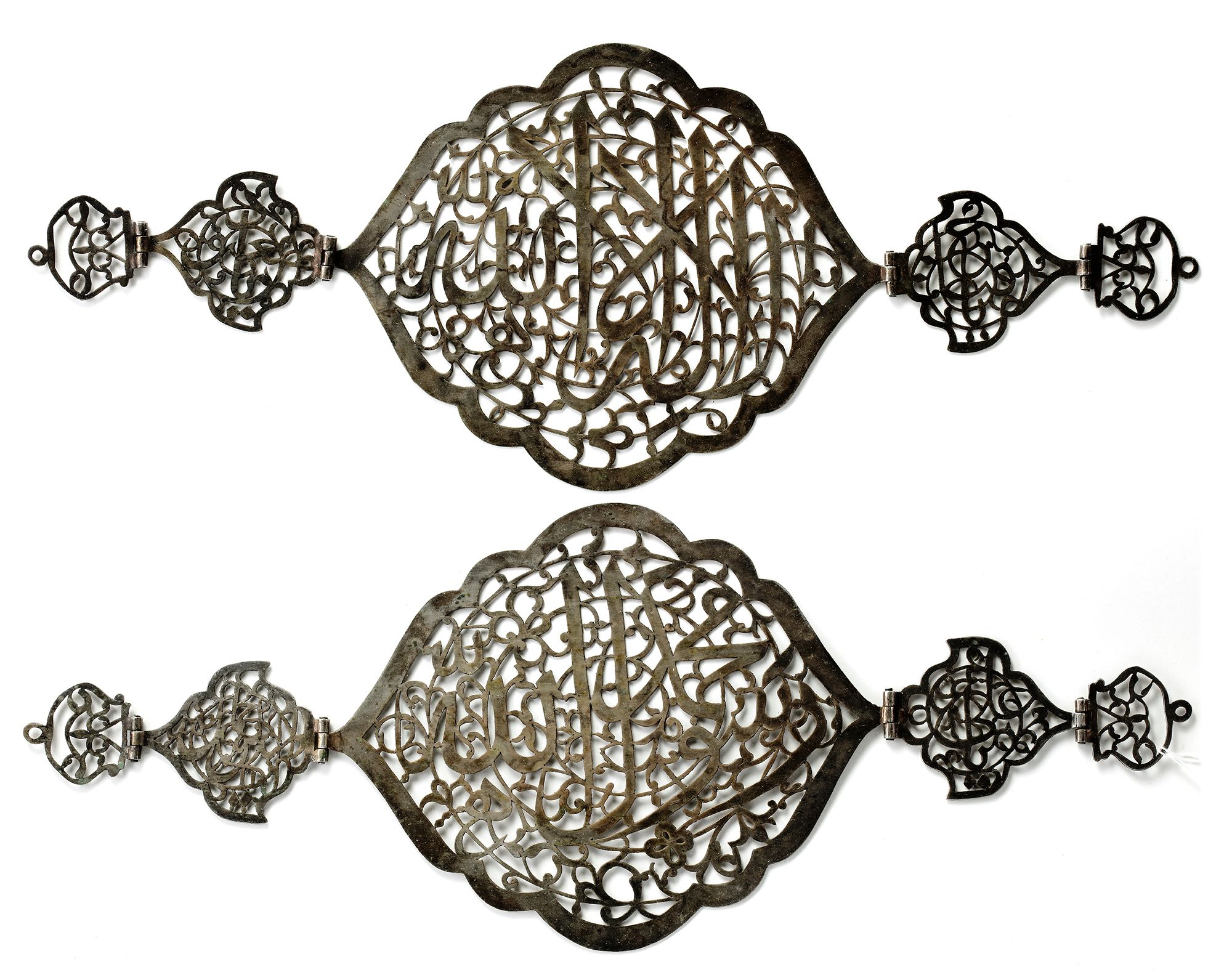 In the form of a lobed cartouche, finely pierced with inscriptions in thuluth script of ‘Kalimaat Al-Tawhid’ on a ground of scrolling vines issuing flowerheads and split-palmettes.