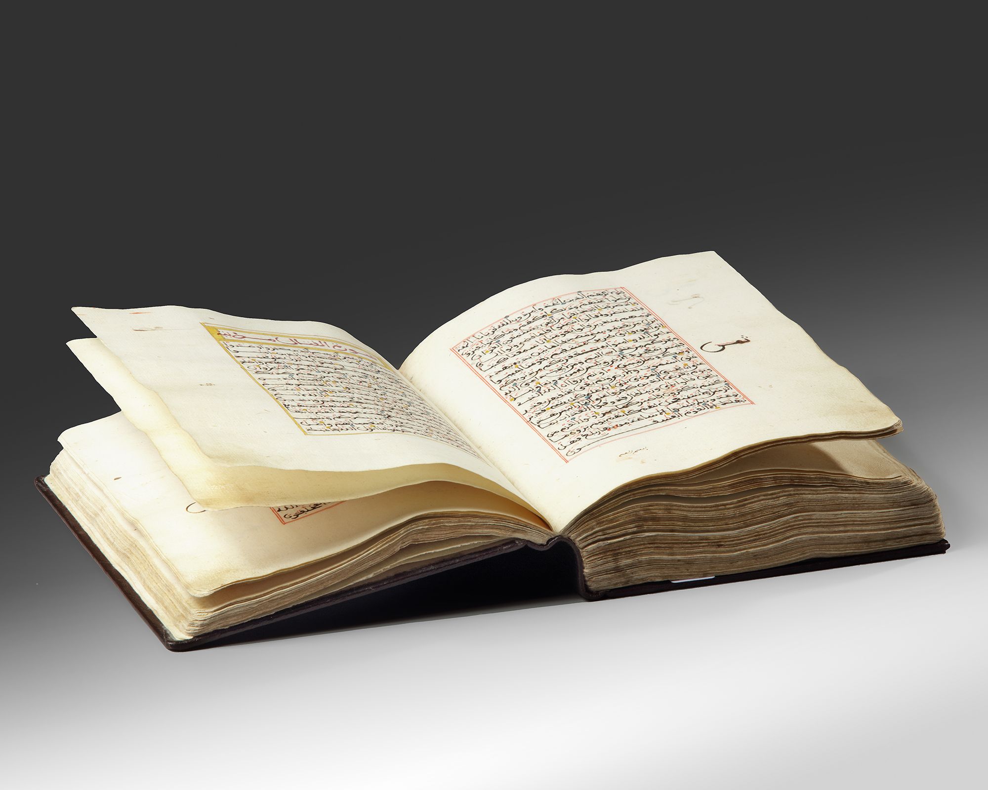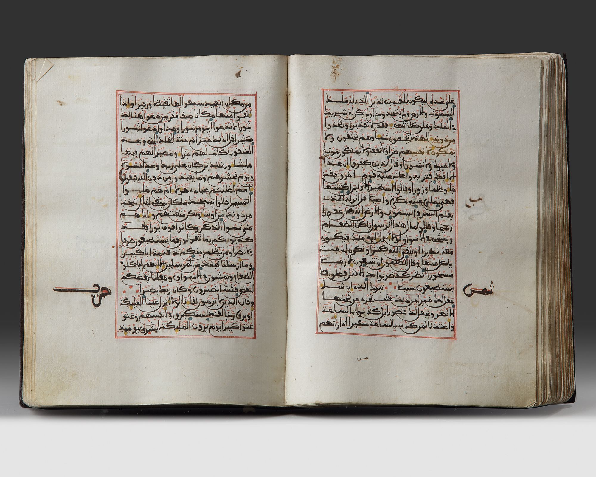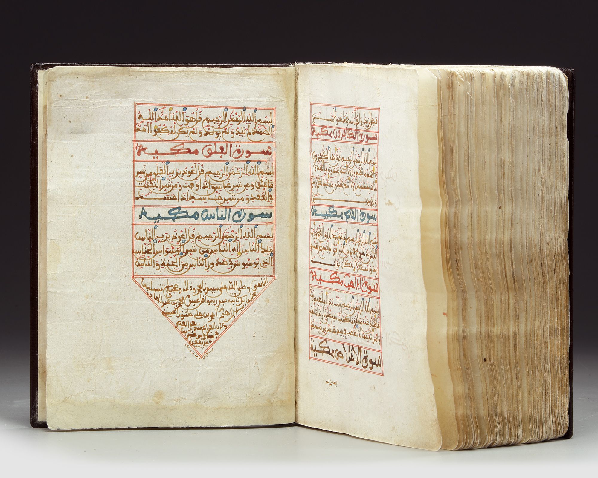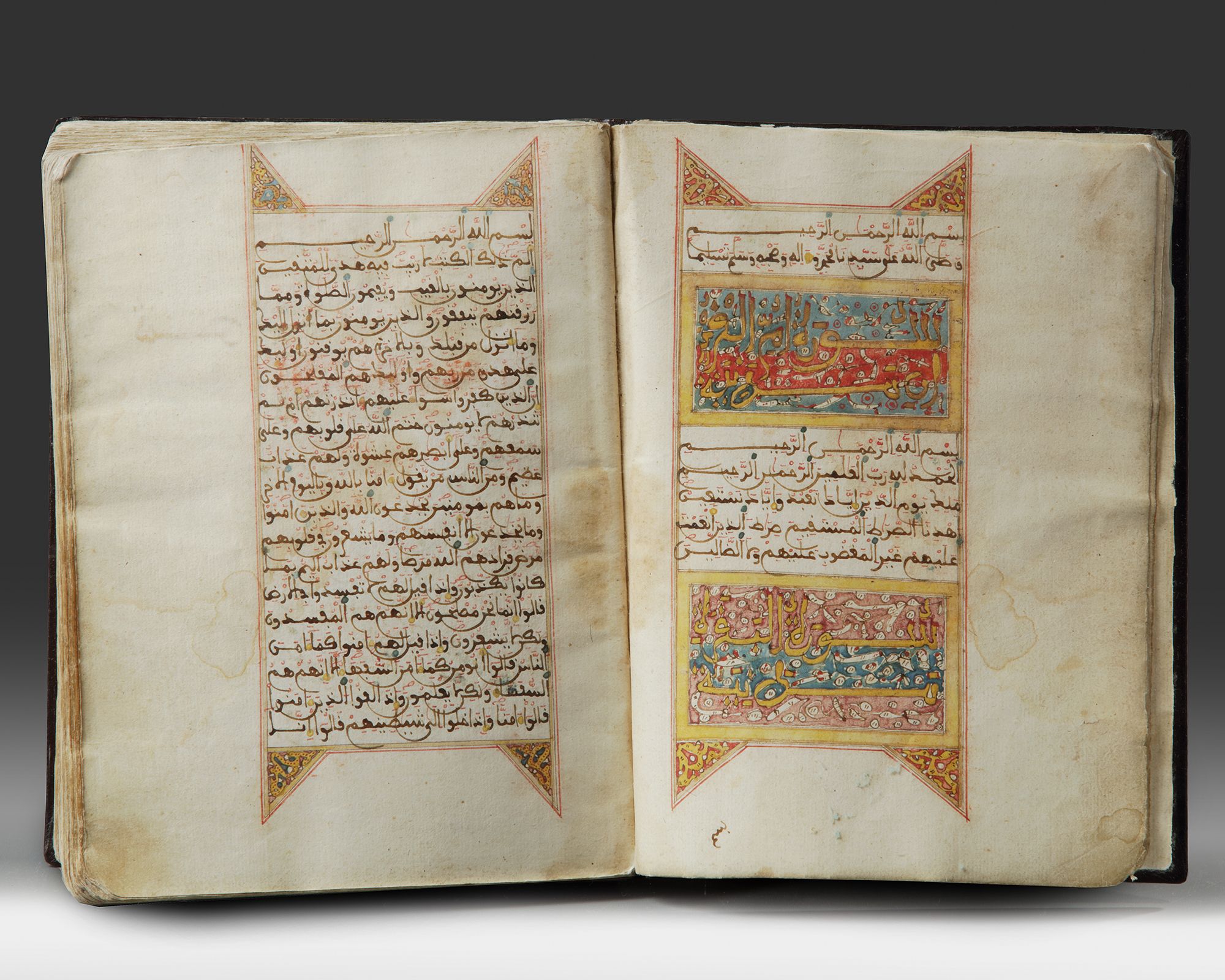 Signed Muhammad Bin 'Abd Al-Qadir Bin Ibrahim Bin Ahmad Bin [..] Al-Hasani, North Africa, probably Morocco, dated 26 DHU Al-Qa'da AH 1197/23 October 1783 AD. Arabic manuscript on paper, 270ff. plus six fly-leaves, each folio with 19ll. of black maghribi script, with red and blue reading marks, red vocalization, sura hearings in red within polychrome cartouhe, text within double red rules, with marginal markers in maghribi, catchwords, opening bifolio with polychrome illuminated panels and title cartouches, colophon signed and dated, in stamped brown morocco Text panel 5 3/8 x 3in. (13.8 x 7.6cm.); folio 8 x 5 ¾in. (20.4 x 14.5cm.)