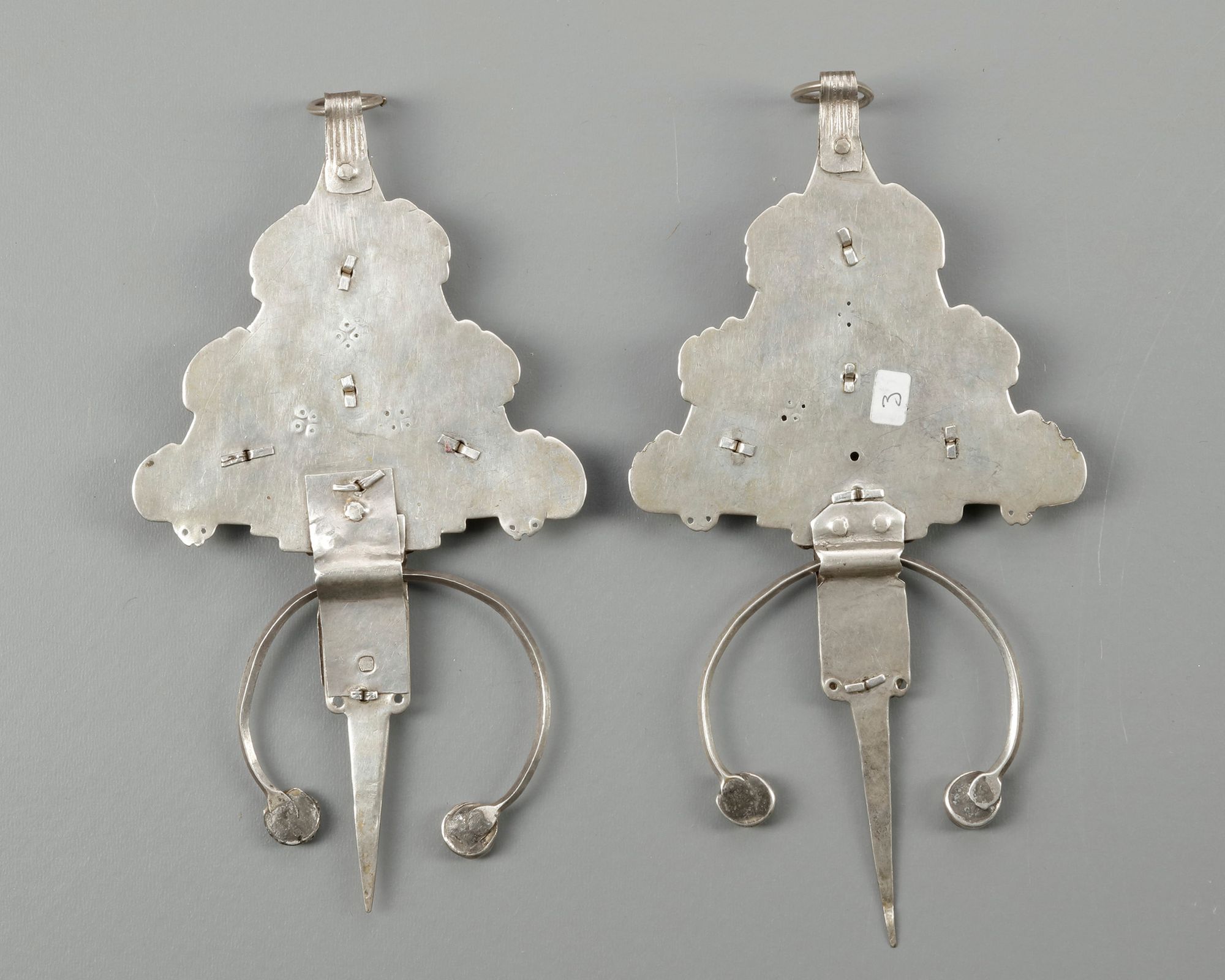 Fibulae were commonly worn by women as an everyday adornment whilst going about daily work as well as on special occasions. It is essentially a cloak fastener, comprising an ornate metal triangular, round or oval shape with detailed etchings in filigree or enamel, and a pin which serves to fasten two layers of material together. They were usually worn as a pair. These type of Fibulae are worn by Berbers, the indigenous ethnic group of North Africa.