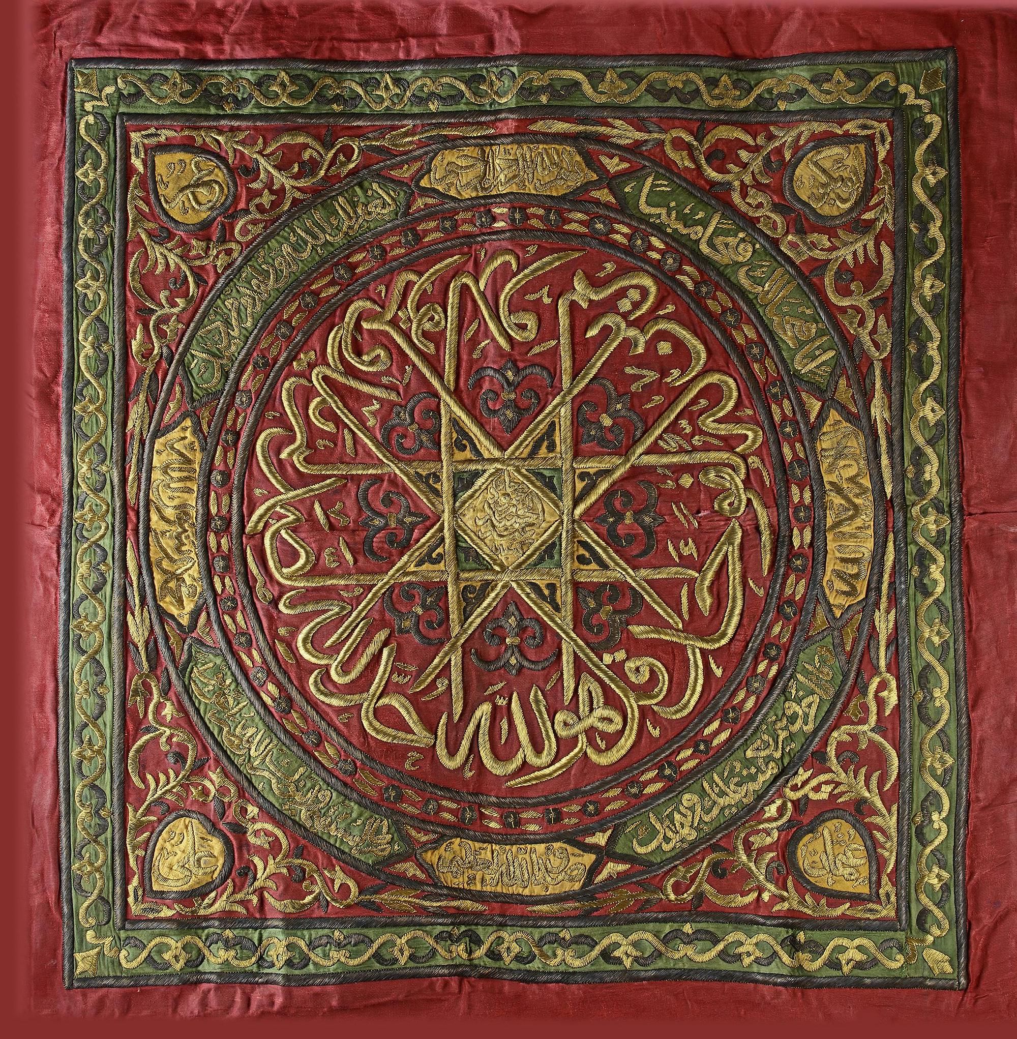 An Ottoman Kaaba kiswa brocade or samadiyah, of square form placed always on the four corners of the Kaaba. Embellished in silver and gilt wires on a red silk ground with a large roundel enclosing in thuluth script Quran 112 surah Al-Ikhlas or Al-Tawhid, the elongated ' Lams ' interpersed with each other forming geometric desgins enclosing the name of Mahmud II. Further with a circular band containing cartouches enclosing Quran 48 surah al-Fatḥ v.1-v.3 and Kalimaat Altawhid. All surrounded by flower sprigs and arabesque with roundels of the names of the four Rashidun Caliphs on a red and green ground. 125 by 125 cm.