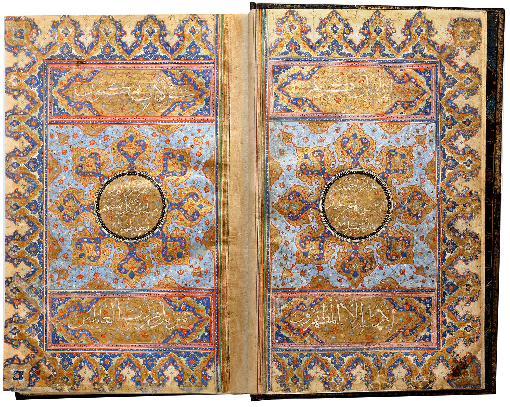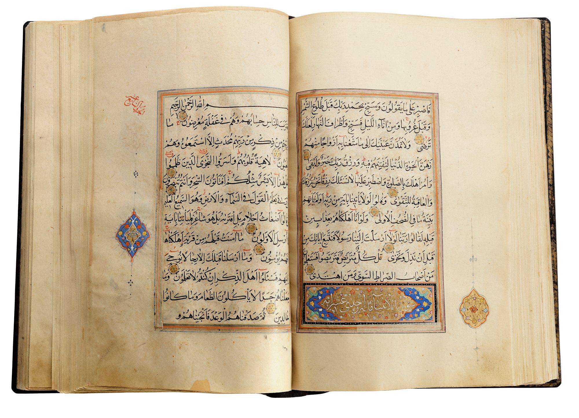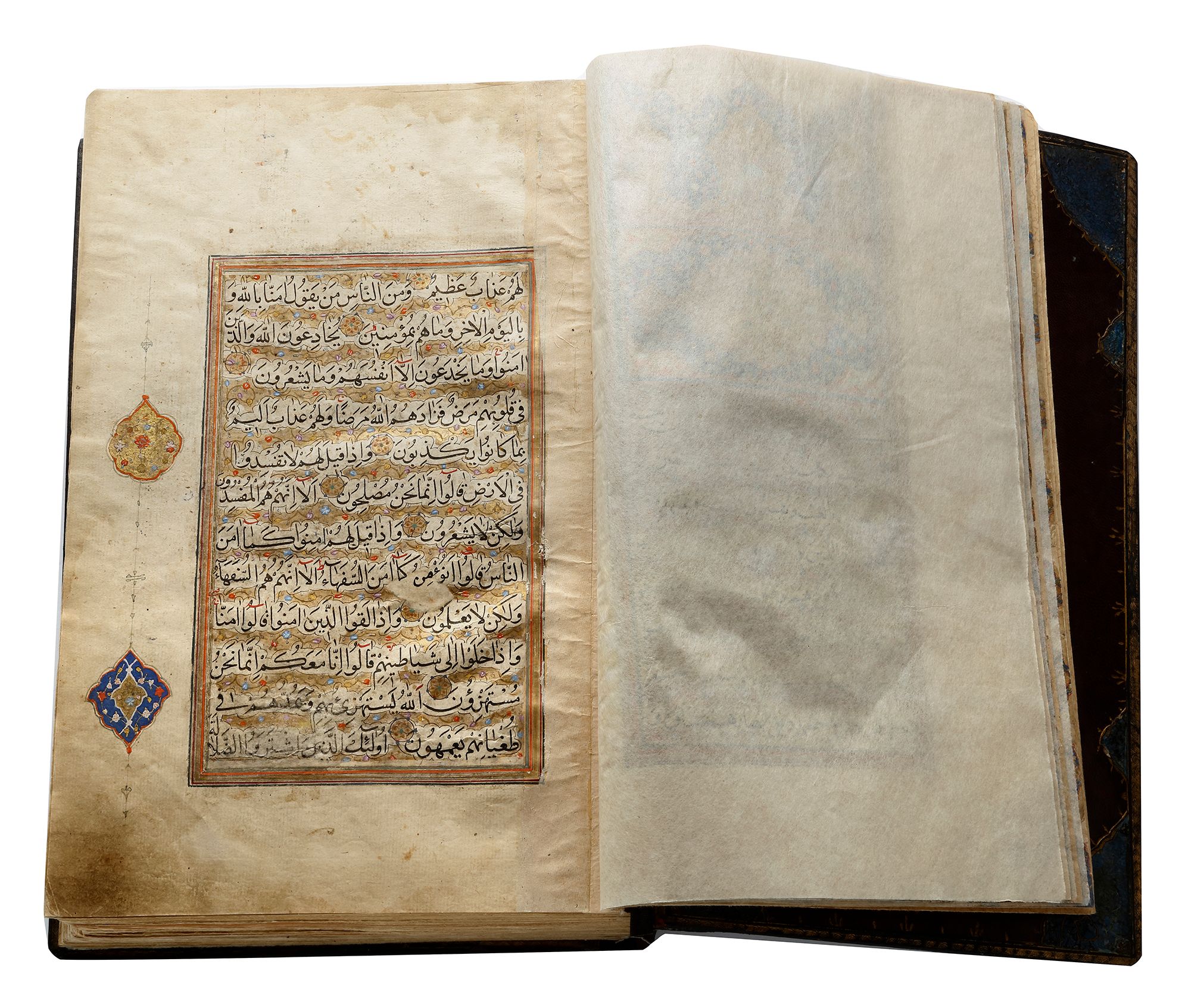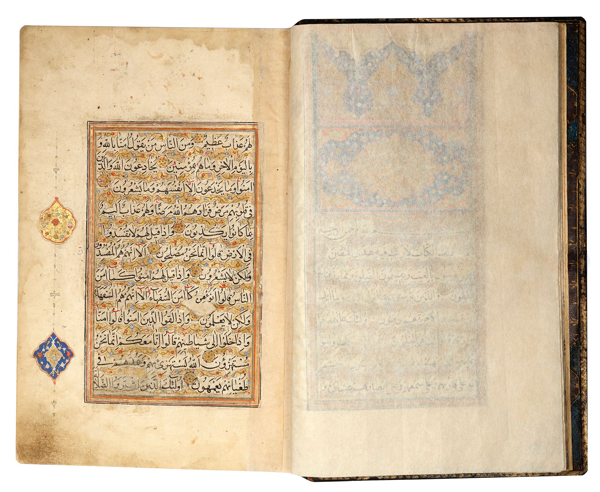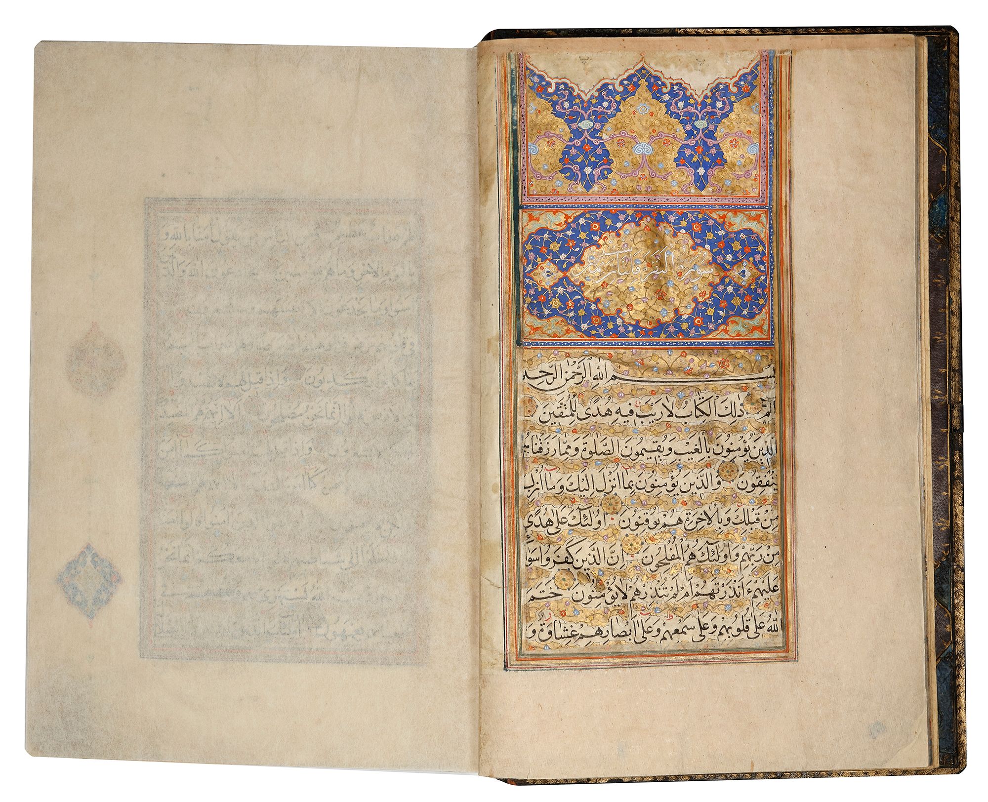 Arabic manuscript on buff paper, 371 pages plus 4 flyleaves, 12 lines to the page, written in black naskh, verses separated by gold and polychrome pointed floral roundels, sura headings in white cursive script against gold ground within cusped cartouches on illuminated panels, some including words in naskh within clouds on reserved ground, margins ruled in colors and gold, catchwords, occasional marginal notes, marginal verse markers in the form of quatrefoil and drop-shaped illuminated medallions, two frontispiece bifolios with fine, full-page illumination in polychrome and gold, the following folio with an illuminated headpiece, two finispiece bifolios with similar full-page illumination, in gilt stamped brown morocco binding, the doublures of brown morocco with fine, cut-out gilt and black scrolling arabesques over blue ground