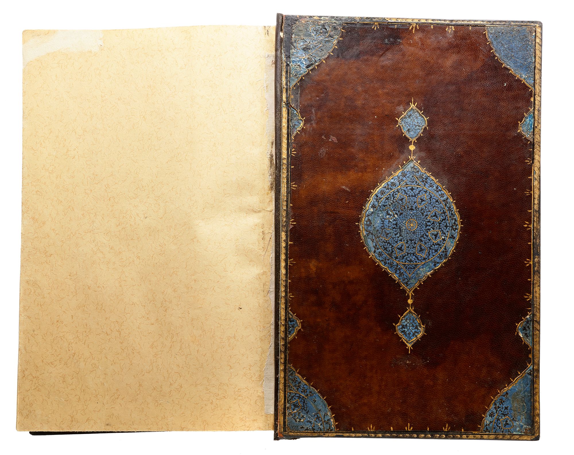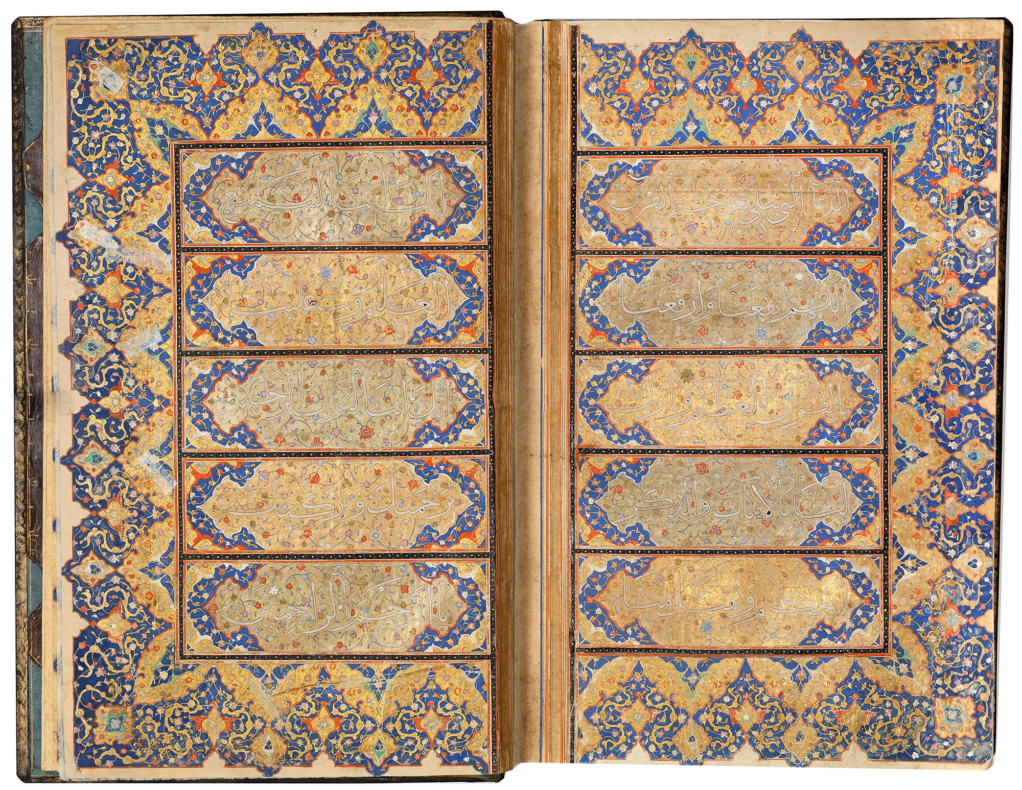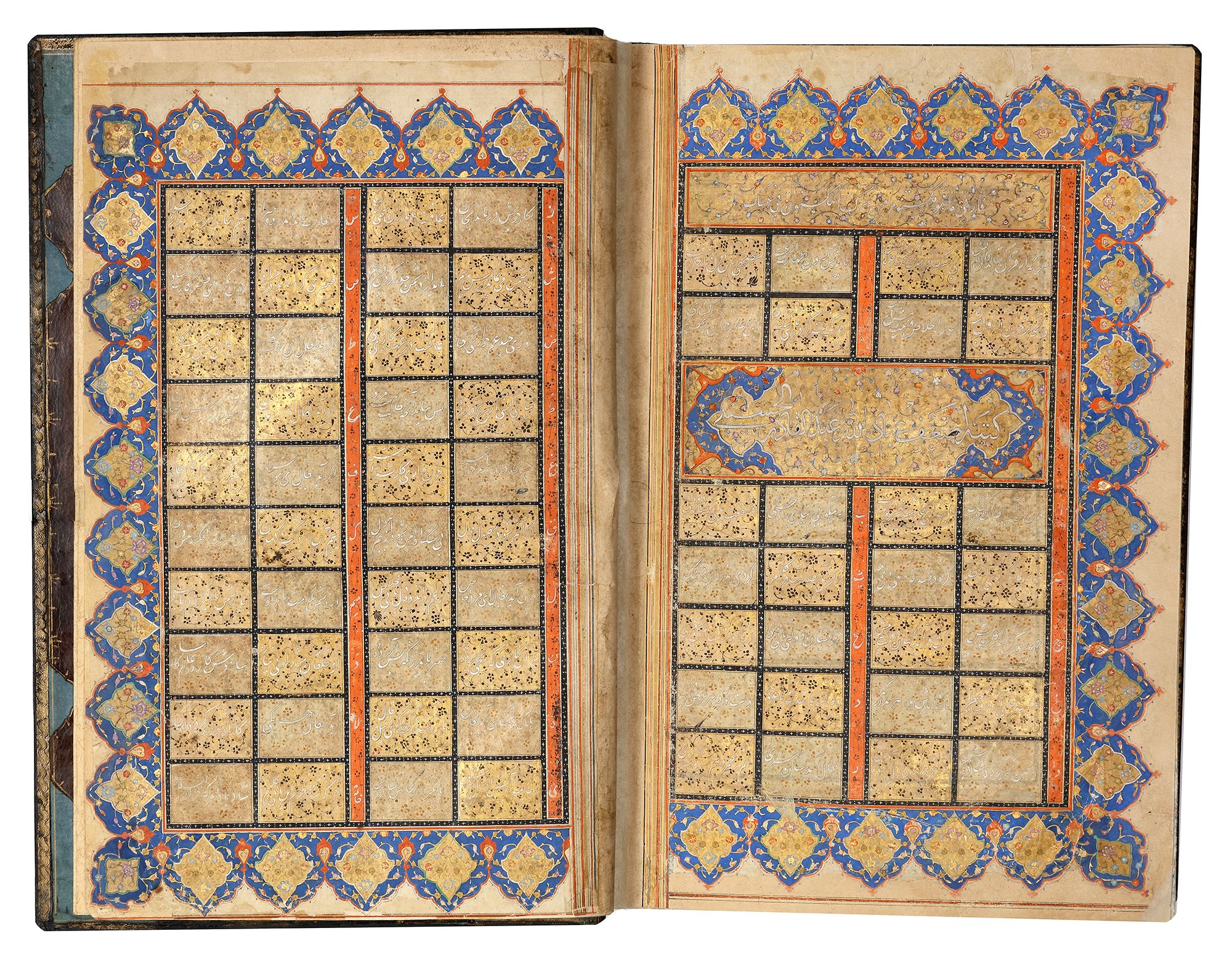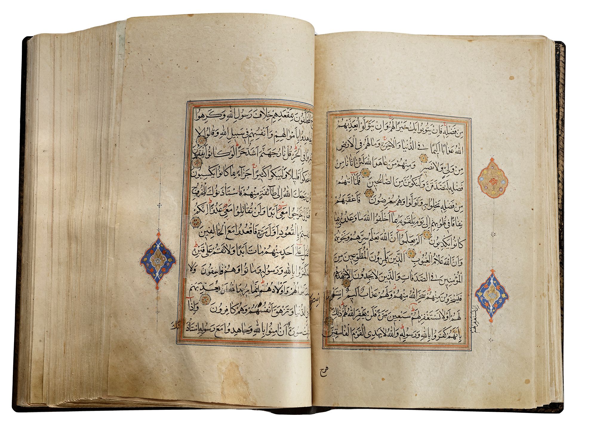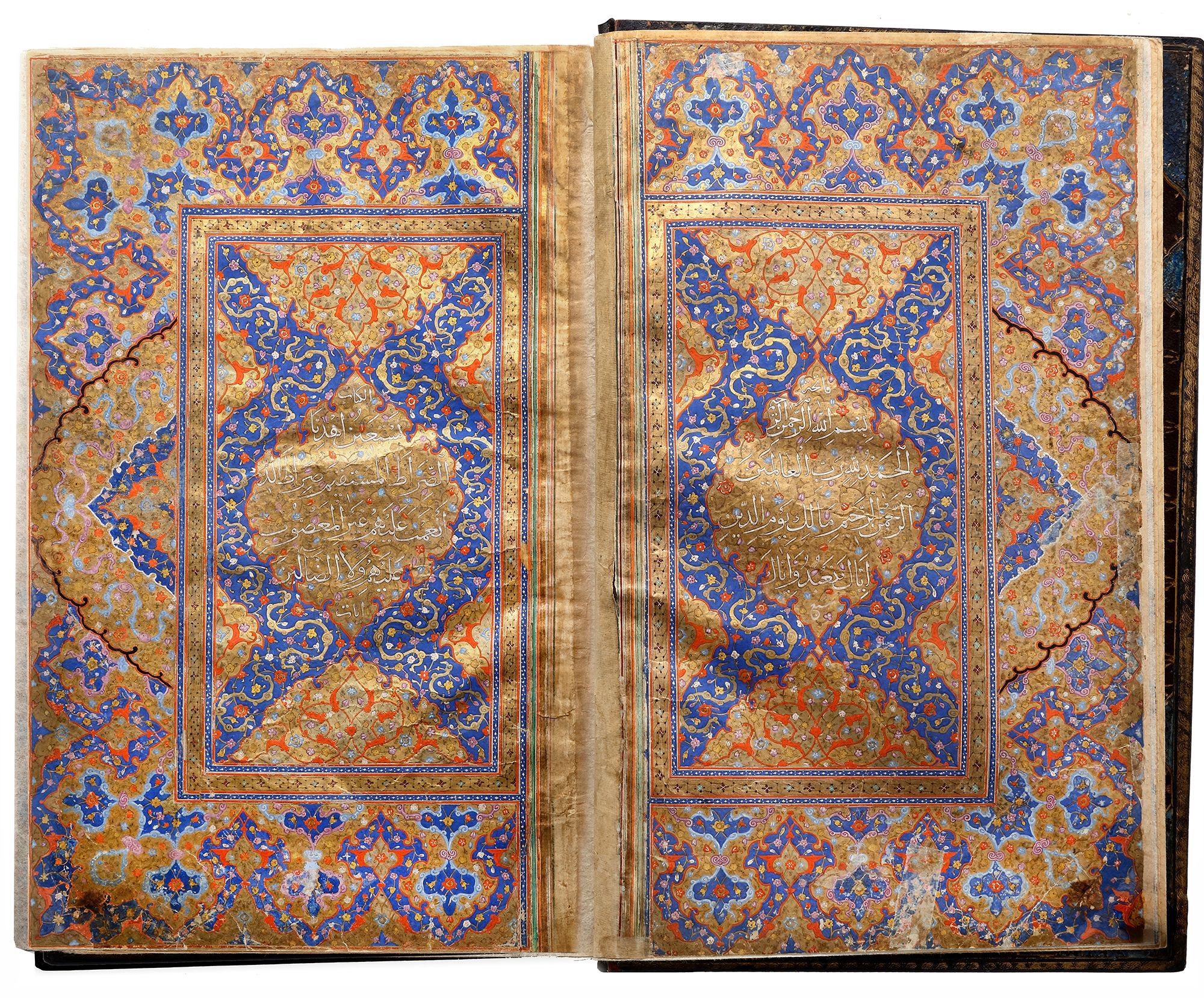 Arabic manuscript on buff paper, 371 pages plus 4 flyleaves, 12 lines to the page, written in black naskh, verses separated by gold and polychrome pointed floral roundels, sura headings in white cursive script against gold ground within cusped cartouches on illuminated panels, some including words in naskh within clouds on reserved ground, margins ruled in colors and gold, catchwords, occasional marginal notes, marginal verse markers in the form of quatrefoil and drop-shaped illuminated medallions, two frontispiece bifolios with fine, full-page illumination in polychrome and gold, the following folio with an illuminated headpiece, two finispiece bifolios with similar full-page illumination, in gilt stamped brown morocco binding, the doublures of brown morocco with fine, cut-out gilt and black scrolling arabesques over blue ground