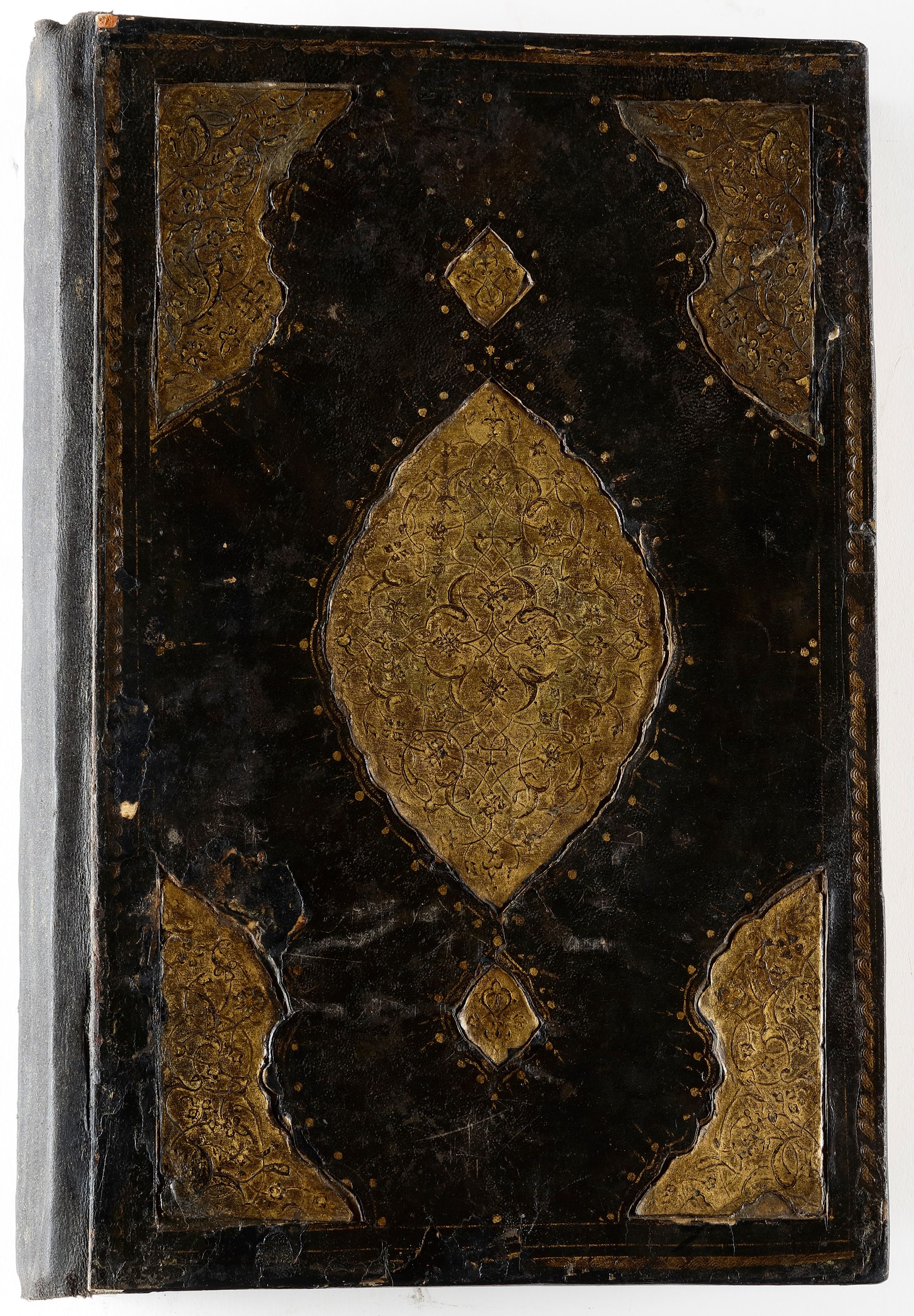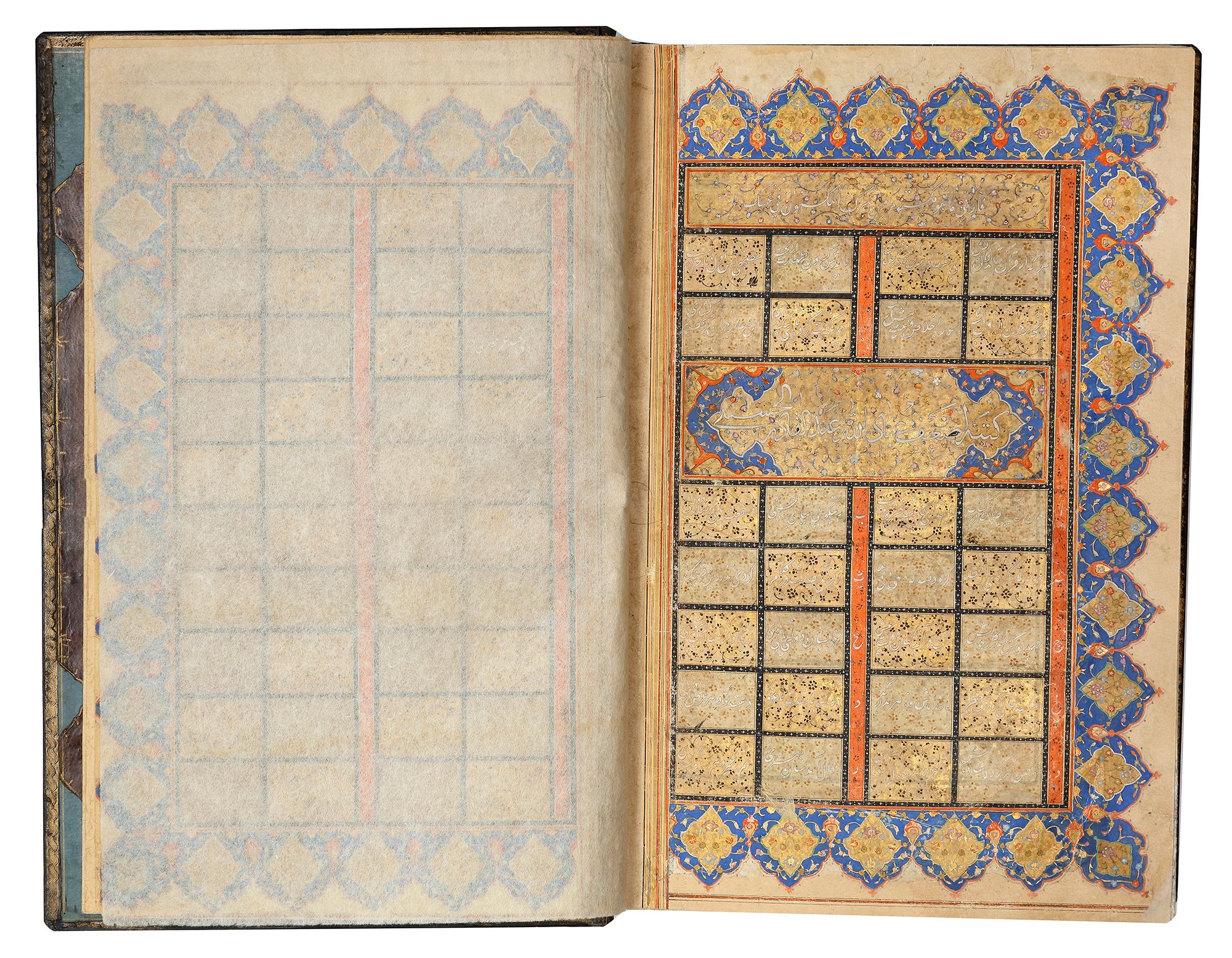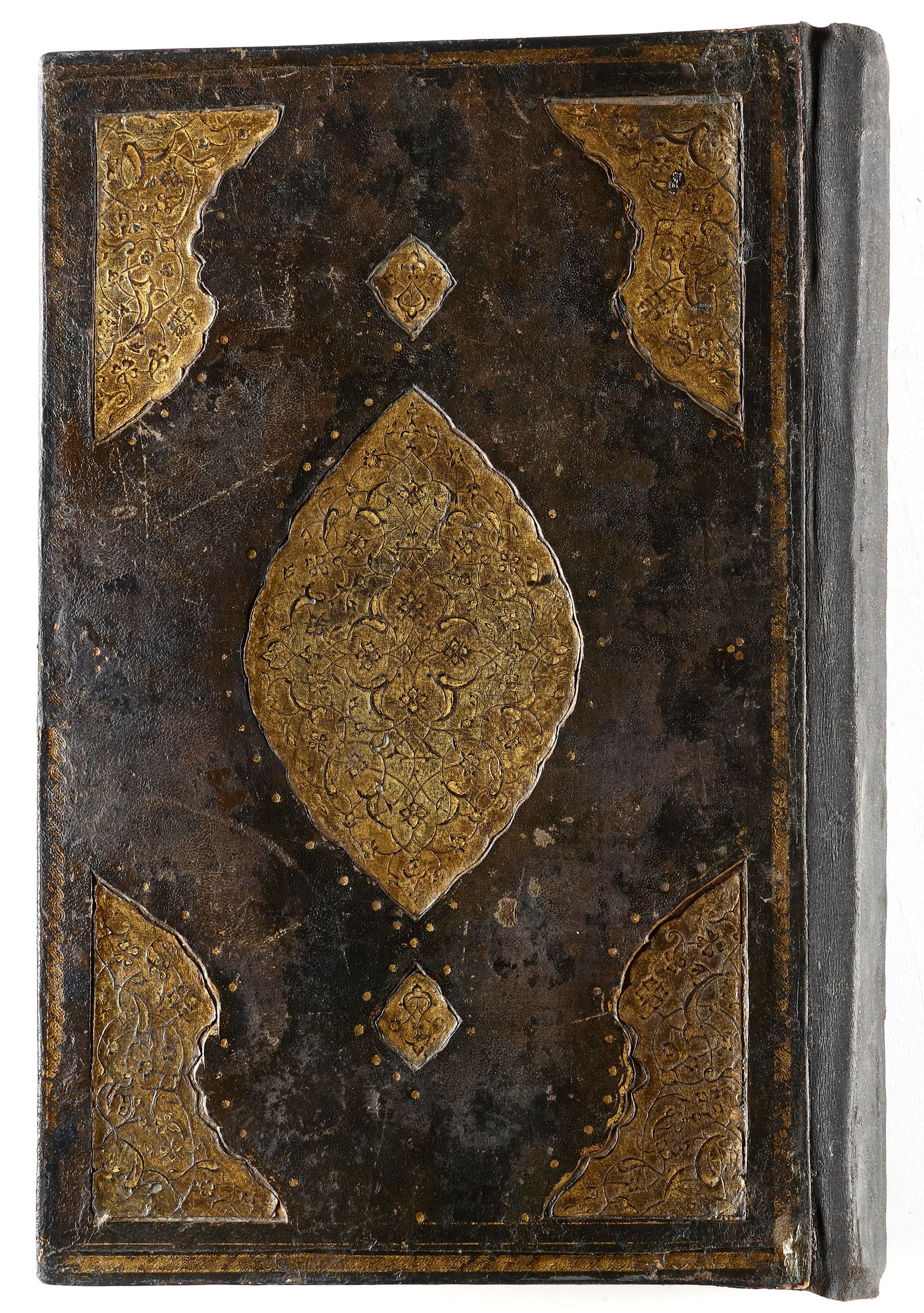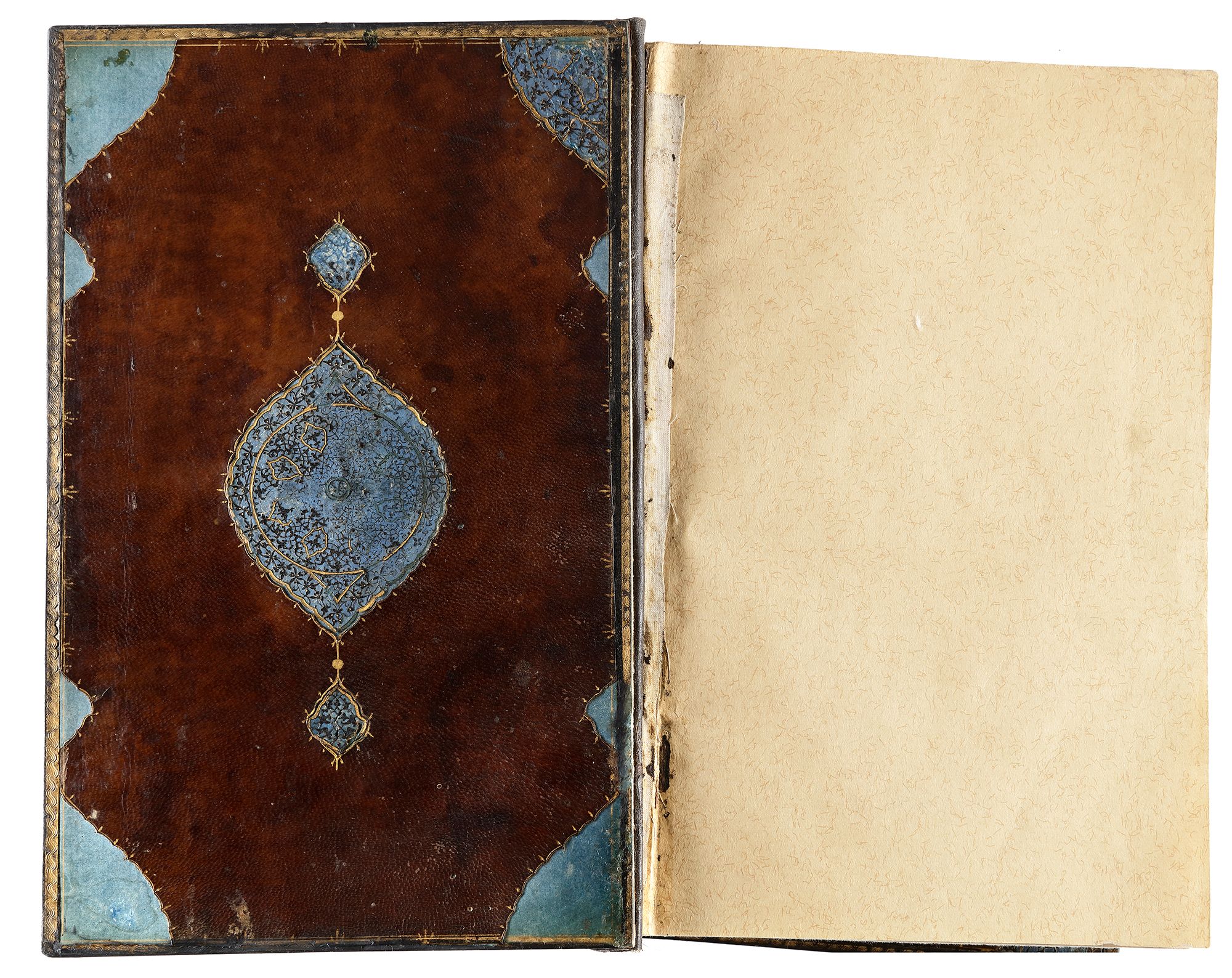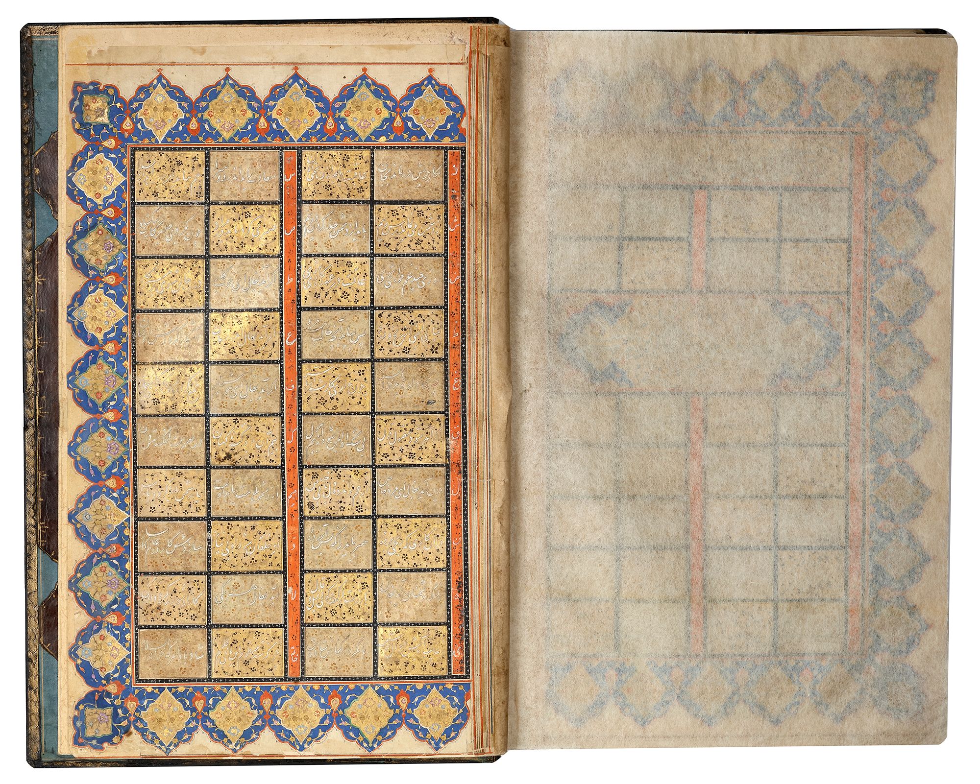Arabic manuscript on buff paper, 371 pages plus 4 flyleaves, 12 lines to the page, written in black naskh, verses separated by gold and polychrome pointed floral roundels, sura headings in white cursive script against gold ground within cusped cartouches on illuminated panels, some including words in naskh within clouds on reserved ground, margins ruled in colors and gold, catchwords, occasional marginal notes, marginal verse markers in the form of quatrefoil and drop-shaped illuminated medallions, two frontispiece bifolios with fine, full-page illumination in polychrome and gold, the following folio with an illuminated headpiece, two finispiece bifolios with similar full-page illumination, in gilt stamped brown morocco binding, the doublures of brown morocco with fine, cut-out gilt and black scrolling arabesques over blue ground