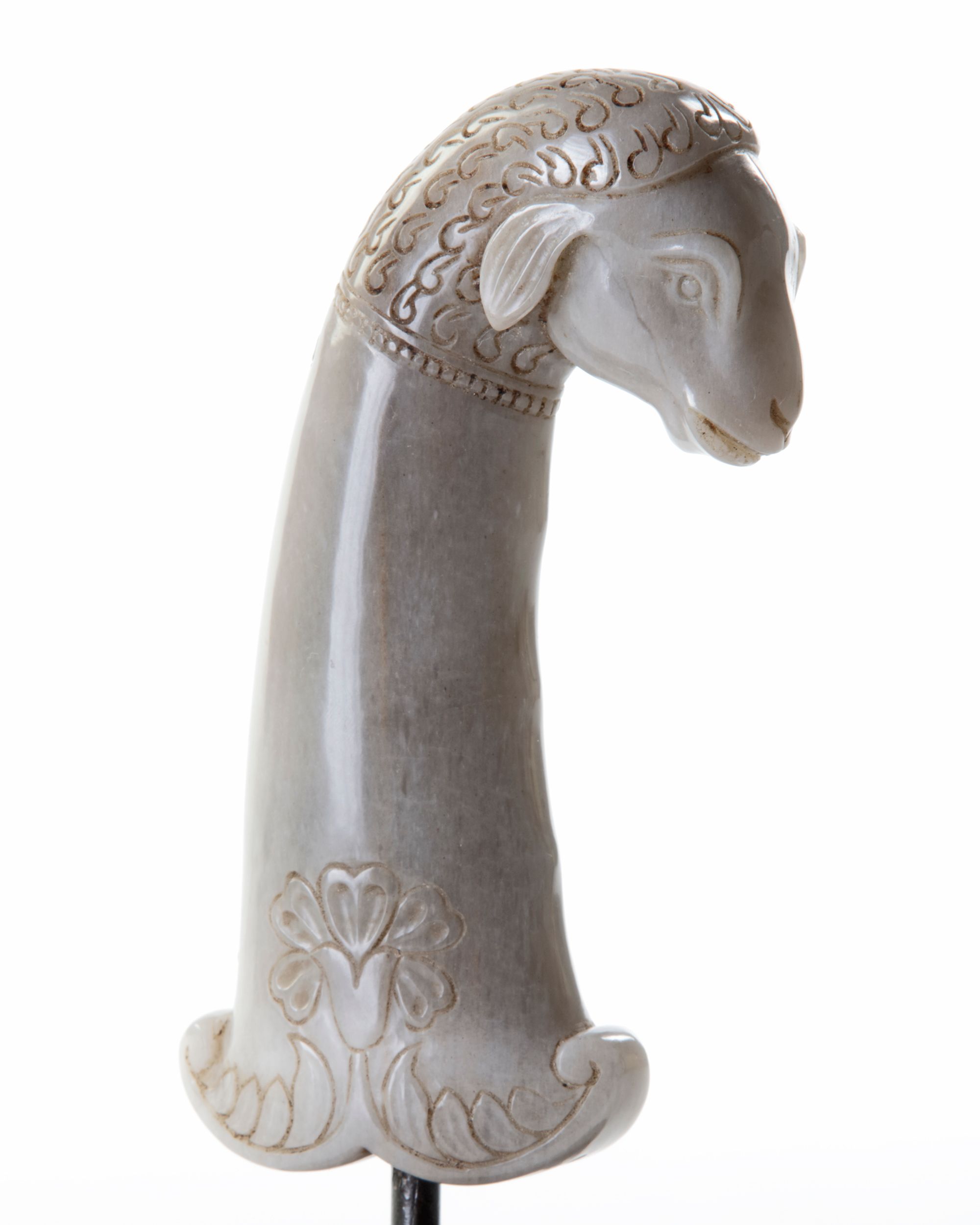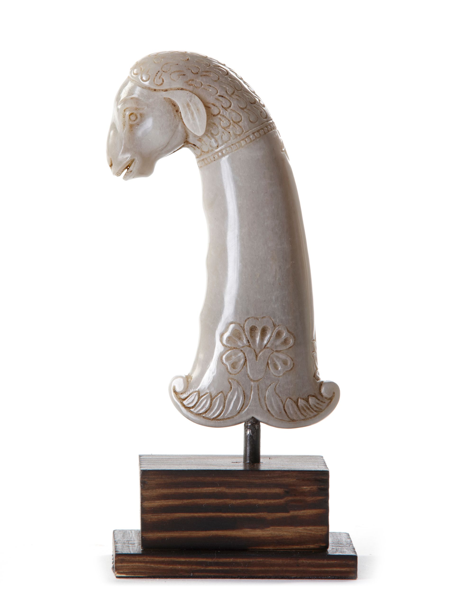 The jade hilt of pistol grip form carved with flowers and foliage on each face rising to a sheep shaped pommel. 14 cm.