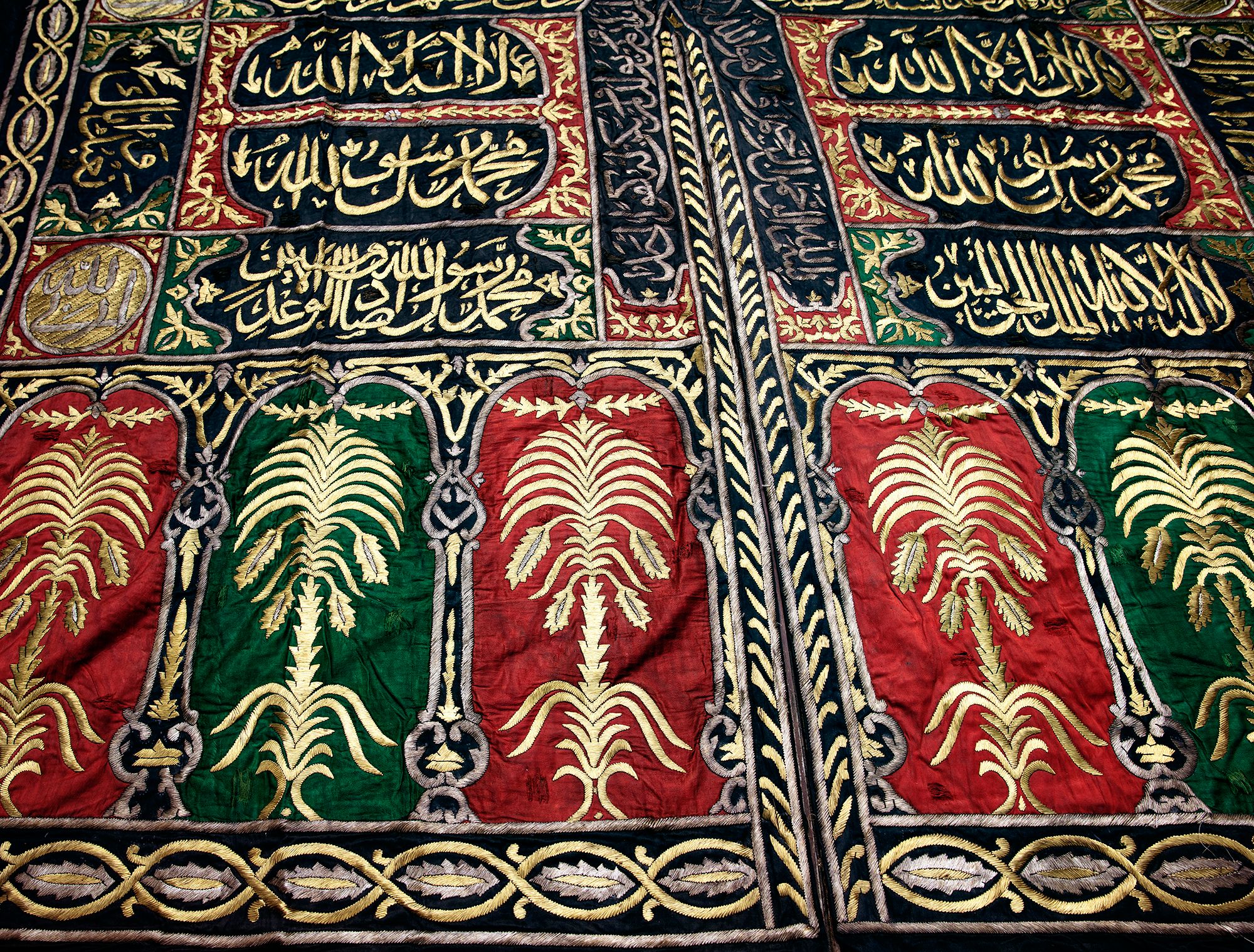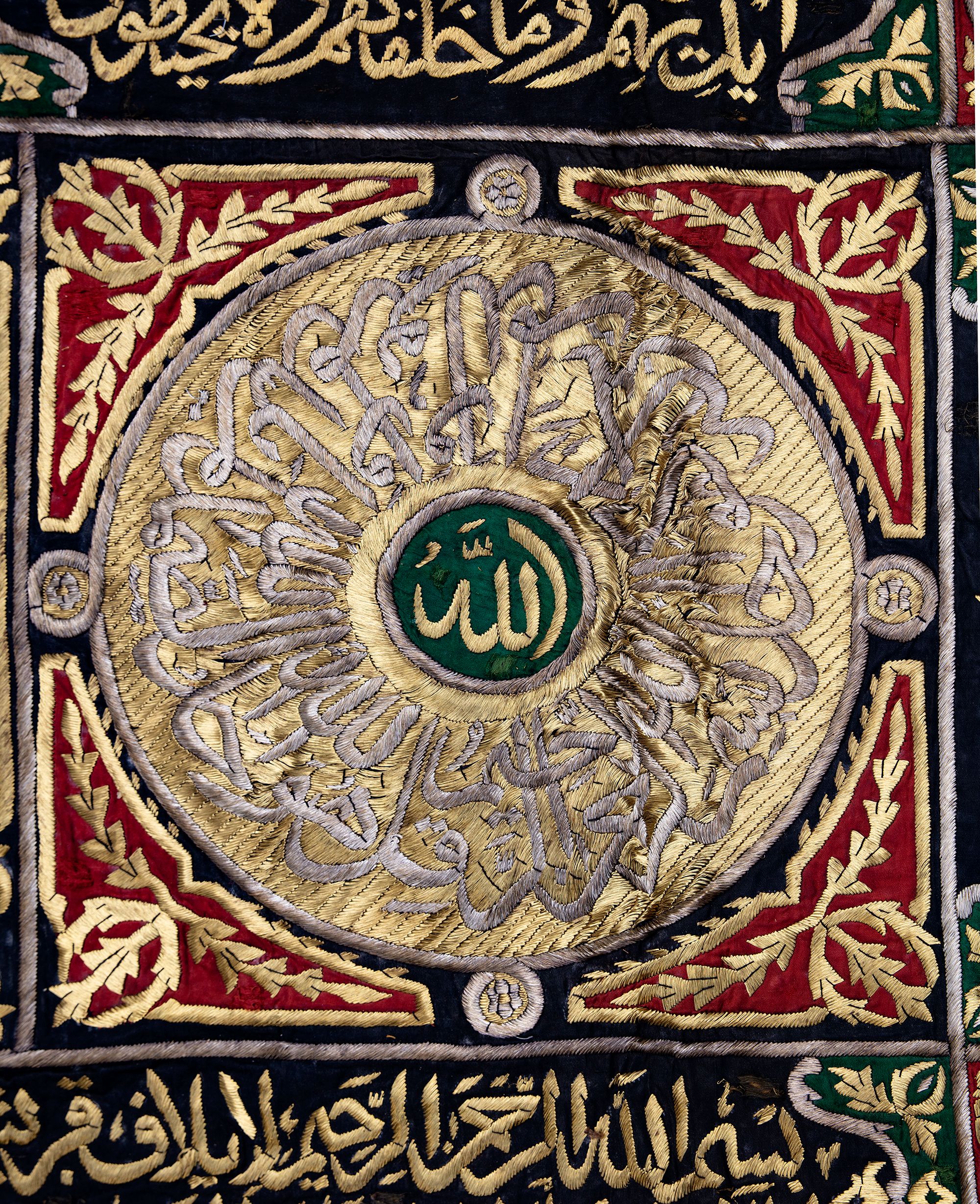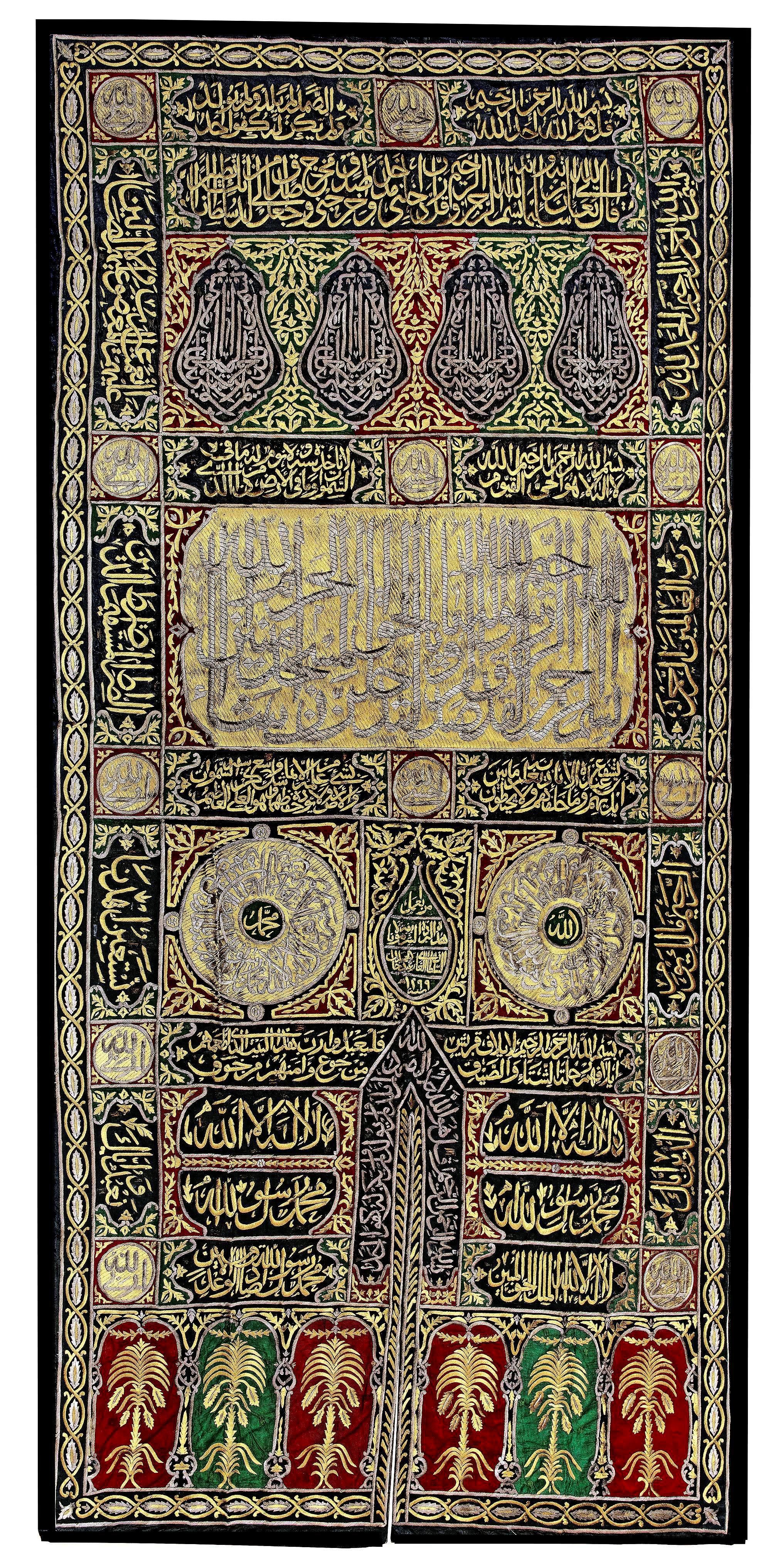 Of rectangular form, embroidered in silver and silver-gilt thread over a black silk ground, the surface broken into cartouches of various shapes and sizes containing inscriptions in naskh and thuluth, the interstices filled with vegetal designs, a large silver inscription halfway up on cream ground, four cartouches above containing mirrored calligraphic inscriptions below three roundels, one drop-shaped and containing the name of the sultan and date in gilt thread on green ground, flanked by one with name of Allah and another with the name of Muhammad, each surrounded by radial inscription in silver thread, beneath the central one an opening with calligraphic border, at the base a frieze of palm trees, the silver thread slightly oxidized, small tears in the silk, conserved, sleeve for hanging attached at top, rebacked