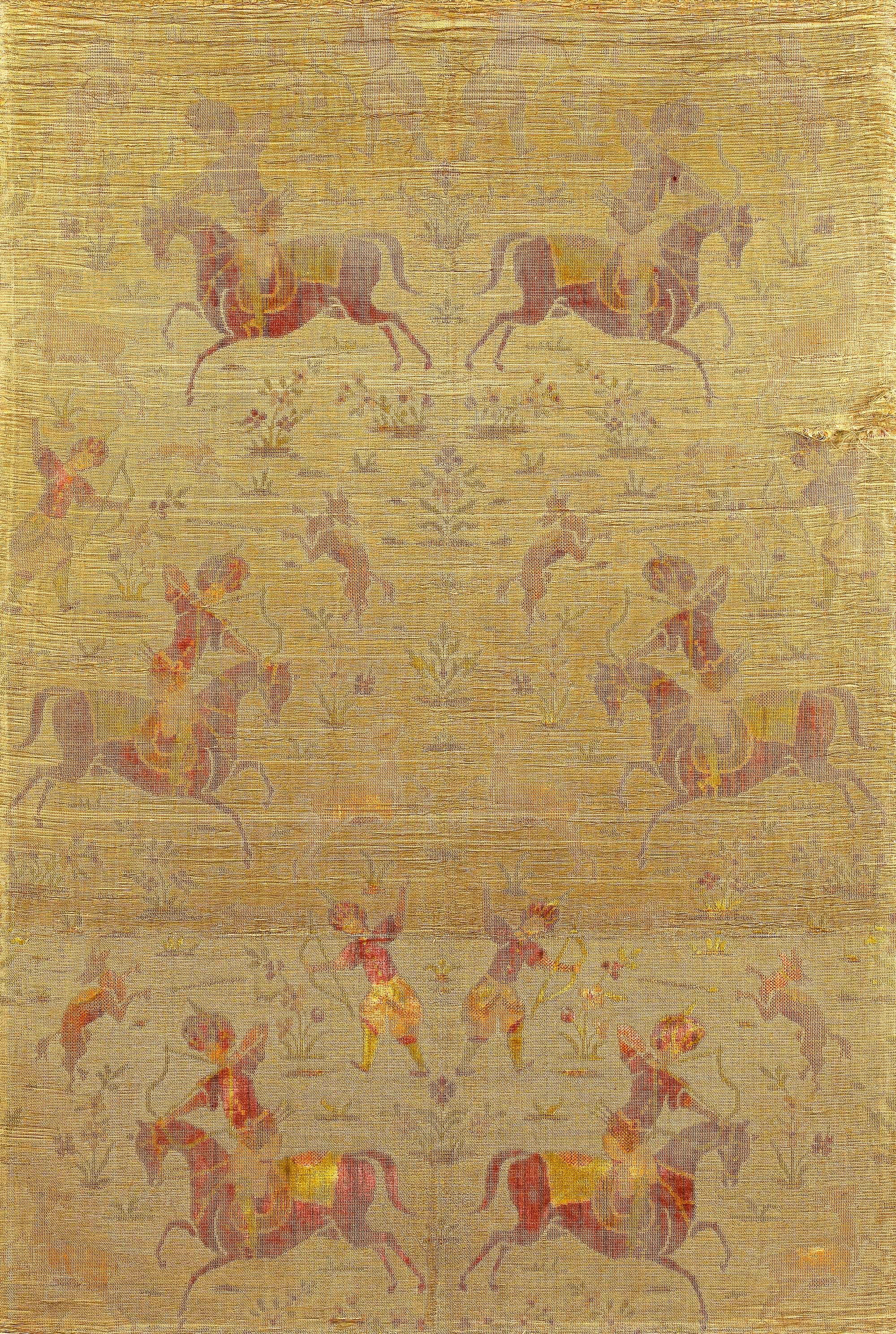 Of rectangular form, embroidered in colorful silk and silver threads over an light brown coloured ground with six horsemen in a hunting scene, amongst small trees and floral motifs.