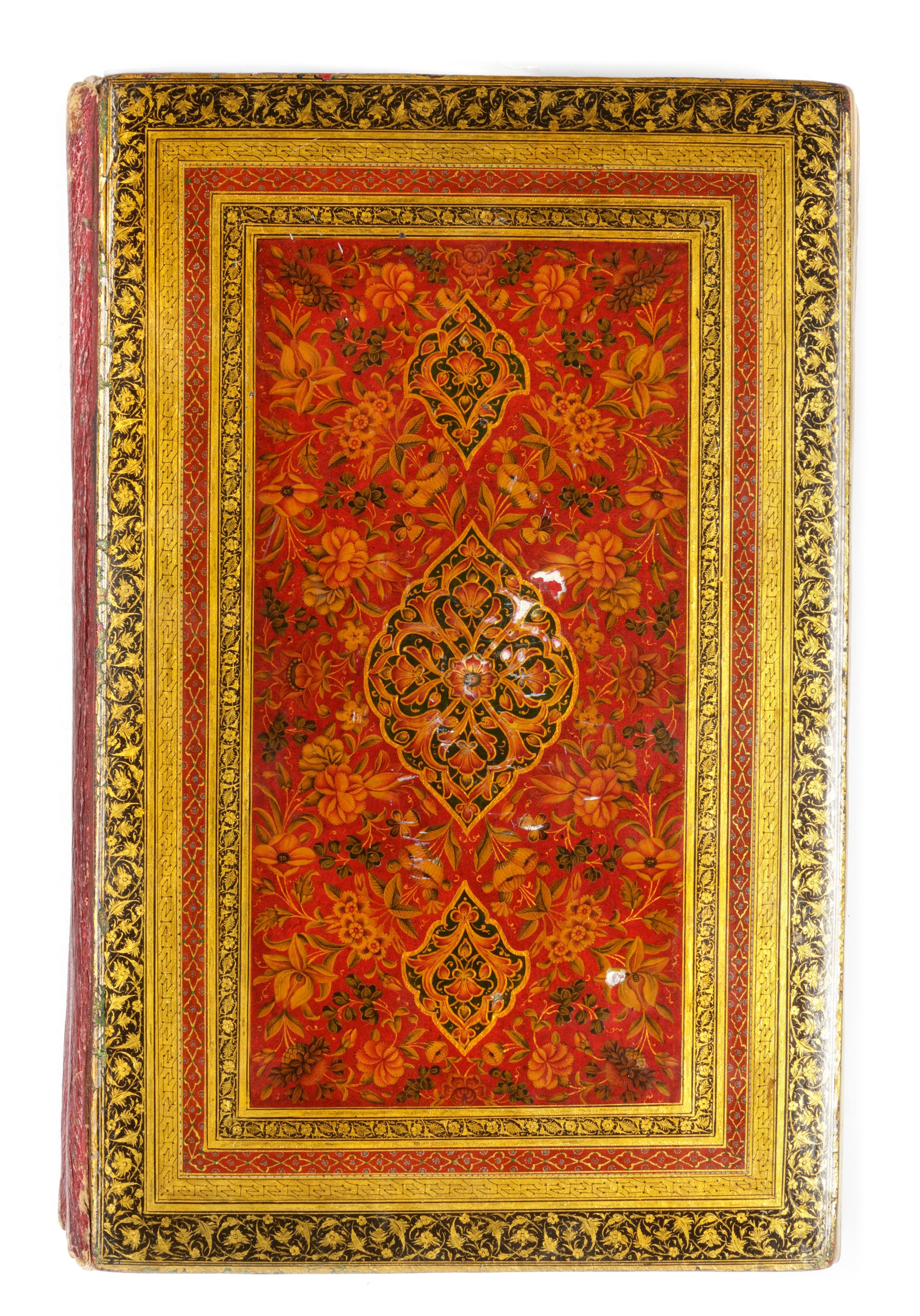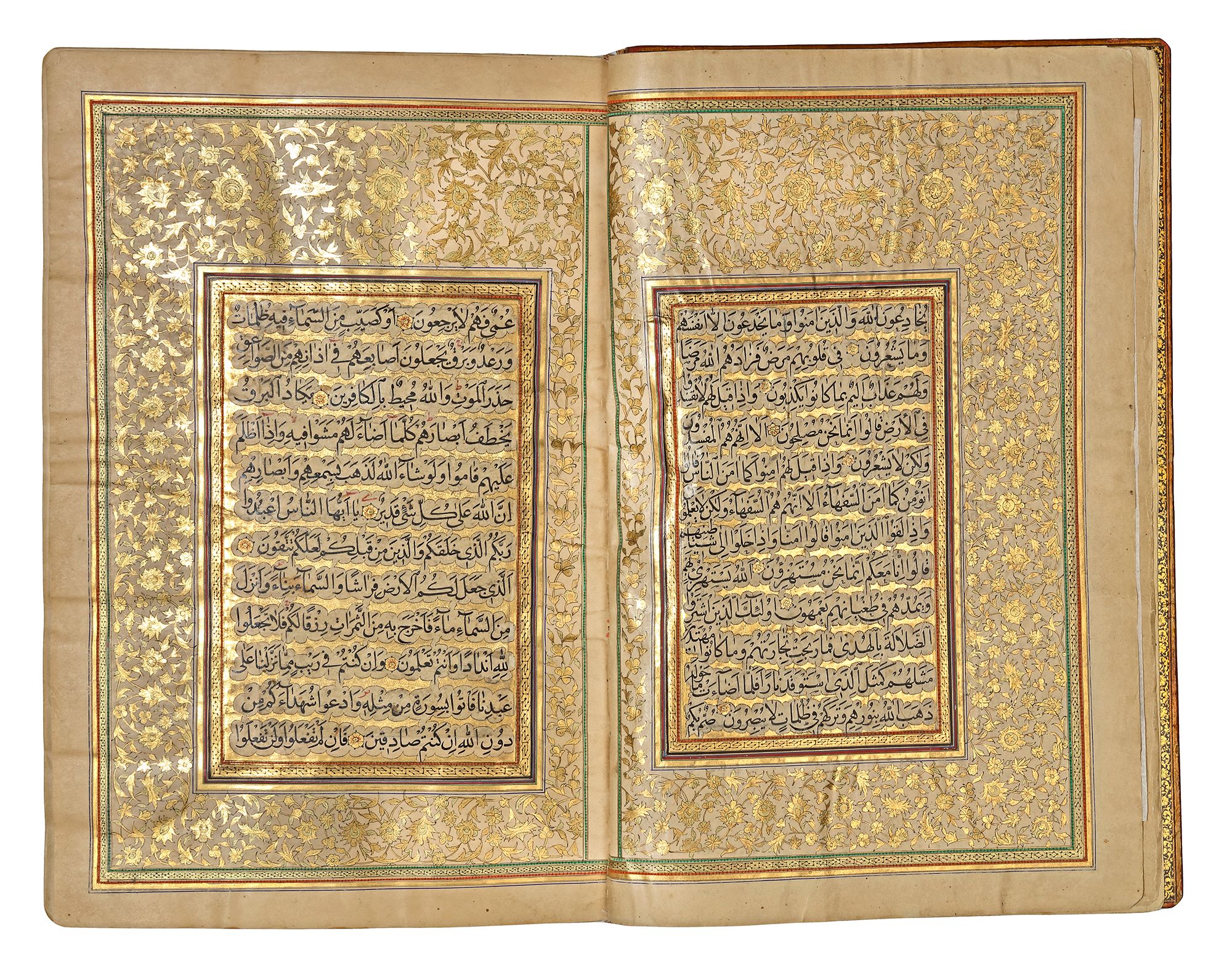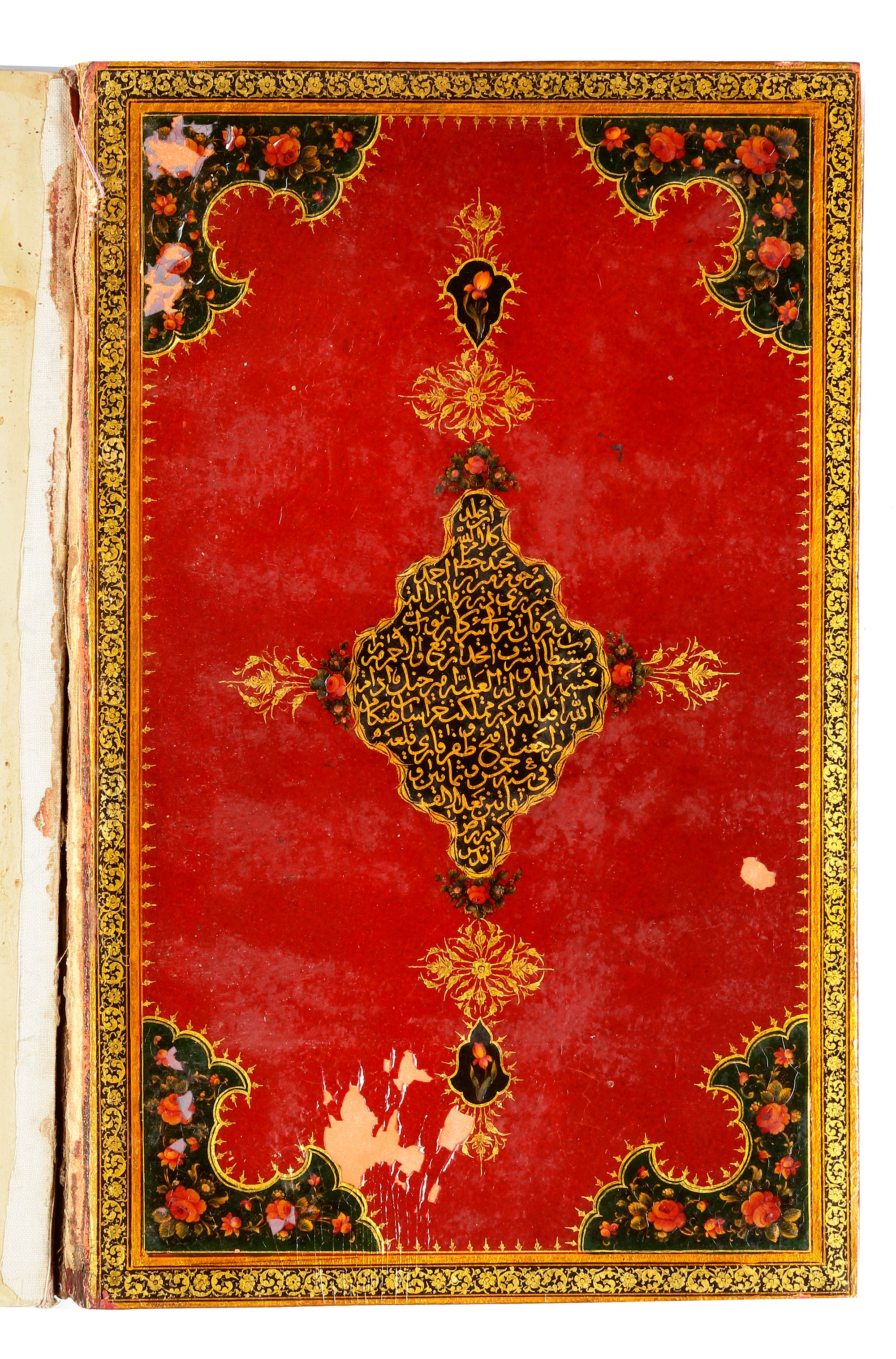 An Arabic manuscript on paper, 388 folios, plus 2 flyleaves, 12 lines to a page, written in naskh in black ink, ruled in blue, gold, and red, the external Qajar margins lavishly illuminated with polychrome and gold interlacing scrolls and flowers, verses separated by gold dotted rosettes, surah headings in blue cursive against a gold ground within polychrome cartouches, gold and polychrome verse markers in the margins. List of surahs in red or gold each within geometric against gold and blue ground shapes, around the double-page spread of illumination consisting of a central lobed panel with gold naskh against a red ground, followed by two pages with a polychrome and gold incipit frame, the last page bearing the colophon. A red backed lacquer boards, the outer boards richly decorated with red and yellow flowers and foliage with gold frames or boarders, the inner boards decorated with a central panel within several floral borders.