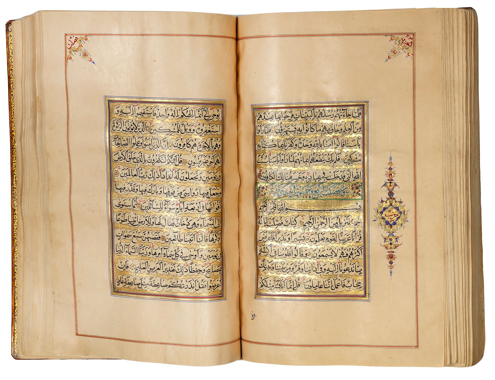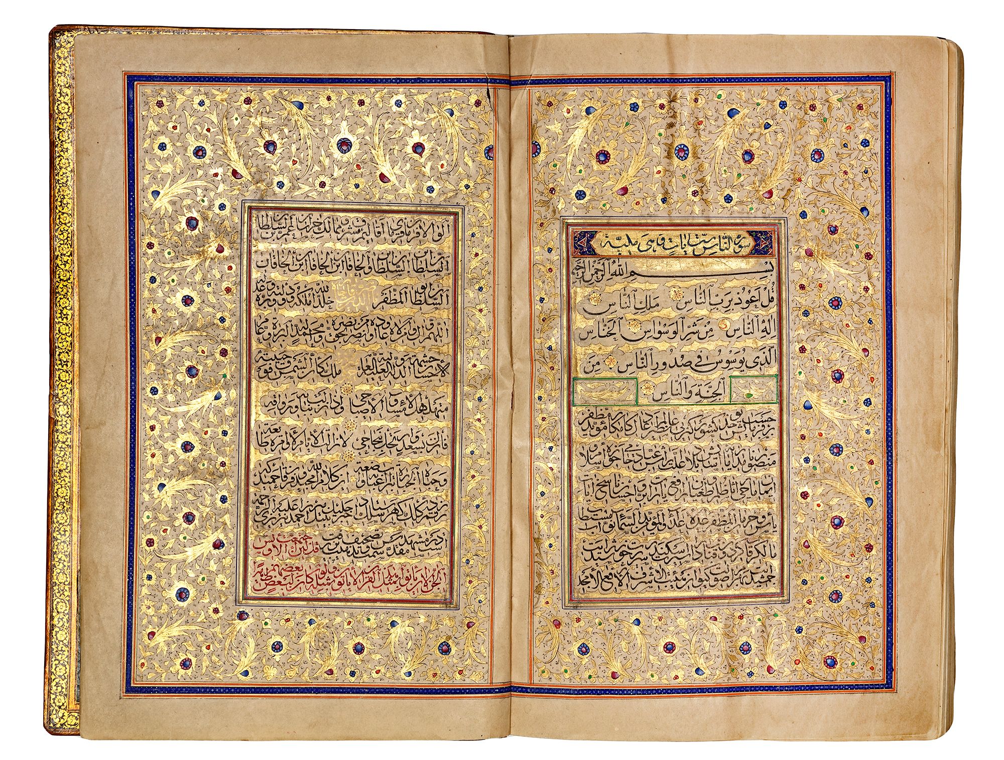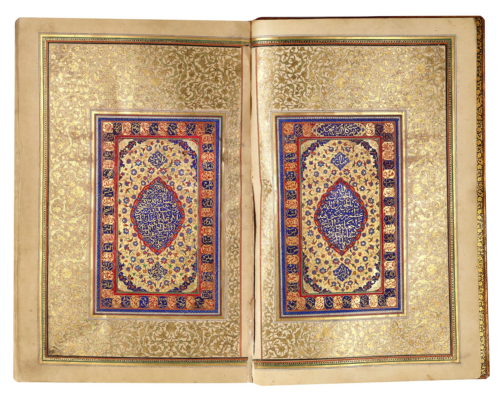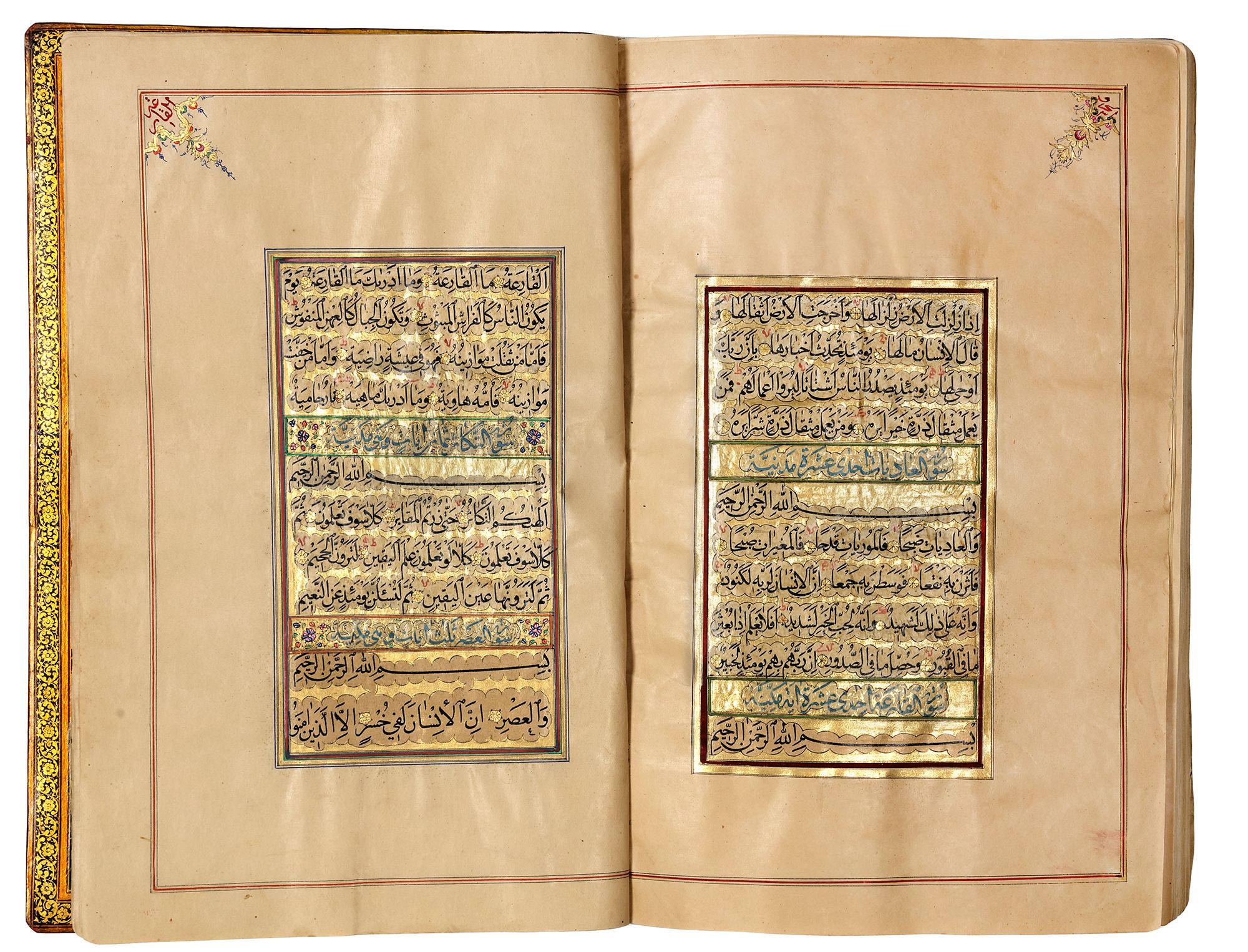 An Arabic manuscript on paper, 388 folios, plus 2 flyleaves, 12 lines to a page, written in naskh in black ink, ruled in blue, gold, and red, the external Qajar margins lavishly illuminated with polychrome and gold interlacing scrolls and flowers, verses separated by gold dotted rosettes, surah headings in blue cursive against a gold ground within polychrome cartouches, gold and polychrome verse markers in the margins. List of surahs in red or gold each within geometric against gold and blue ground shapes, around the double-page spread of illumination consisting of a central lobed panel with gold naskh against a red ground, followed by two pages with a polychrome and gold incipit frame, the last page bearing the colophon. A red backed lacquer boards, the outer boards richly decorated with red and yellow flowers and foliage with gold frames or boarders, the inner boards decorated with a central panel within several floral borders.